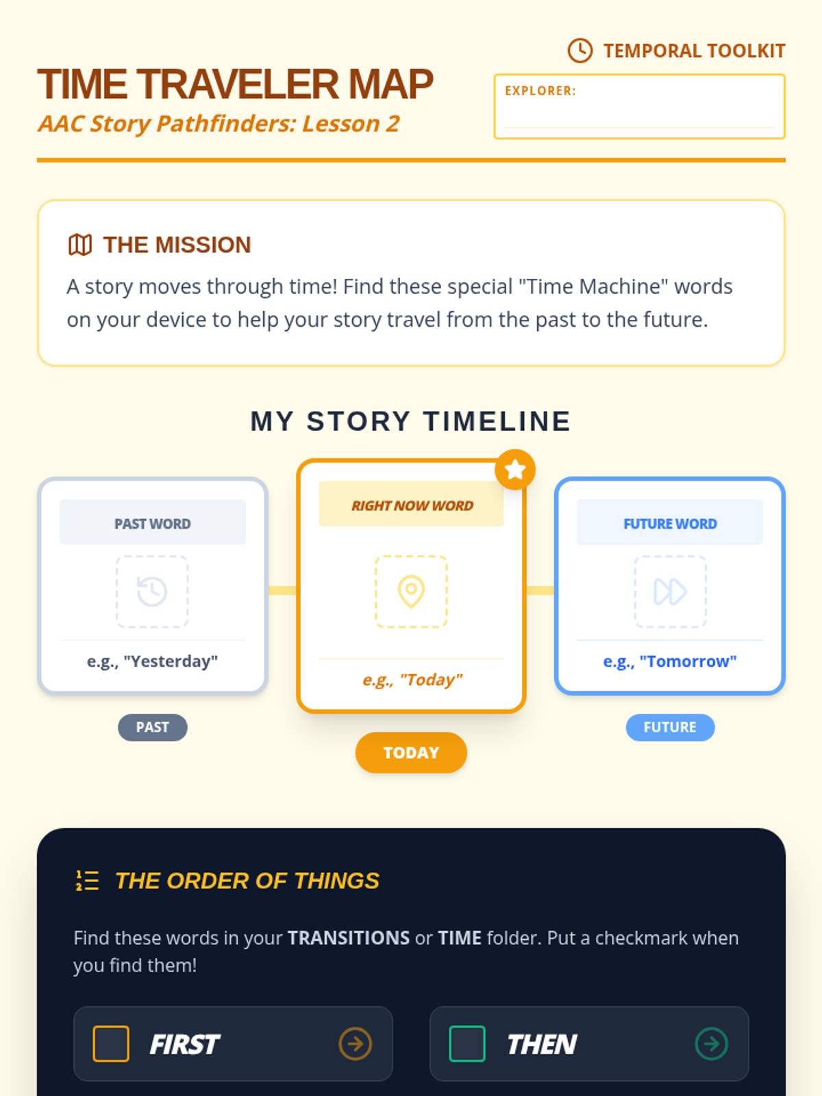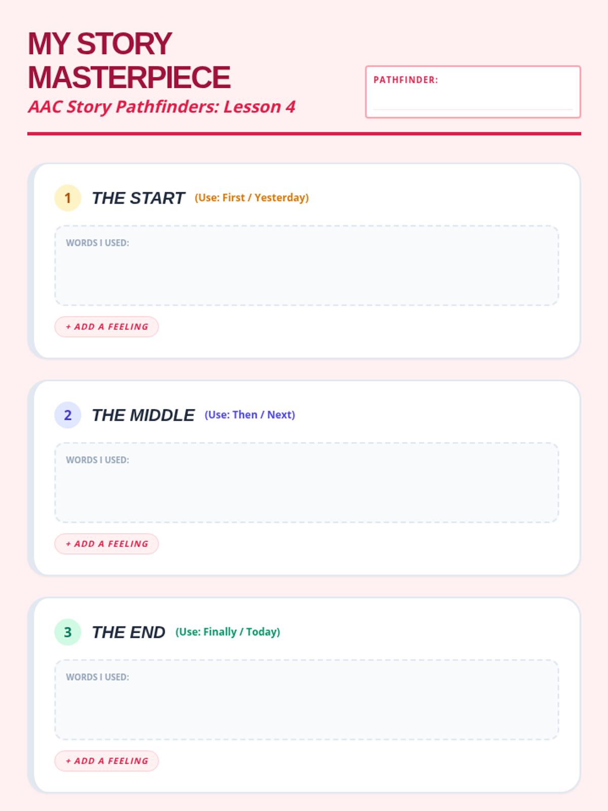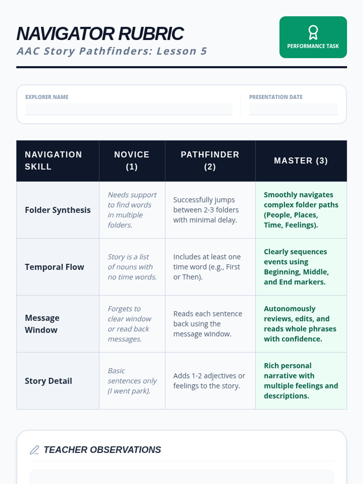 A project-based sequence for 4th-grade AAC users focused on multi-folder navigation and narrative construction. Students learn to synthesize vocabulary from various device categories (People, Places, Time, Feelings) to tell their own personal stories.