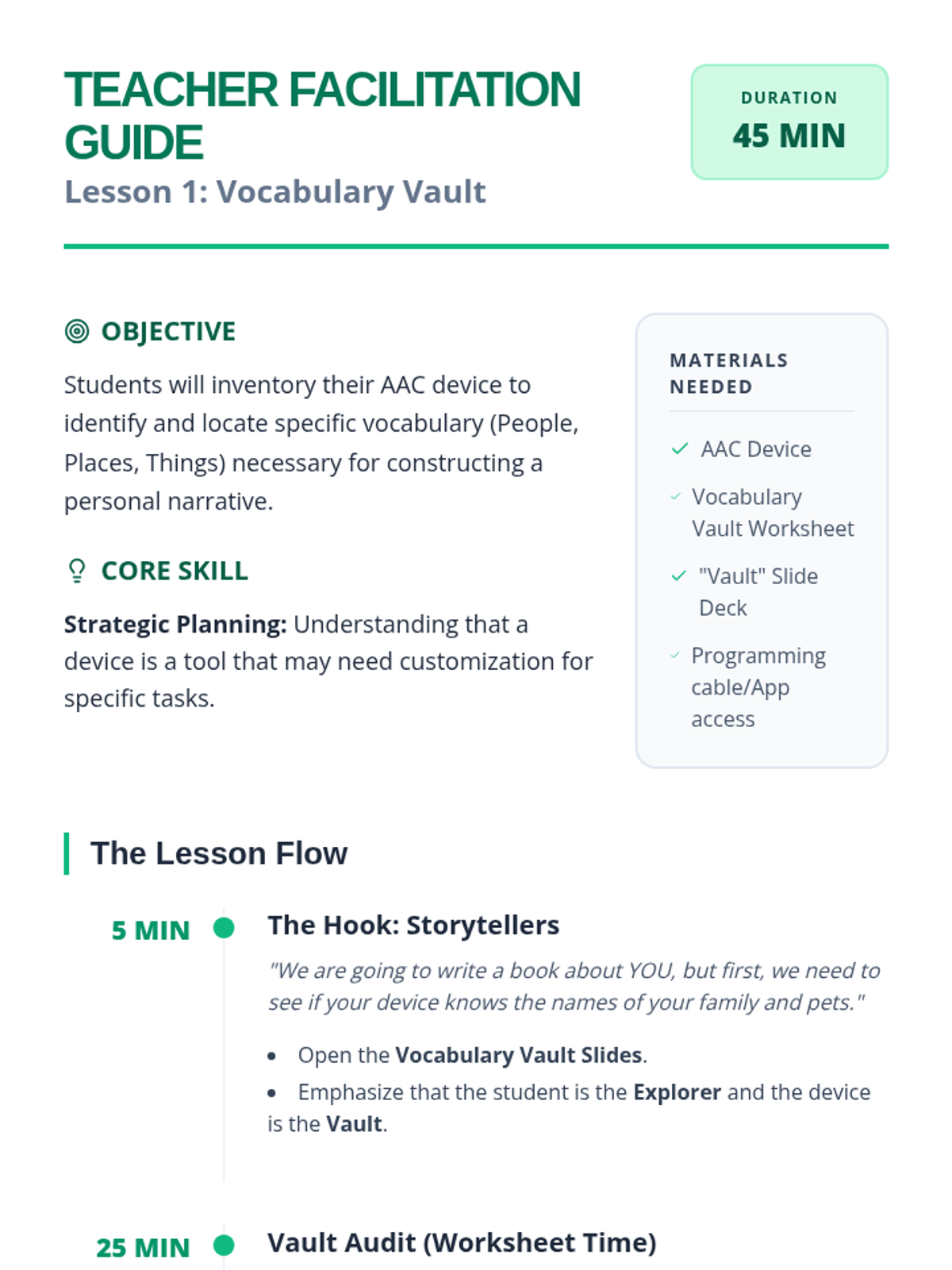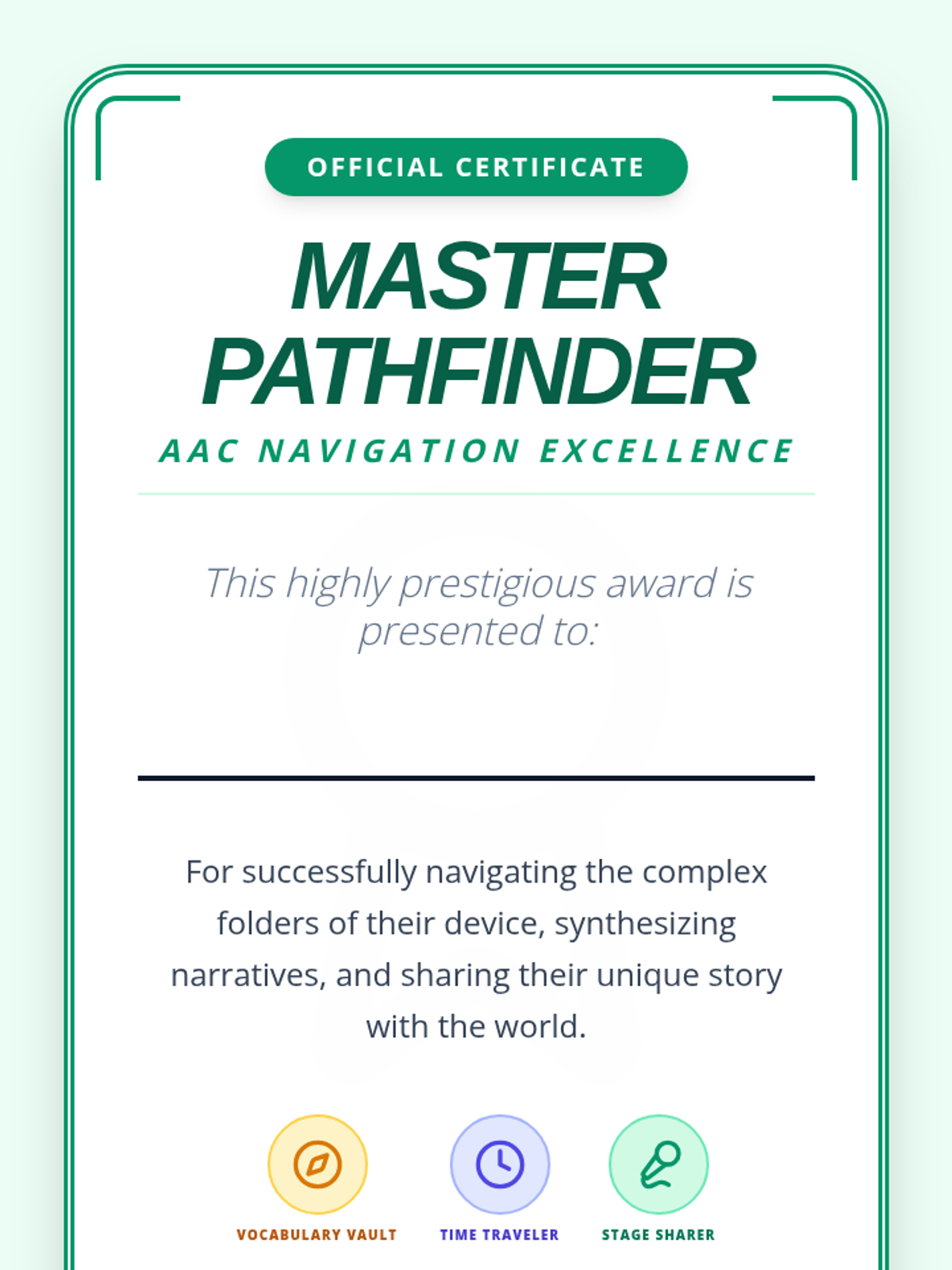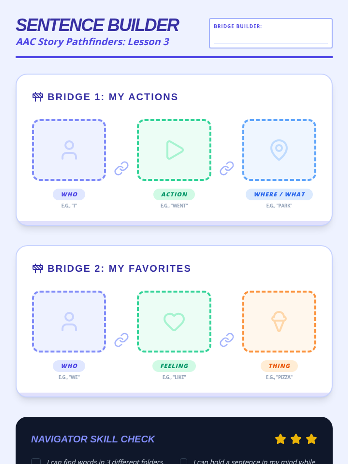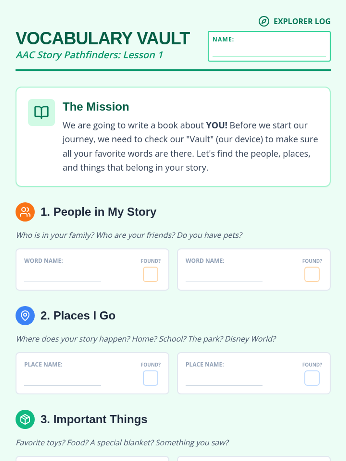 A project-based sequence for 4th-grade AAC users focused on multi-folder navigation and narrative construction. Students learn to synthesize vocabulary from various device categories (People, Places, Time, Feelings) to tell their own personal stories.