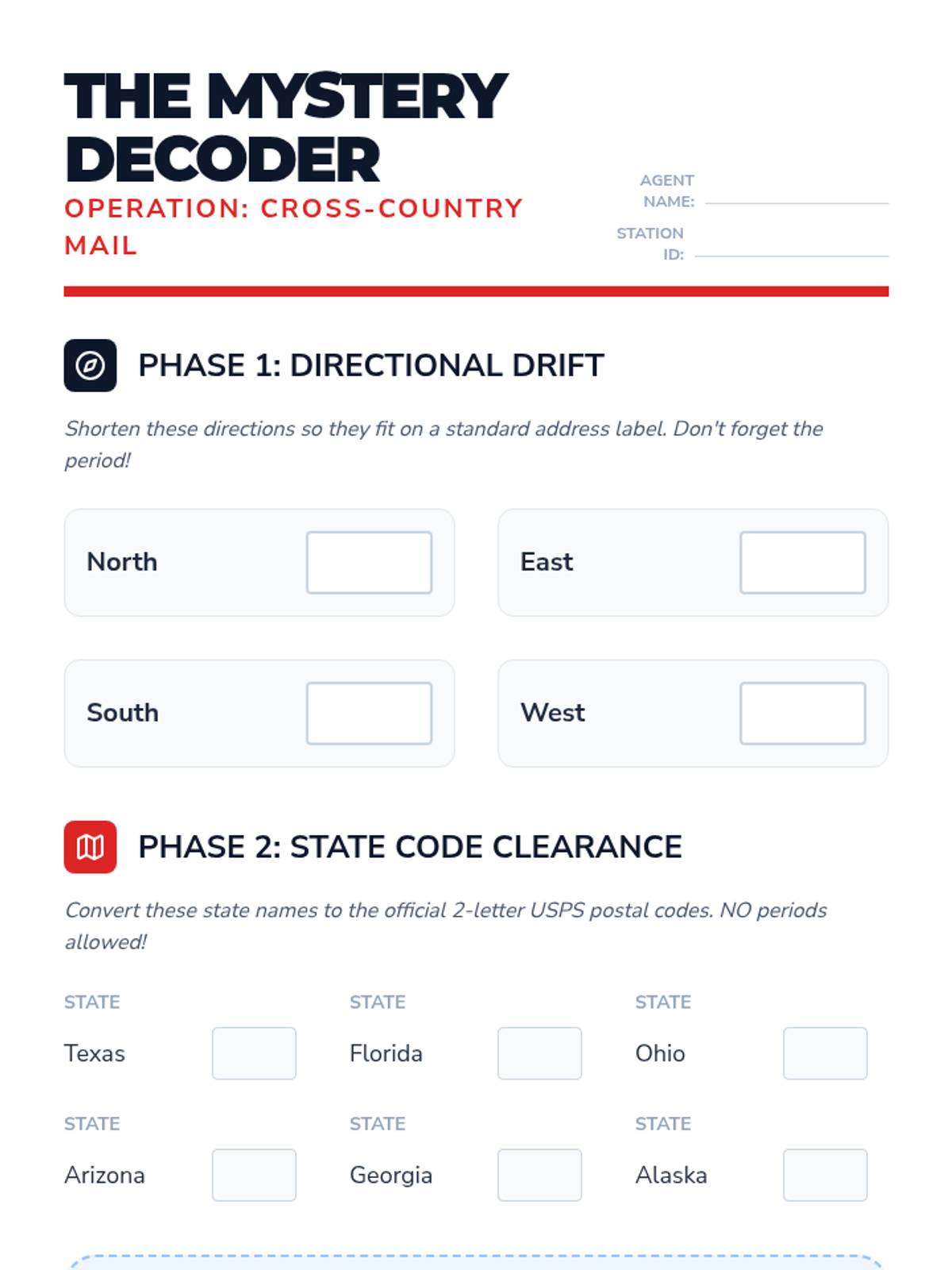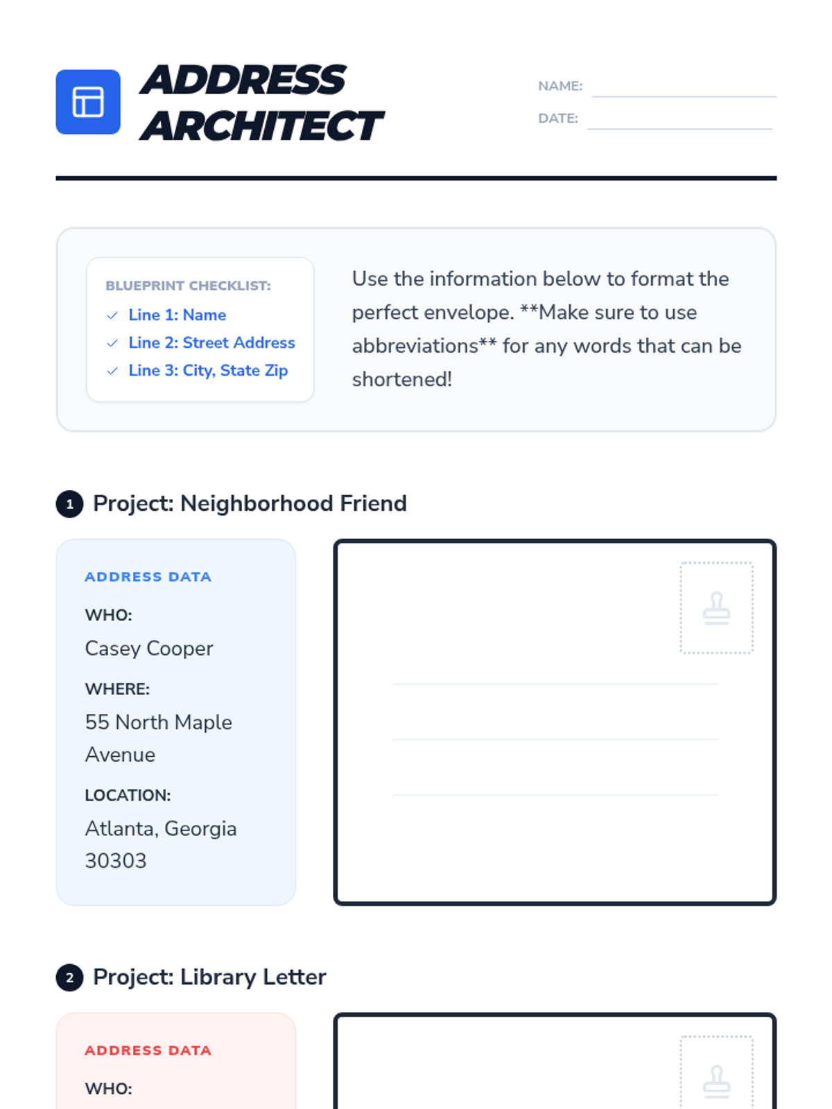 A 3rd-grade grammar sequence focusing on the use of abbreviations in addresses and formal correspondence. Students transition from identifying street suffixes to managing state codes and directional indicators, culminating in a classroom post office simulation.
