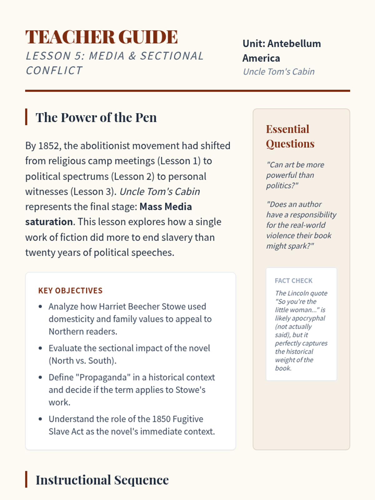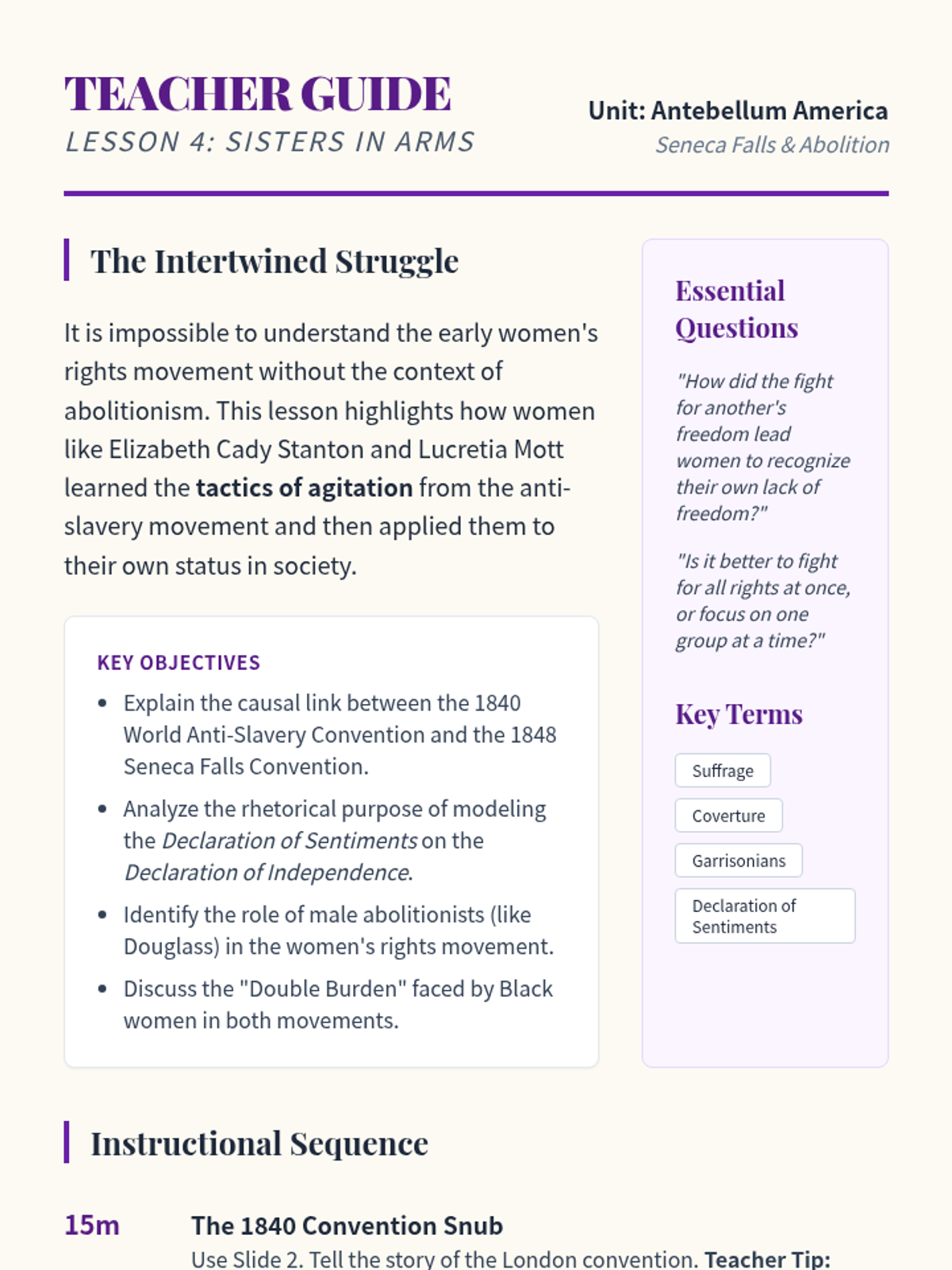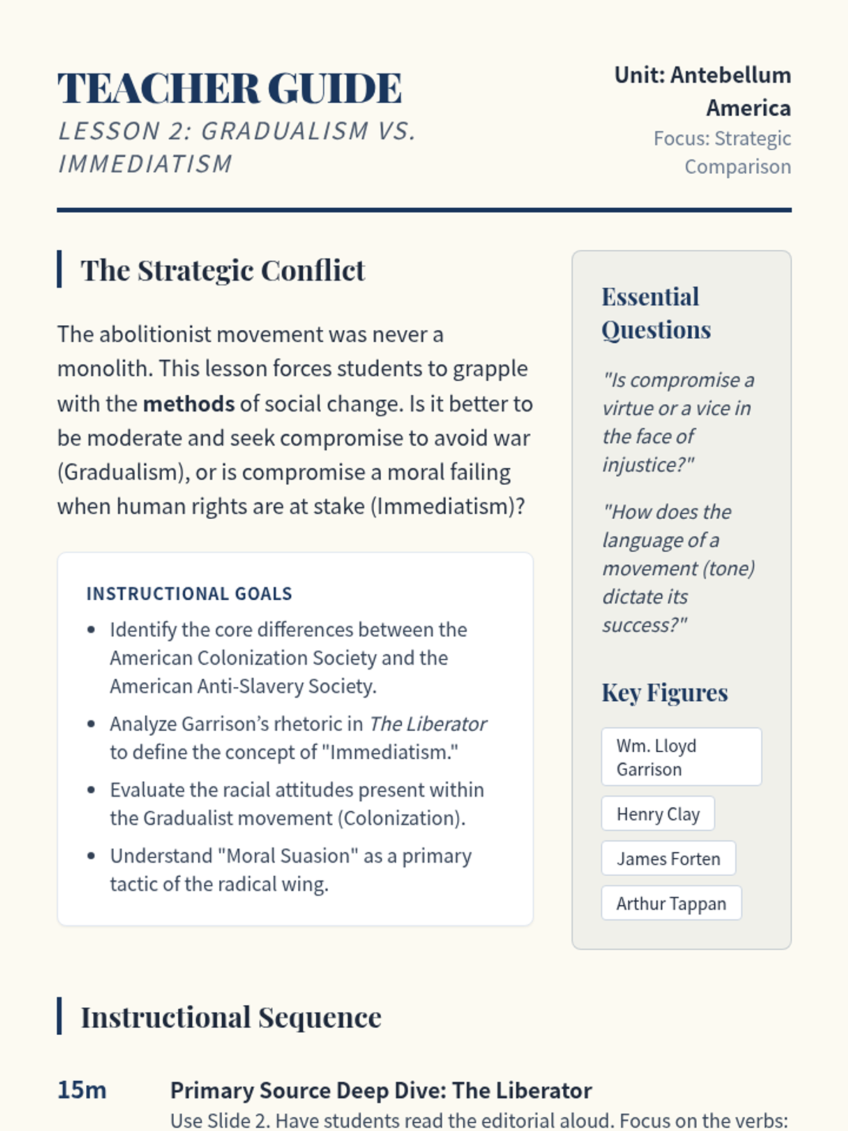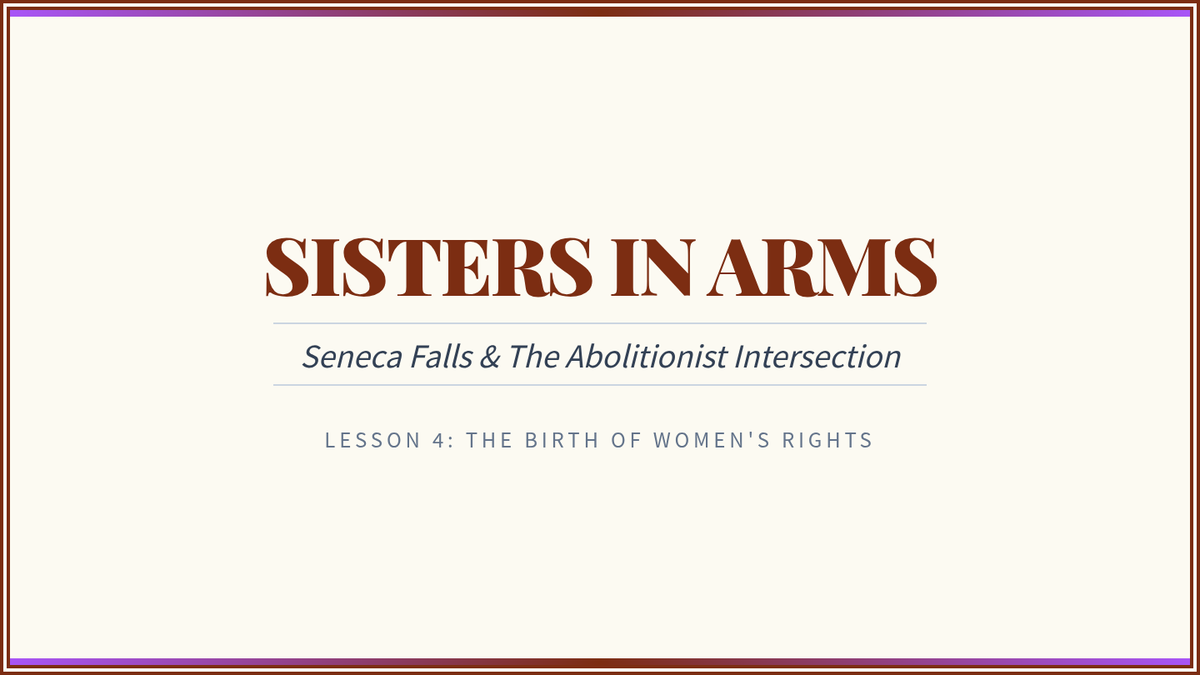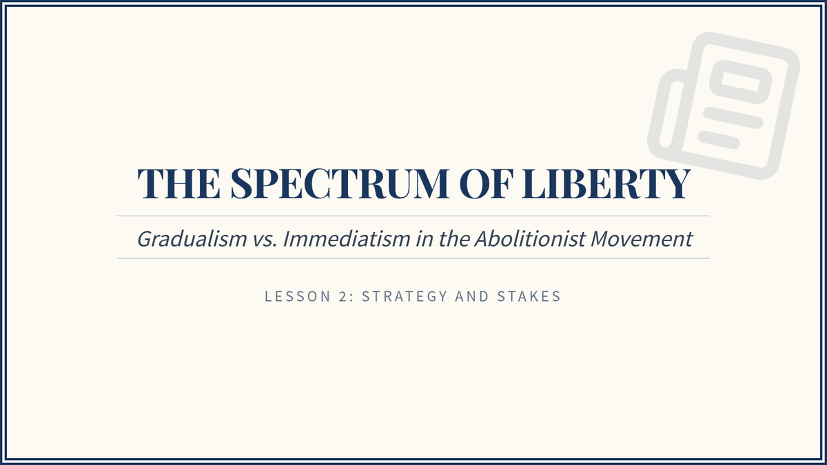 This sequence investigates the major social reform movements of the Antebellum period, with a primary focus on Abolitionism and its intersection with Women's Rights. Students trace the evolution of the movement from colonization to immediate emancipation, analyzing key figures, the power of the press, and the effectiveness of grassroots activism.