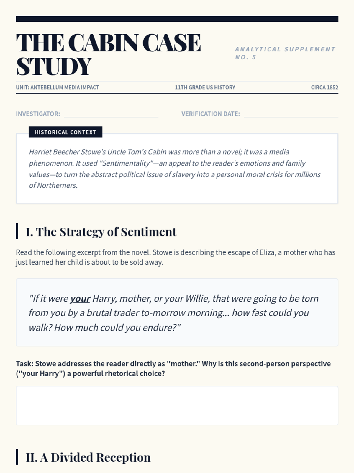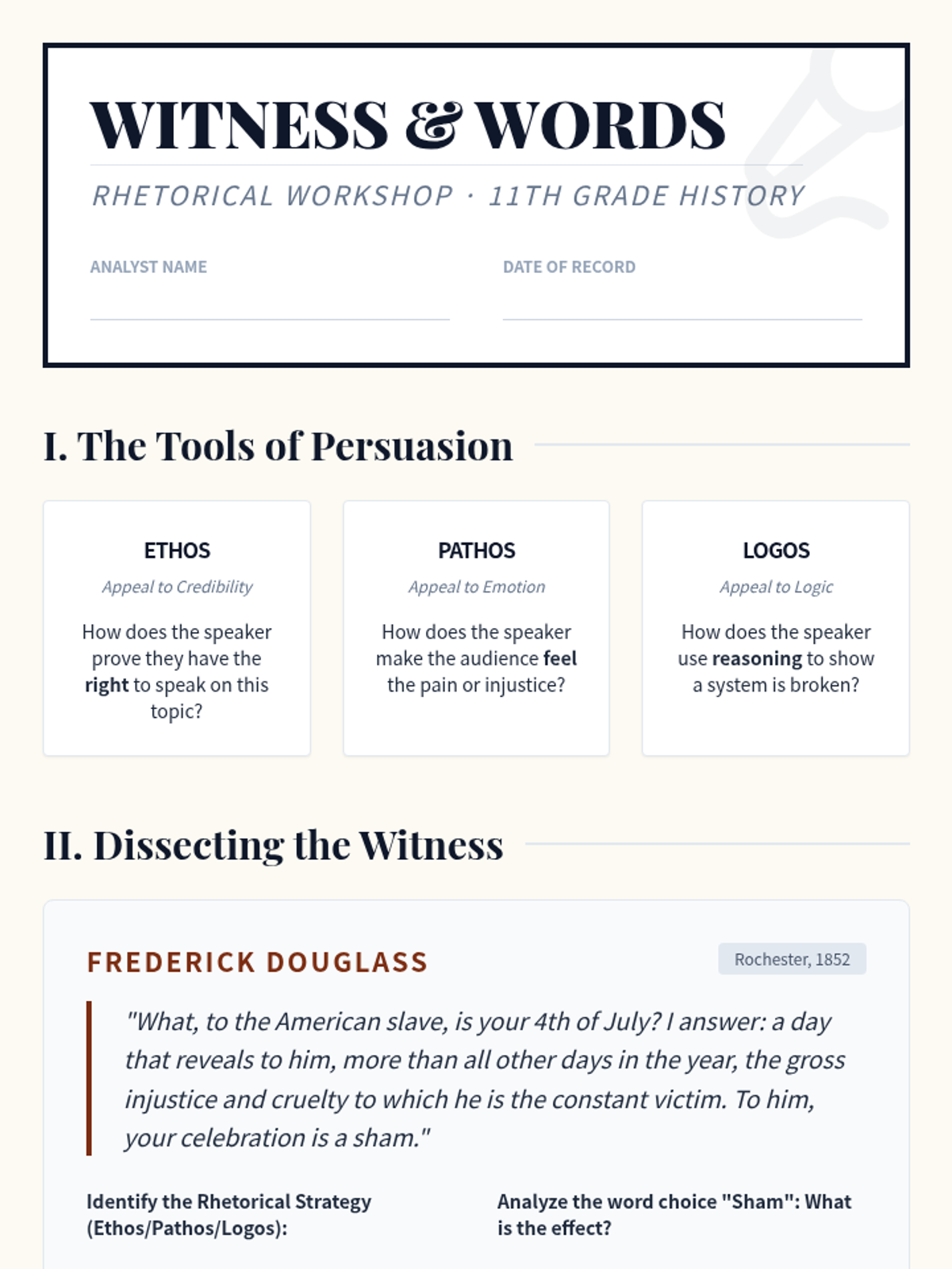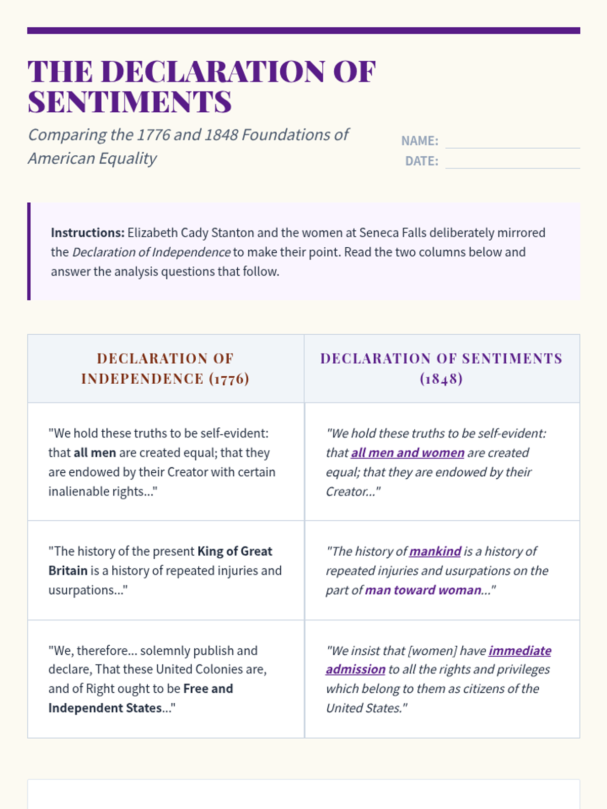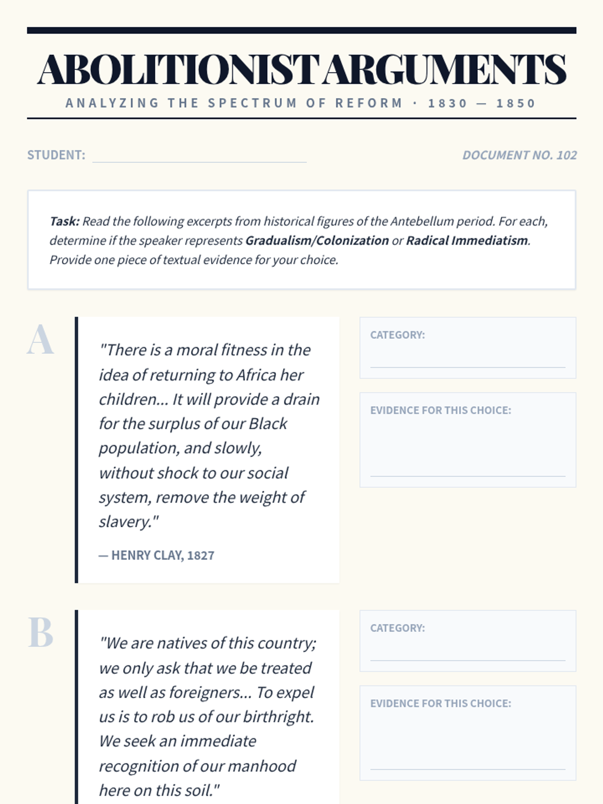 This sequence investigates the major social reform movements of the Antebellum period, with a primary focus on Abolitionism and its intersection with Women's Rights. Students trace the evolution of the movement from colonization to immediate emancipation, analyzing key figures, the power of the press, and the effectiveness of grassroots activism.