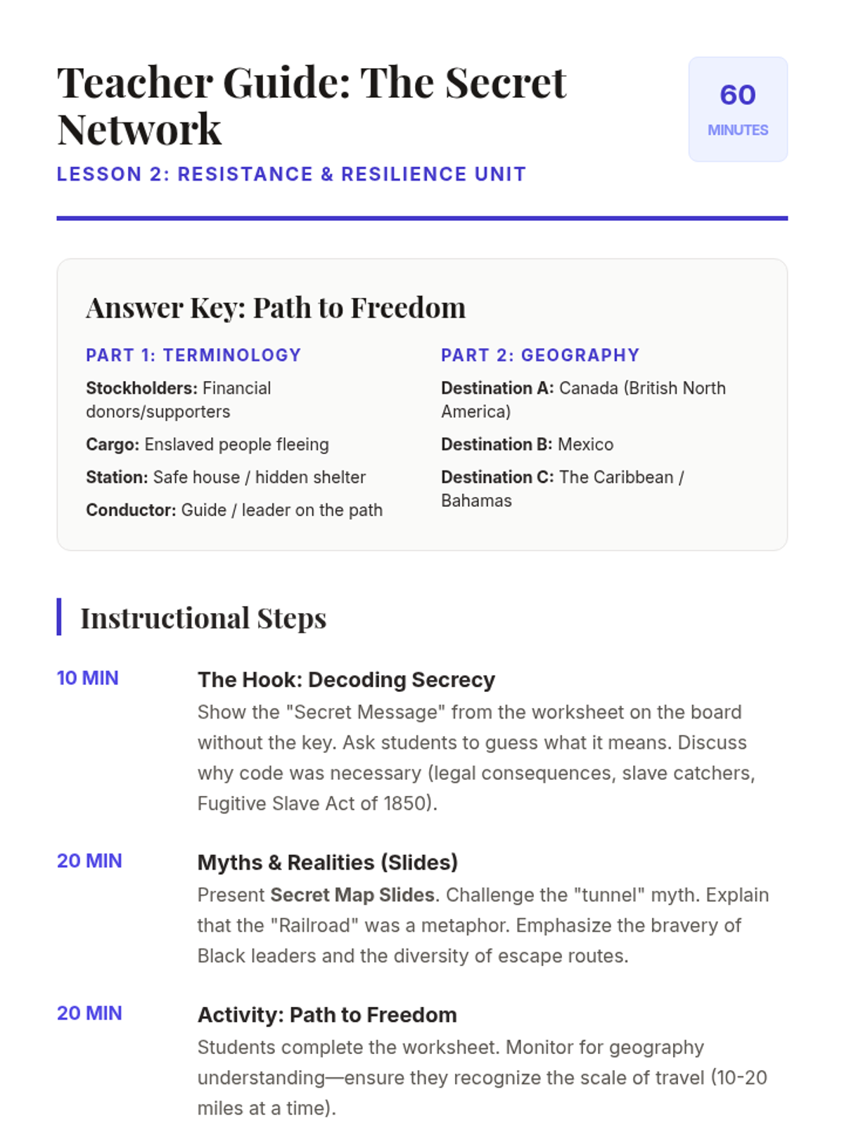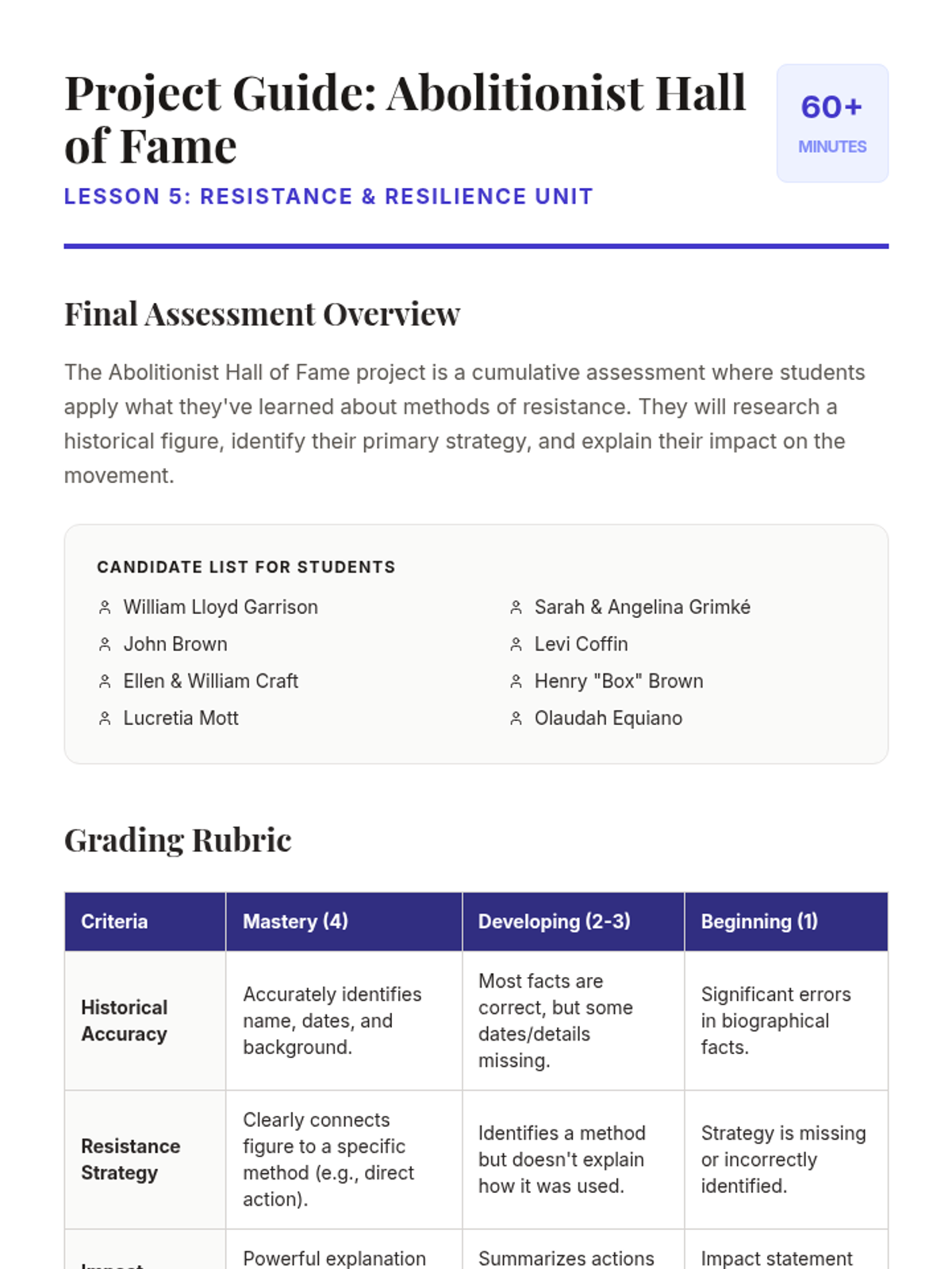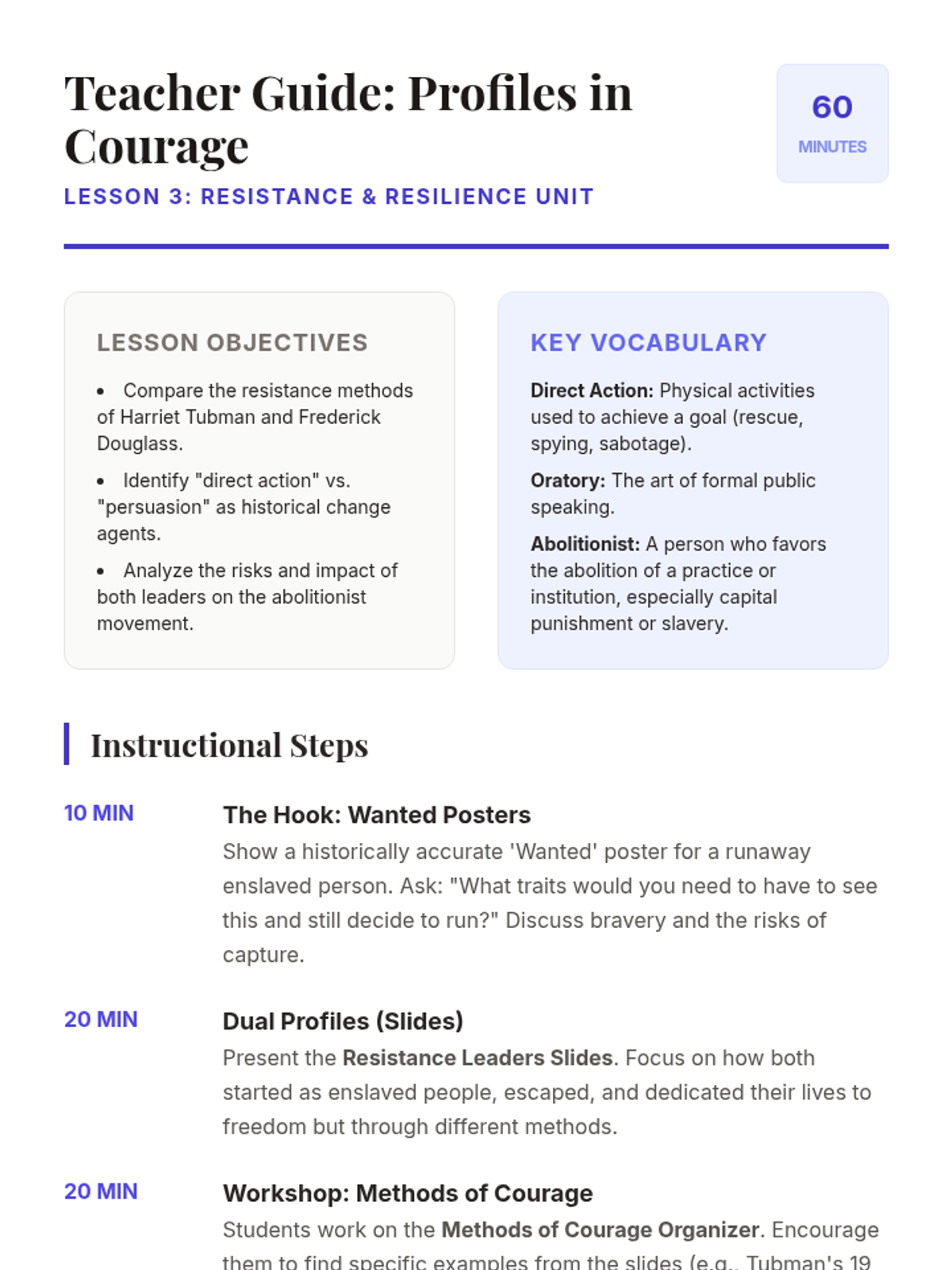 A 5th-grade history unit exploring the resistance against slavery through primary source narratives, the Underground Railroad, and the influential voices of the abolitionist movement. Students analyze different methods of resistance and the power of words in the fight for justice.