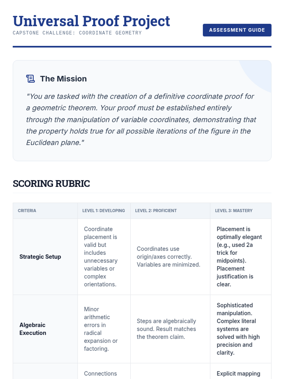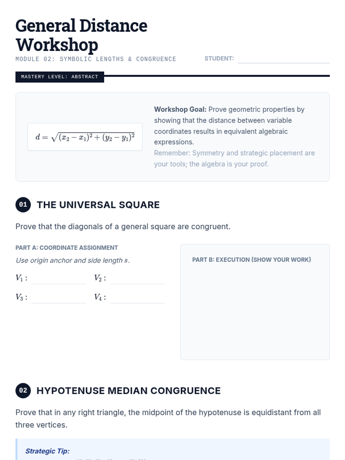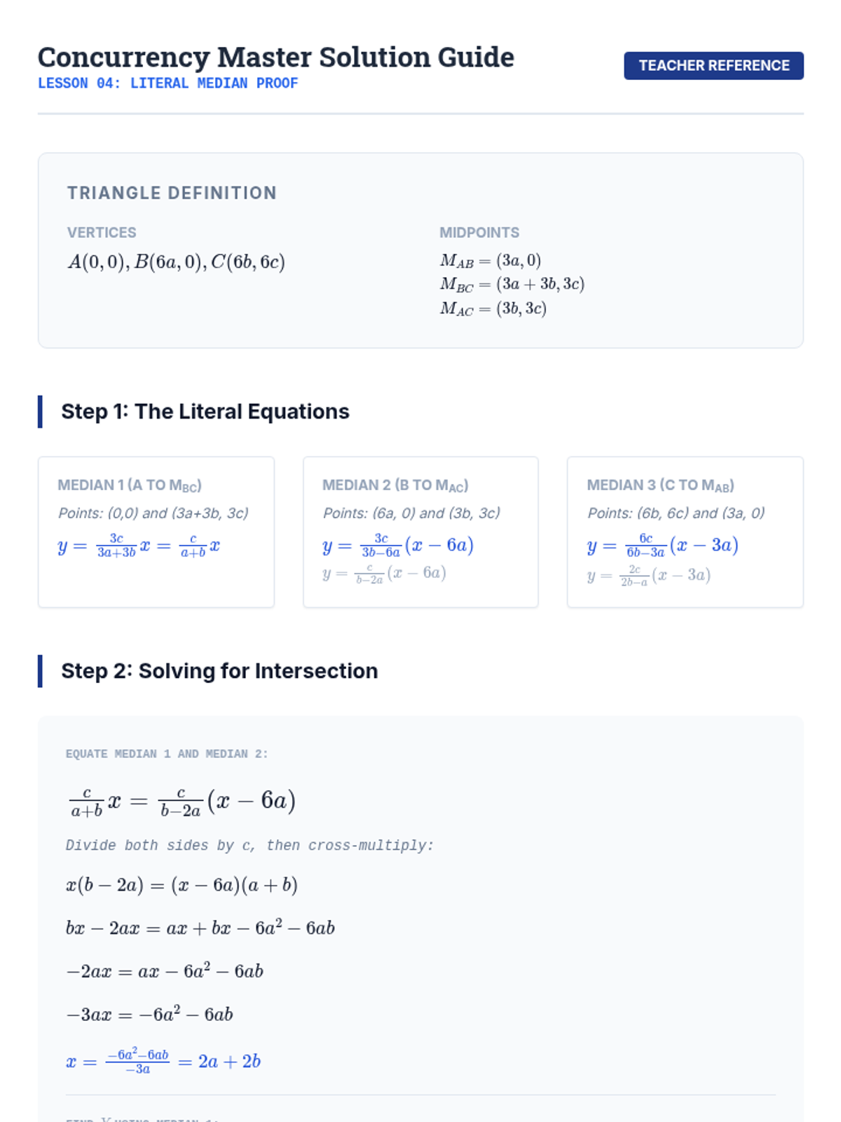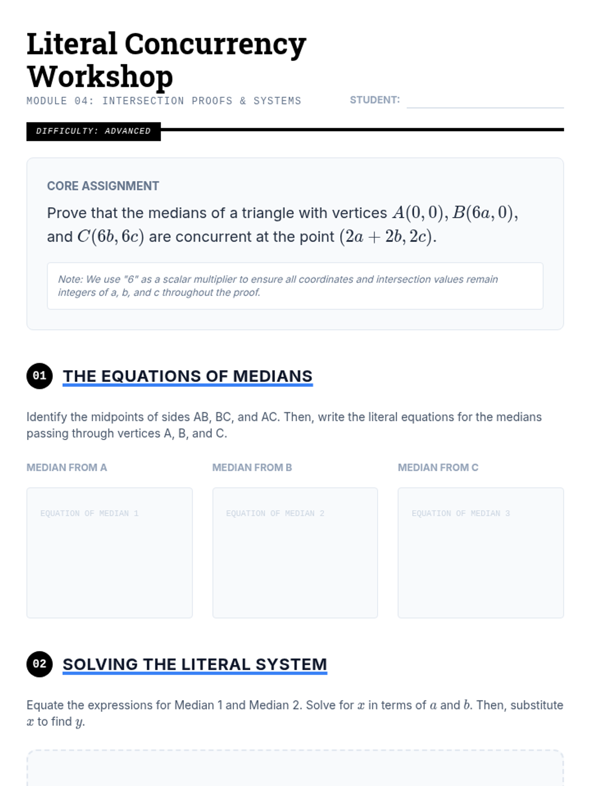 This undergraduate-level sequence focuses on the transition from numerical to algebraic coordinate geometry. Students learn to define shapes using variable coordinates, manipulate symbolic expressions to prove universal theorems, and handle complex concurrency proofs using literal systems of equations.