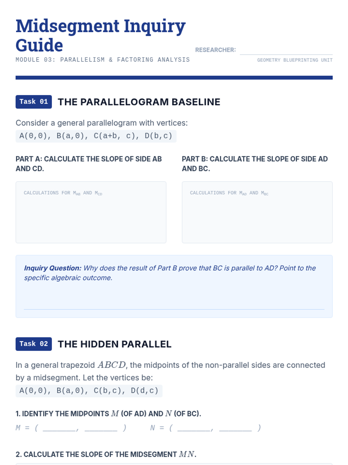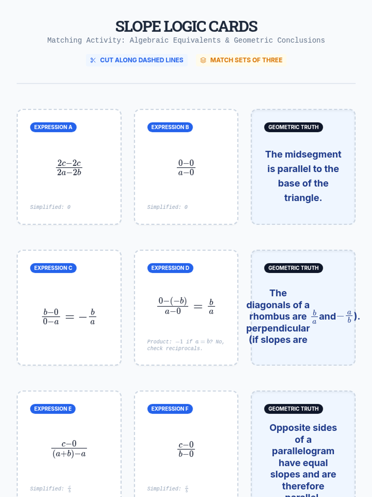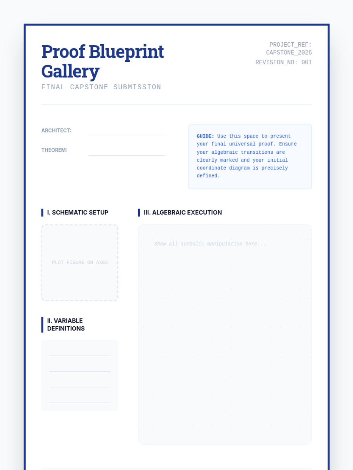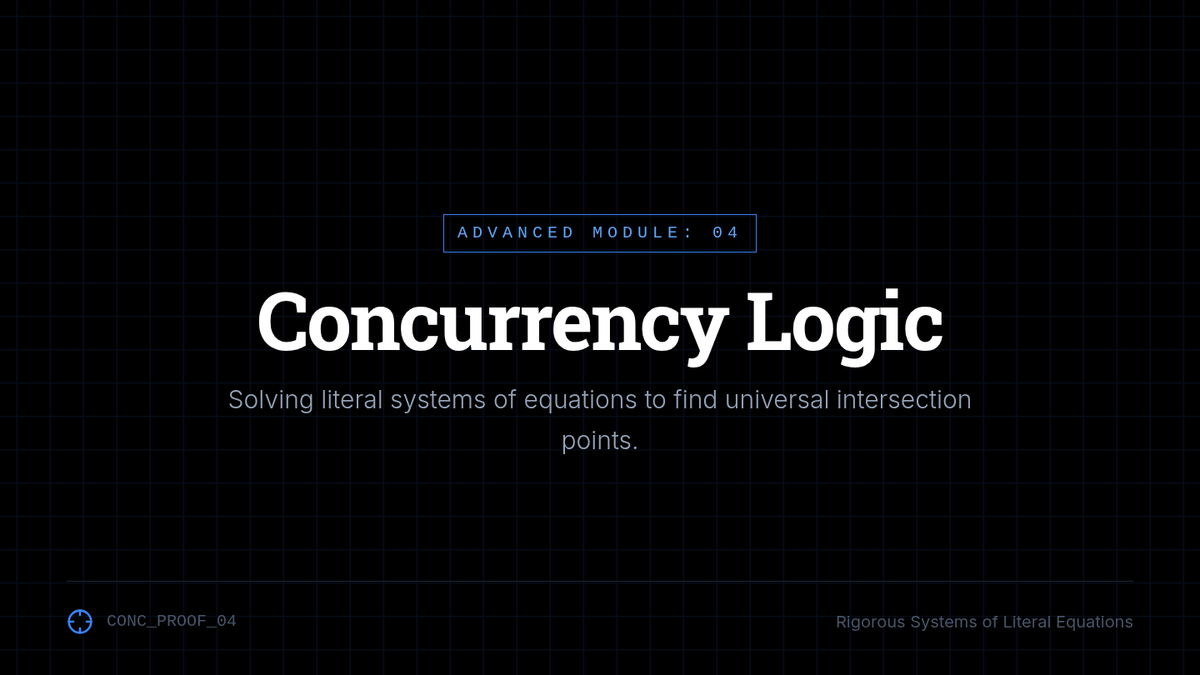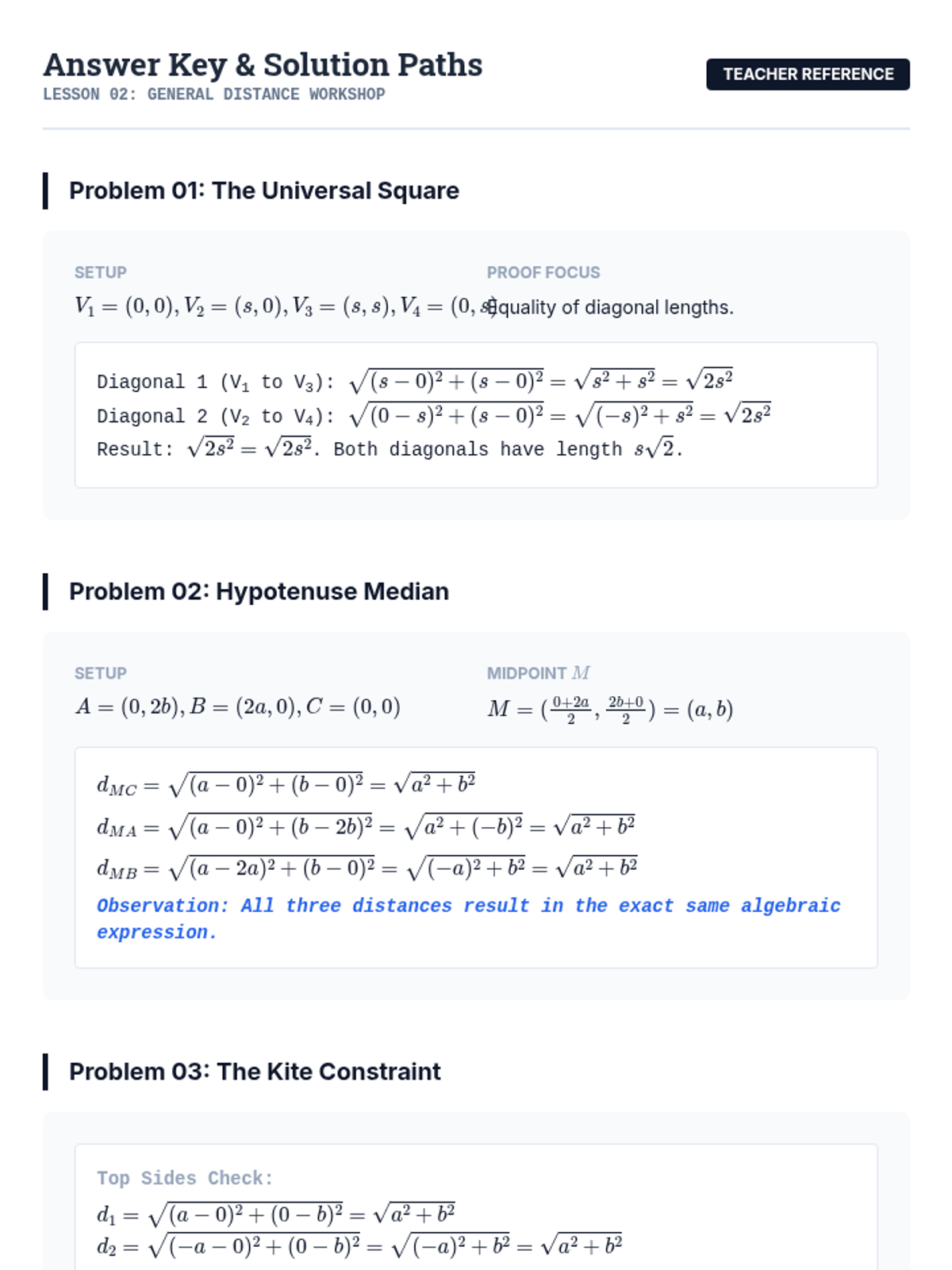 This undergraduate-level sequence focuses on the transition from numerical to algebraic coordinate geometry. Students learn to define shapes using variable coordinates, manipulate symbolic expressions to prove universal theorems, and handle complex concurrency proofs using literal systems of equations.