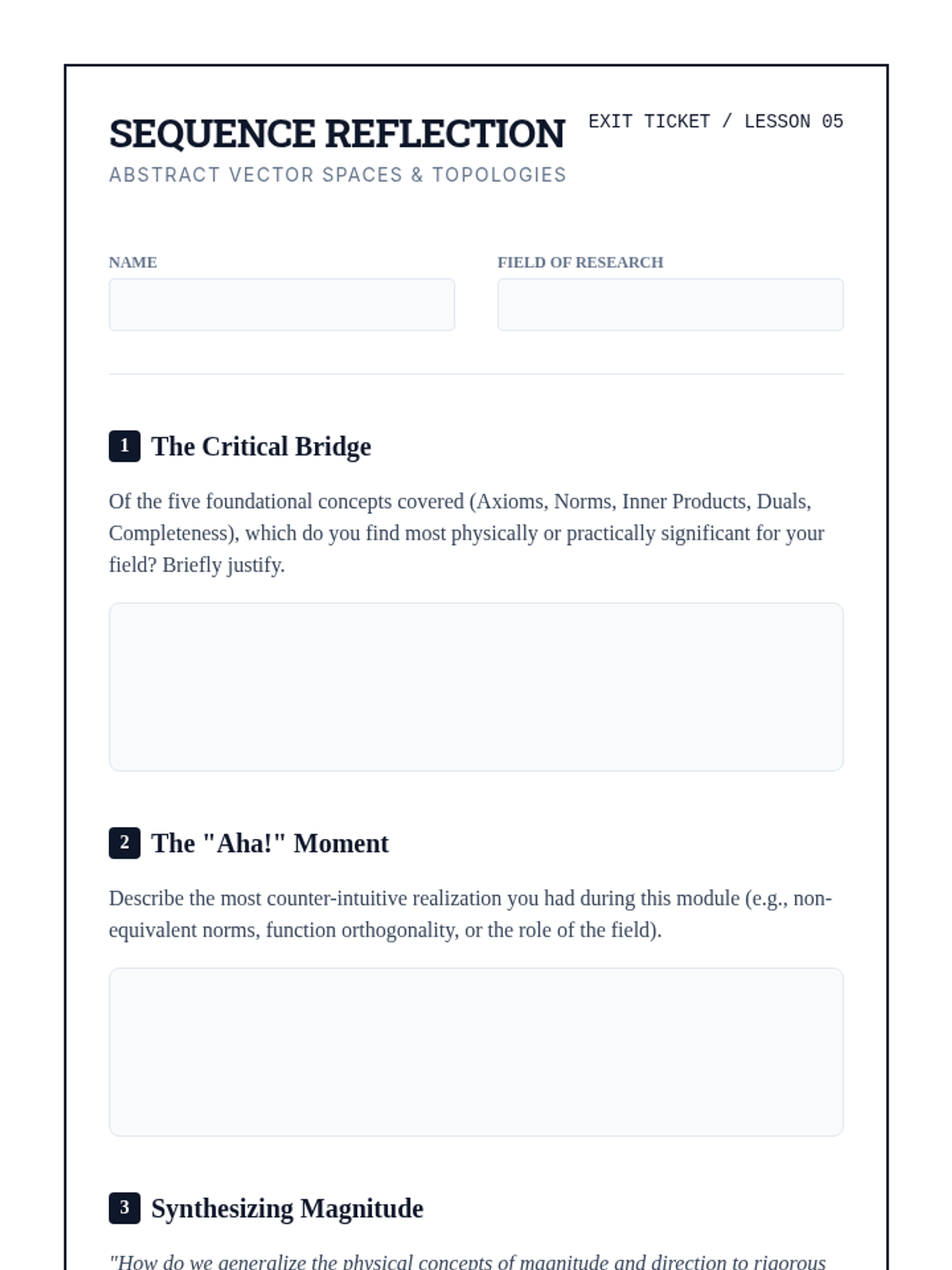 A rigorous graduate-level sequence exploring the algebraic and topological foundations of vector quantities, transitioning from Euclidean geometry to abstract Banach and Hilbert spaces.
