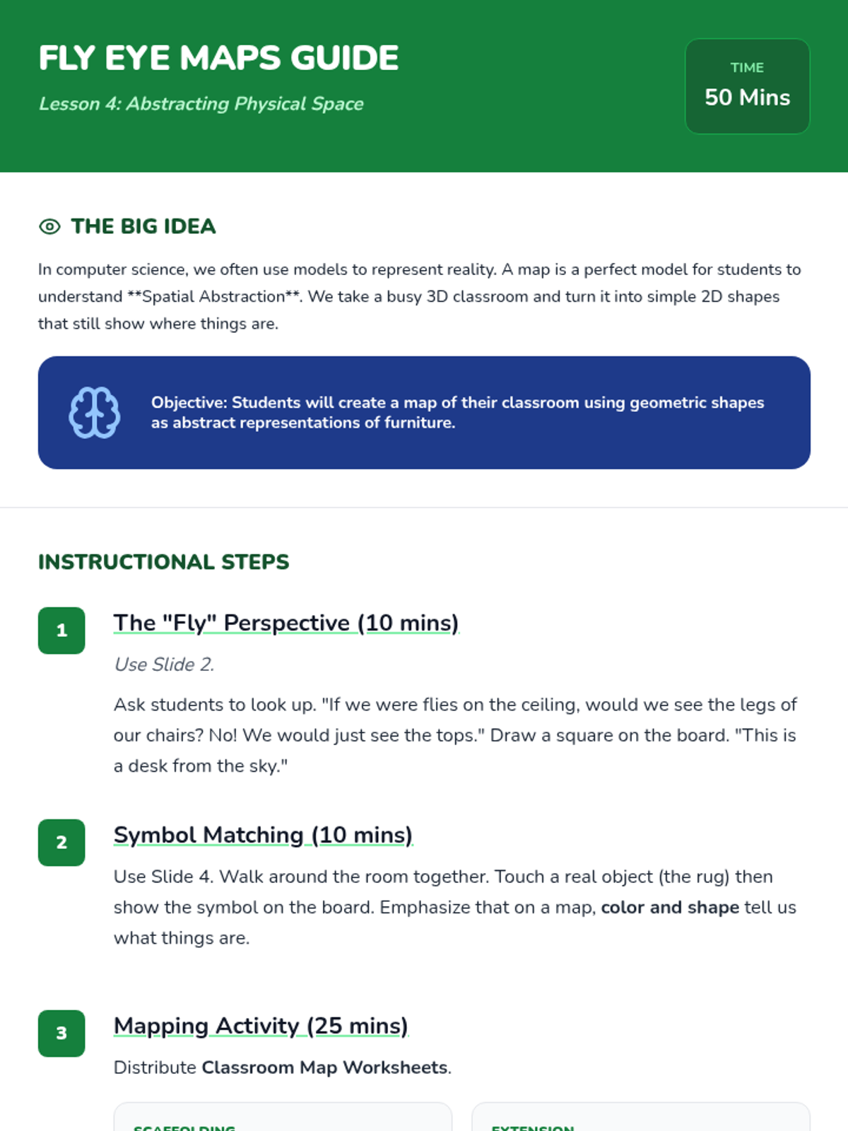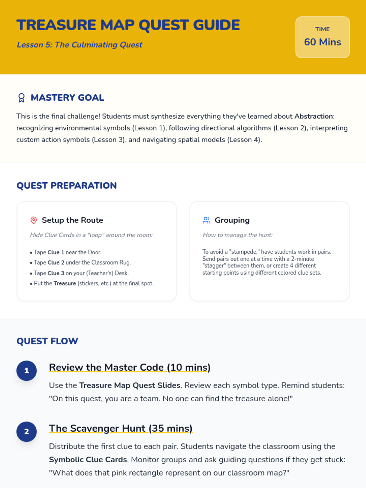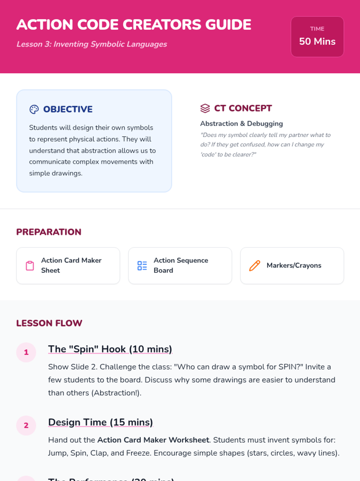 A Kindergarten sequence focused on abstraction, teaching students to represent real-world objects and actions using symbols. Students progress from recognizing environmental signs to creating their own symbolic languages and navigating maps.
