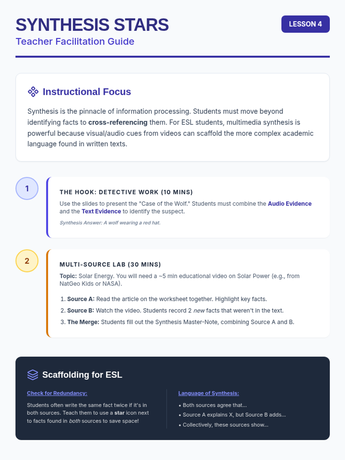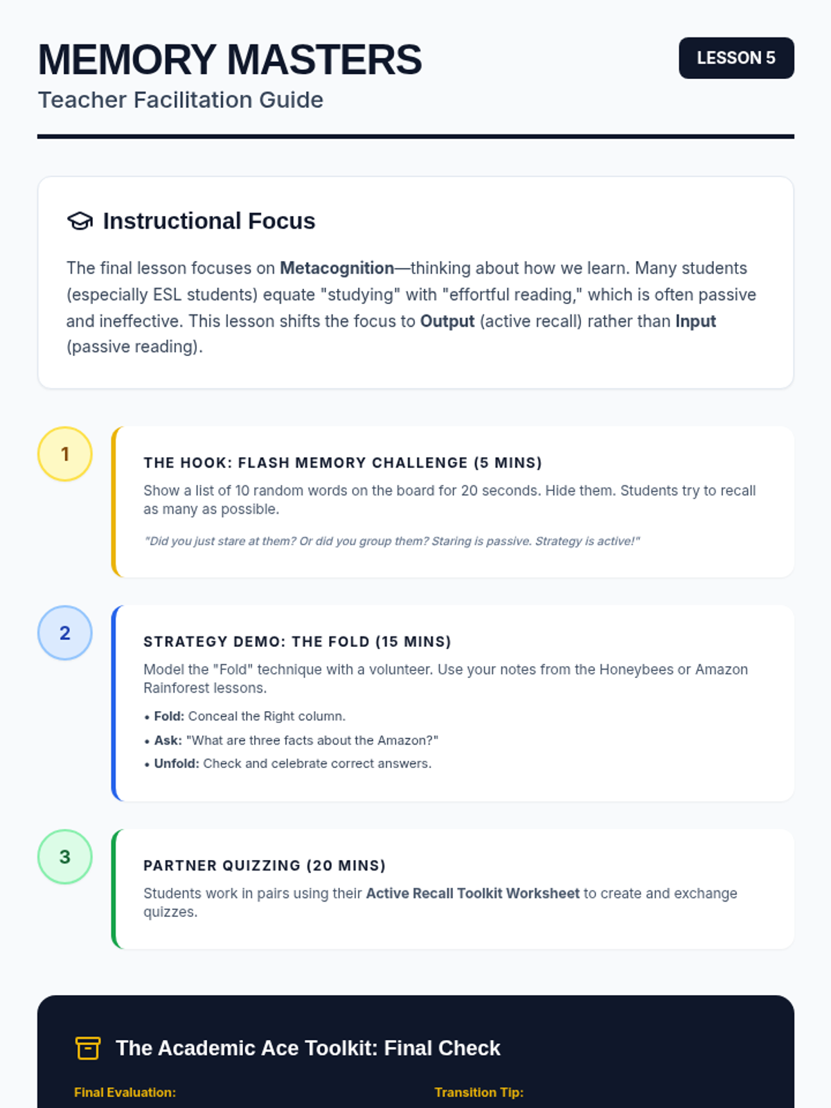 A comprehensive sequence for 5th-grade ESL students to master academic listening, two-column note-taking, paraphrasing, synthesis, and active recall study strategies. Students build a 'Toolkit' of skills to navigate upper elementary and middle school academic requirements.