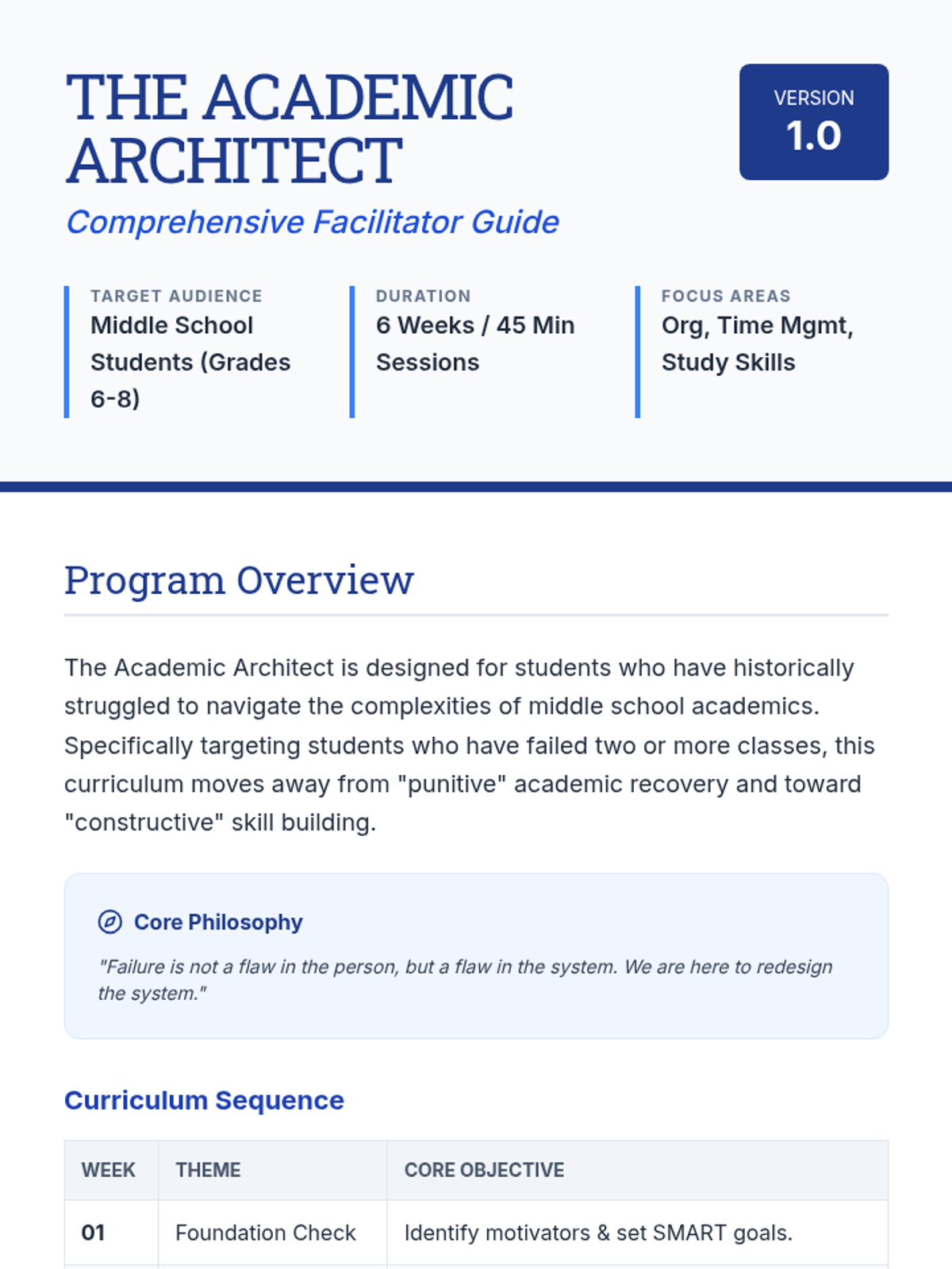 A 7-week small group curriculum designed for middle school students who have faced academic challenges, focusing on organization, time management, study habits, and attendance.