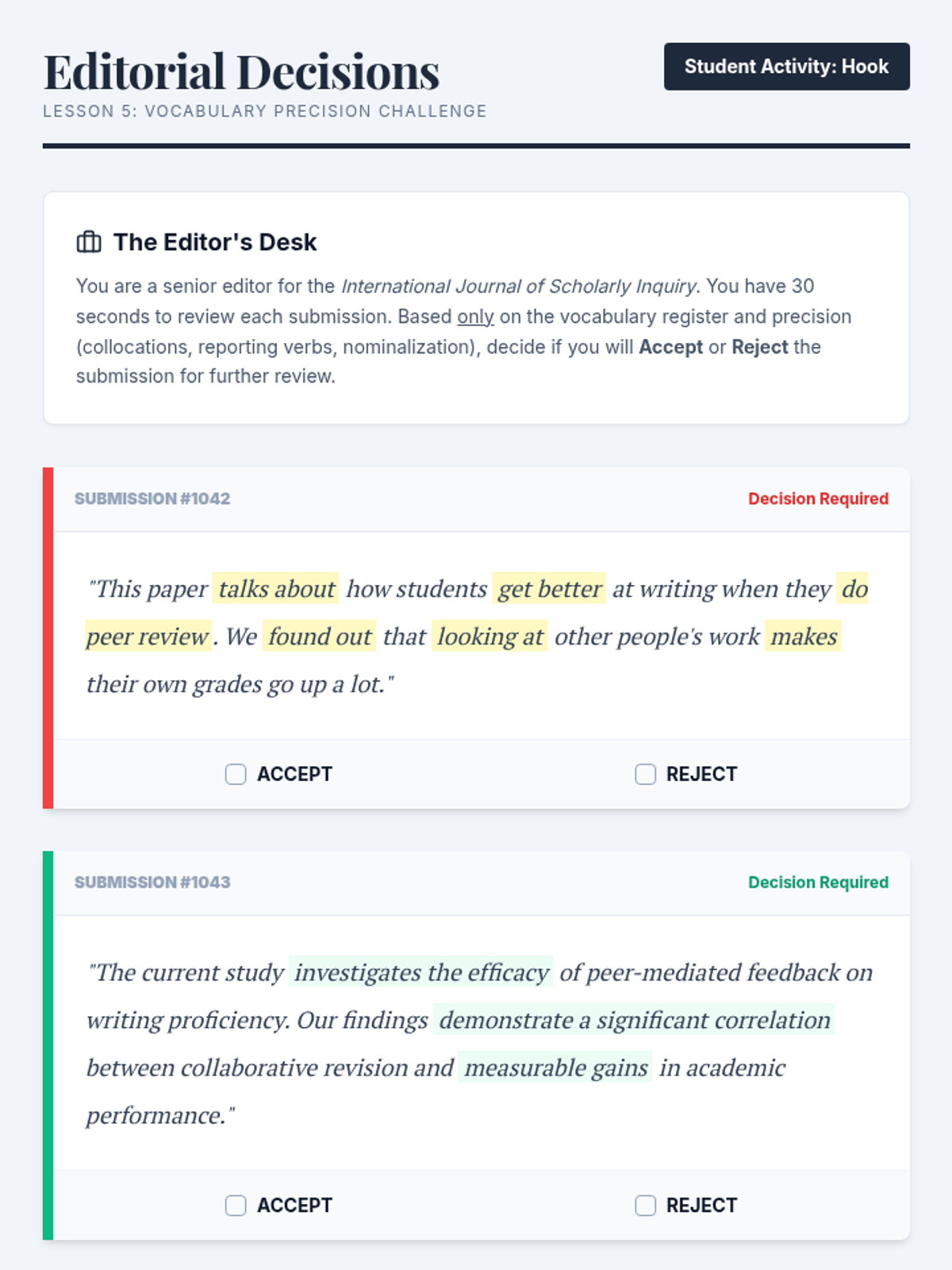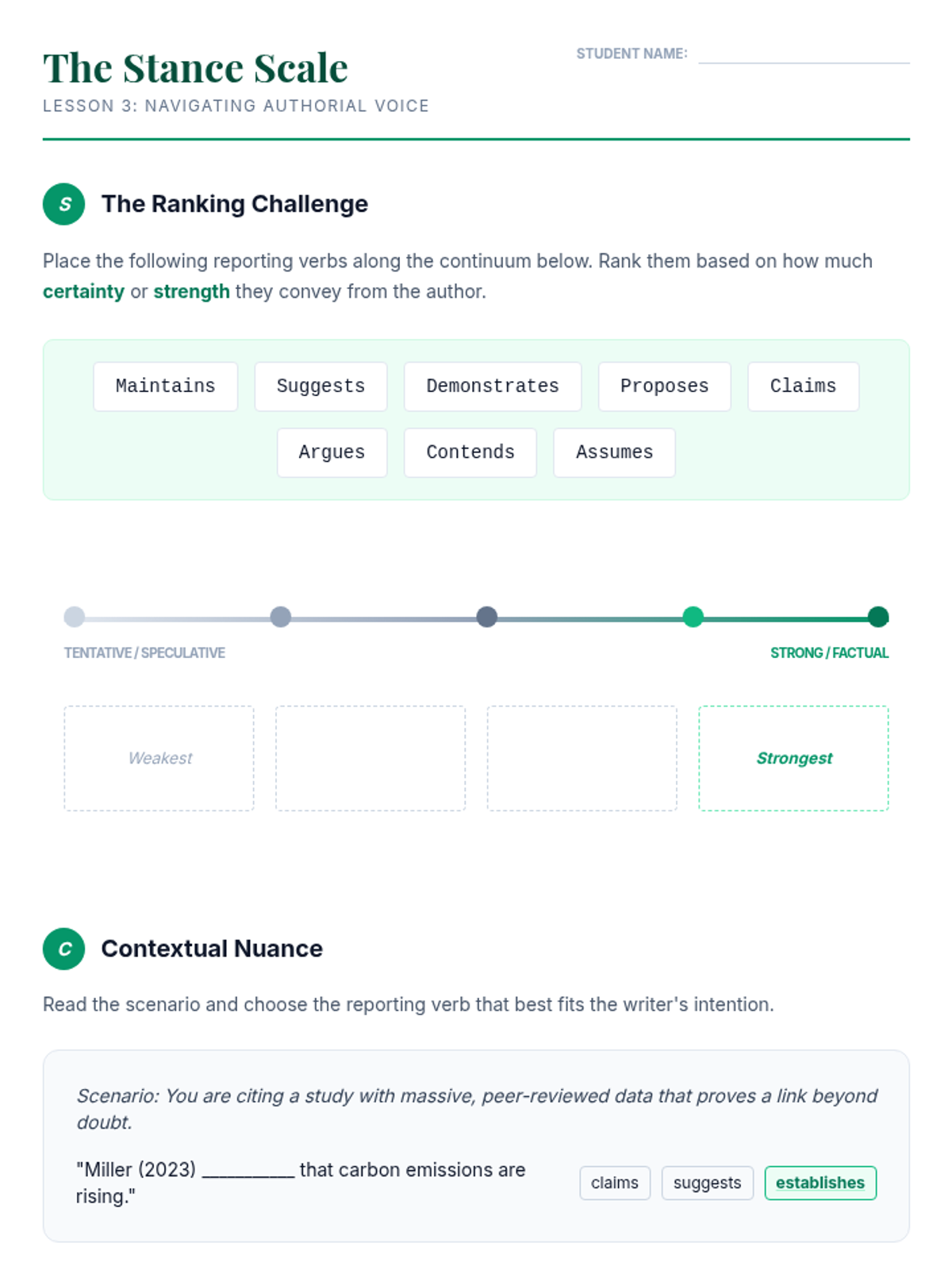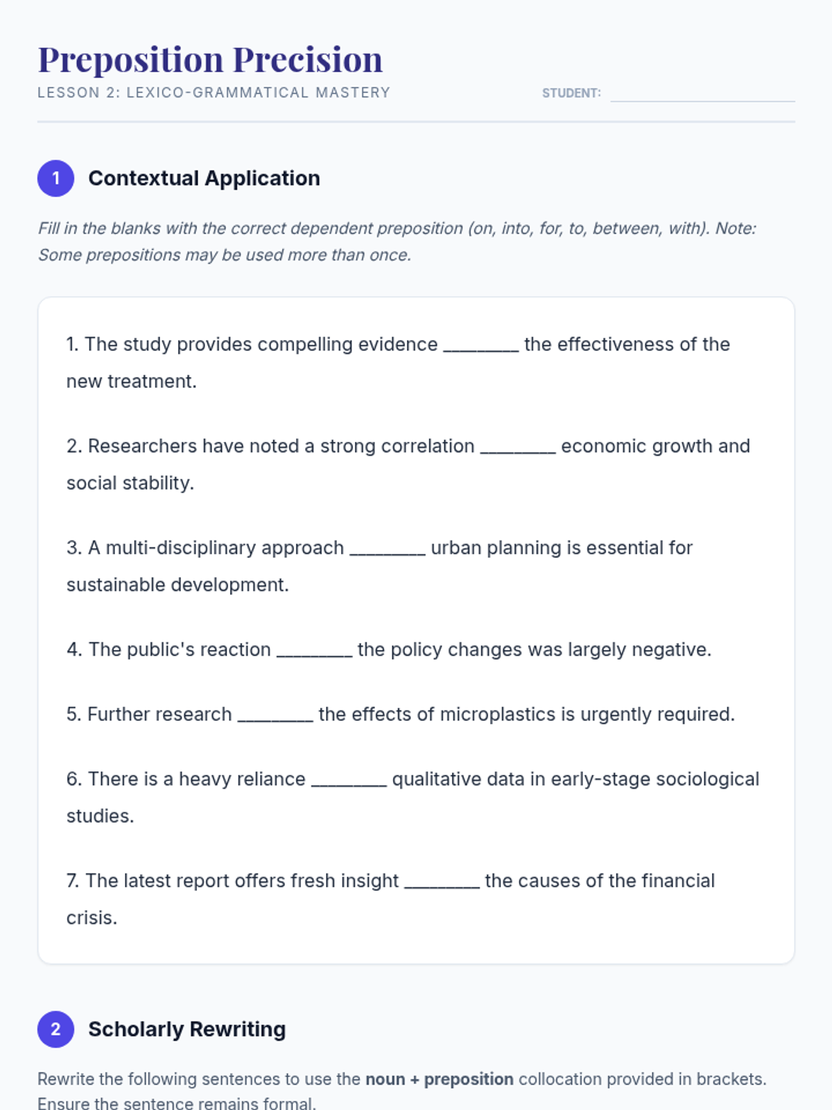 A comprehensive unit designed for graduate students to transition from general English to high-frequency academic collocations and formal register. Students will analyze research literature, master abstract noun-preposition pairings, refine reporting verbs, and use nominalization to enhance lexical density in their scholarly writing.