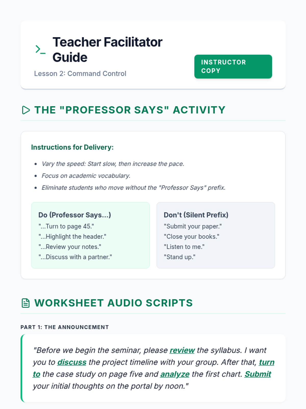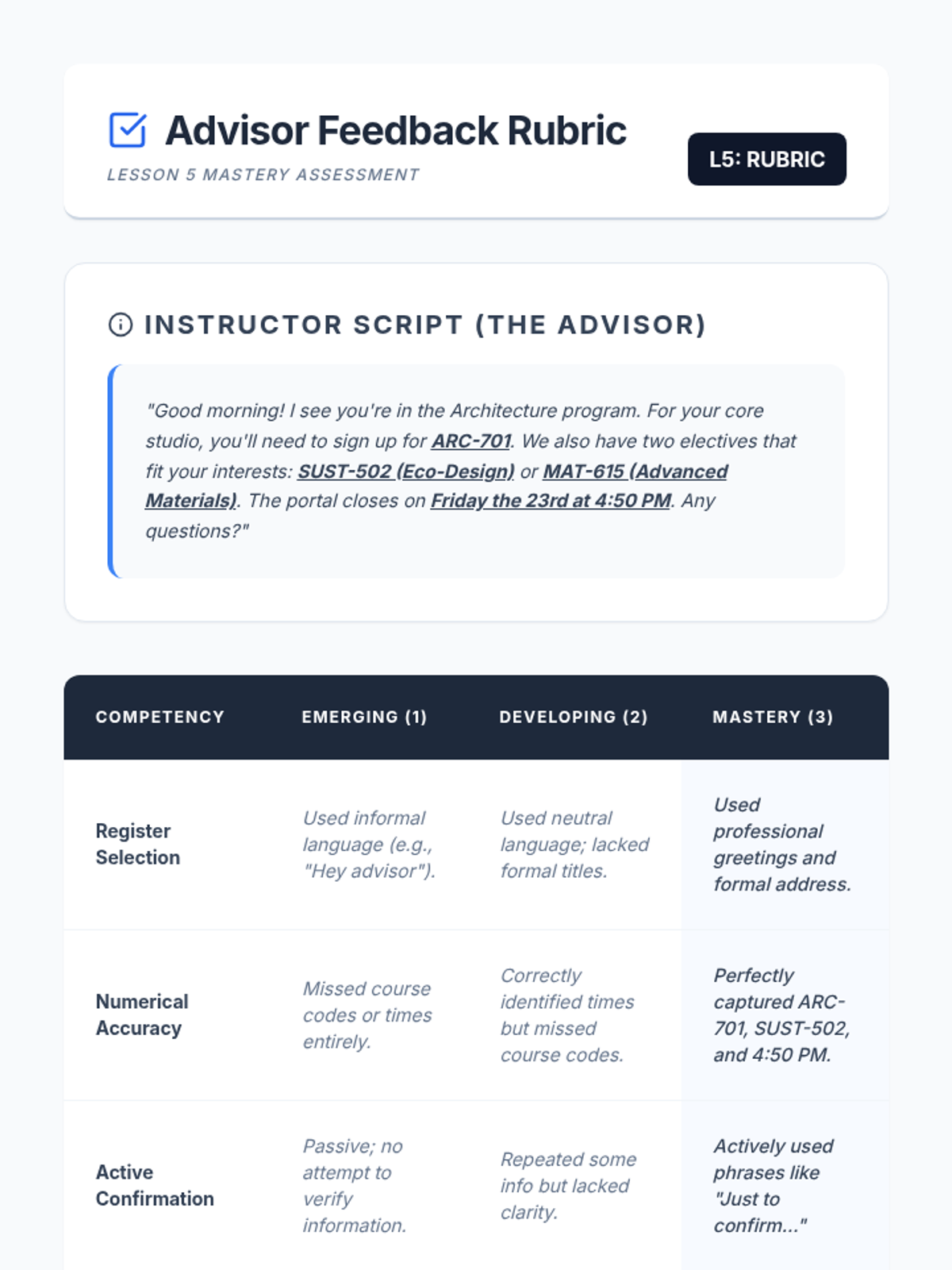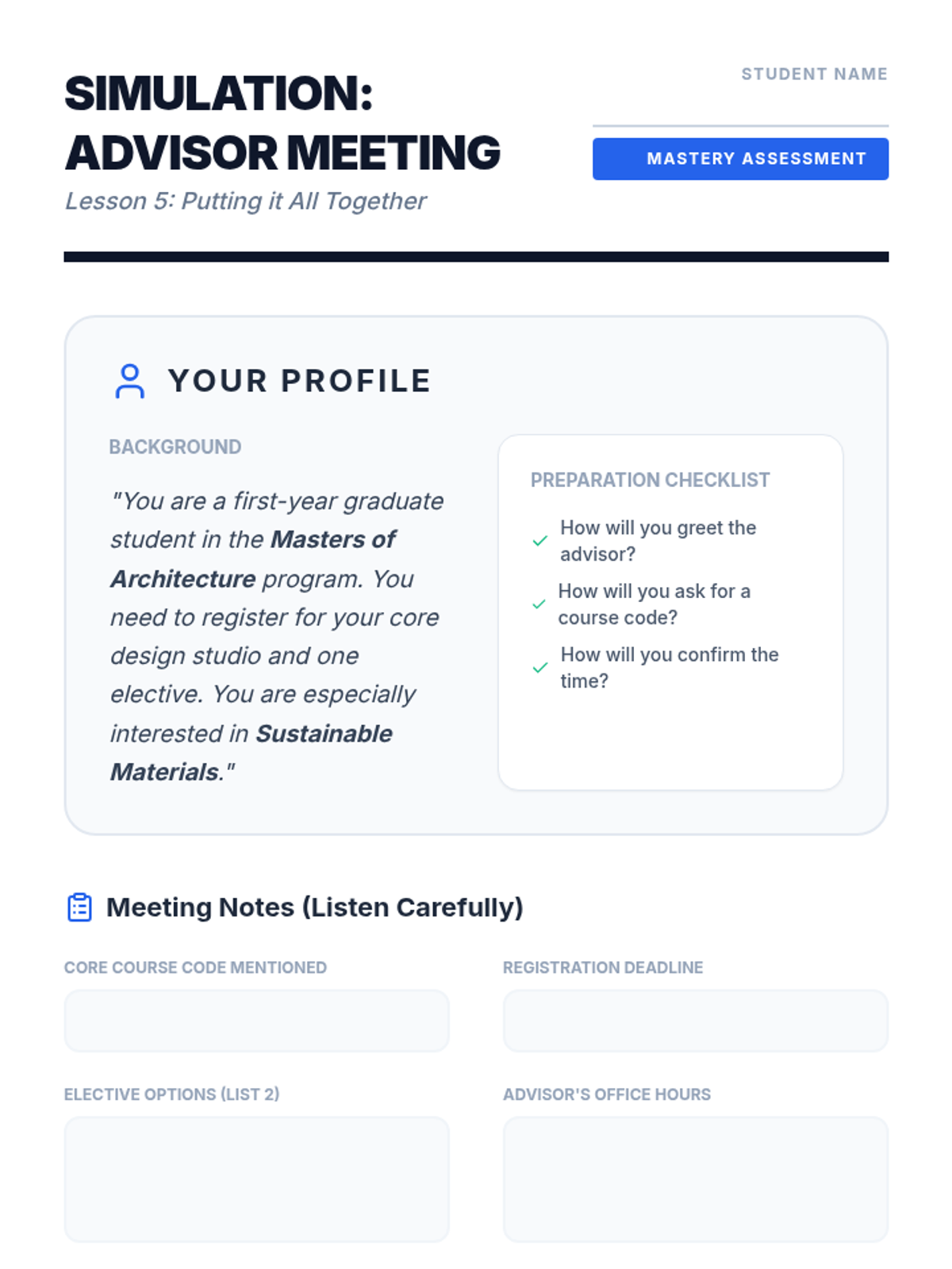 A specialized ESL listening sequence for graduate students, focusing on navigating academic registers, classroom imperatives, campus logistics, and administrative interactions. Students will develop the ability to distinguish between formal and informal tones and follow multi-step oral instructions in a university setting.