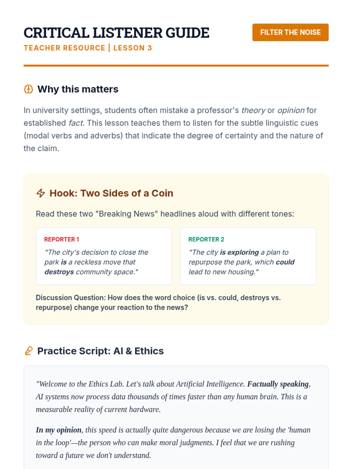 This sequence for graduate ESL students explores the nuances of English beyond literal meaning. Students will master the ability to detect sarcasm, bias, contrastive stress, and professional register, equipping them for complex academic and professional communication.