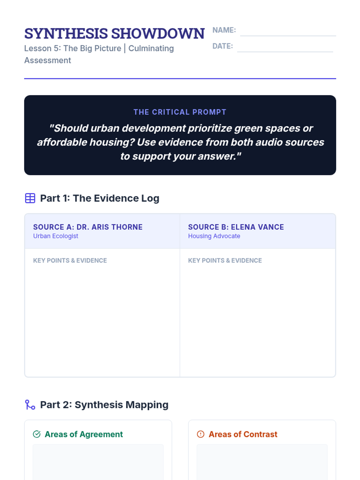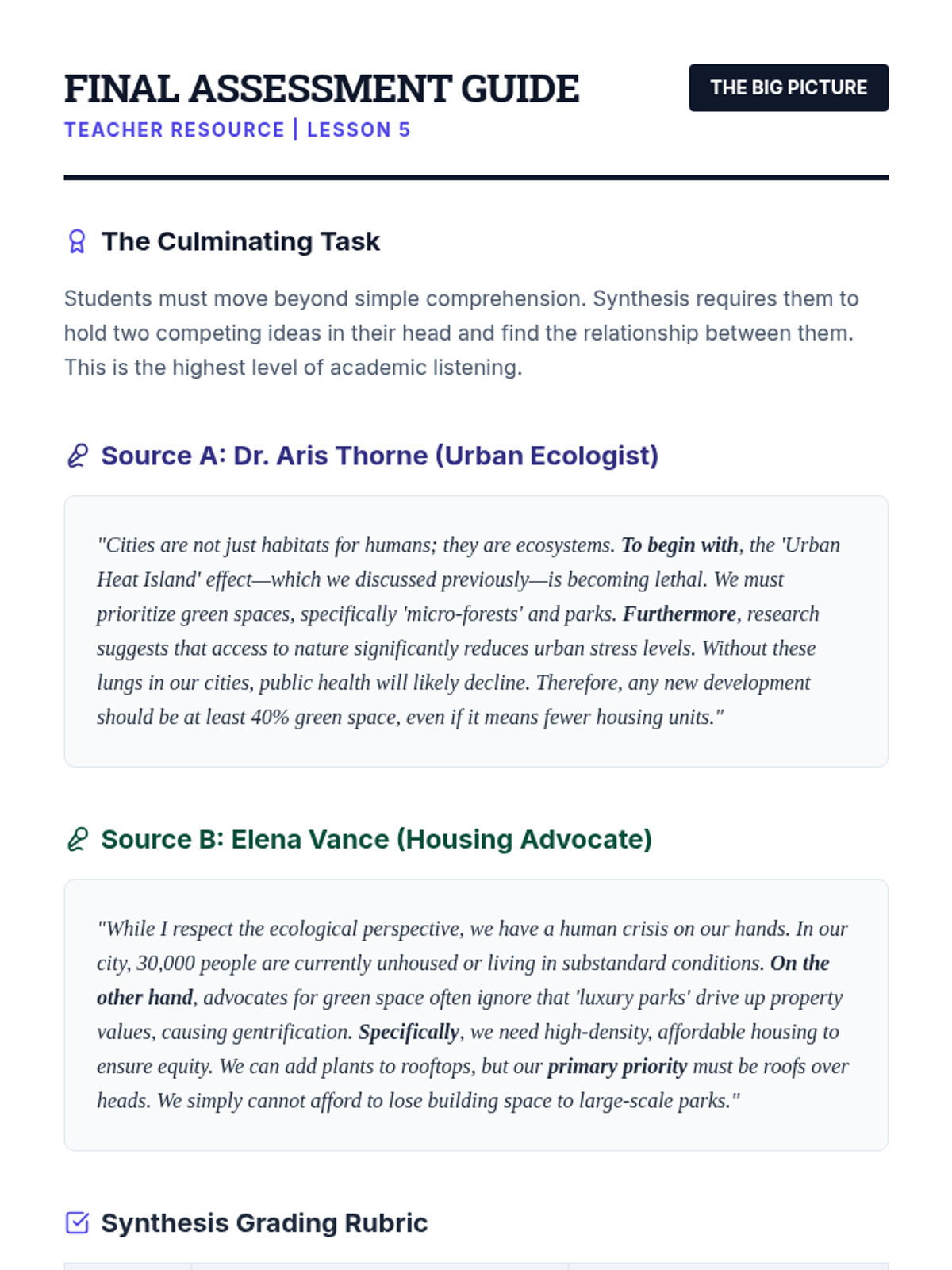 A comprehensive 5-lesson sequence designed for 7th-grade ESL students to master the art of synthesizing information. Students progress from organizing raw research notes to writing sophisticated, cohesive academic paragraphs using evidence from multiple sources.