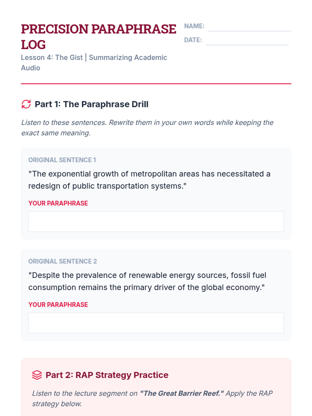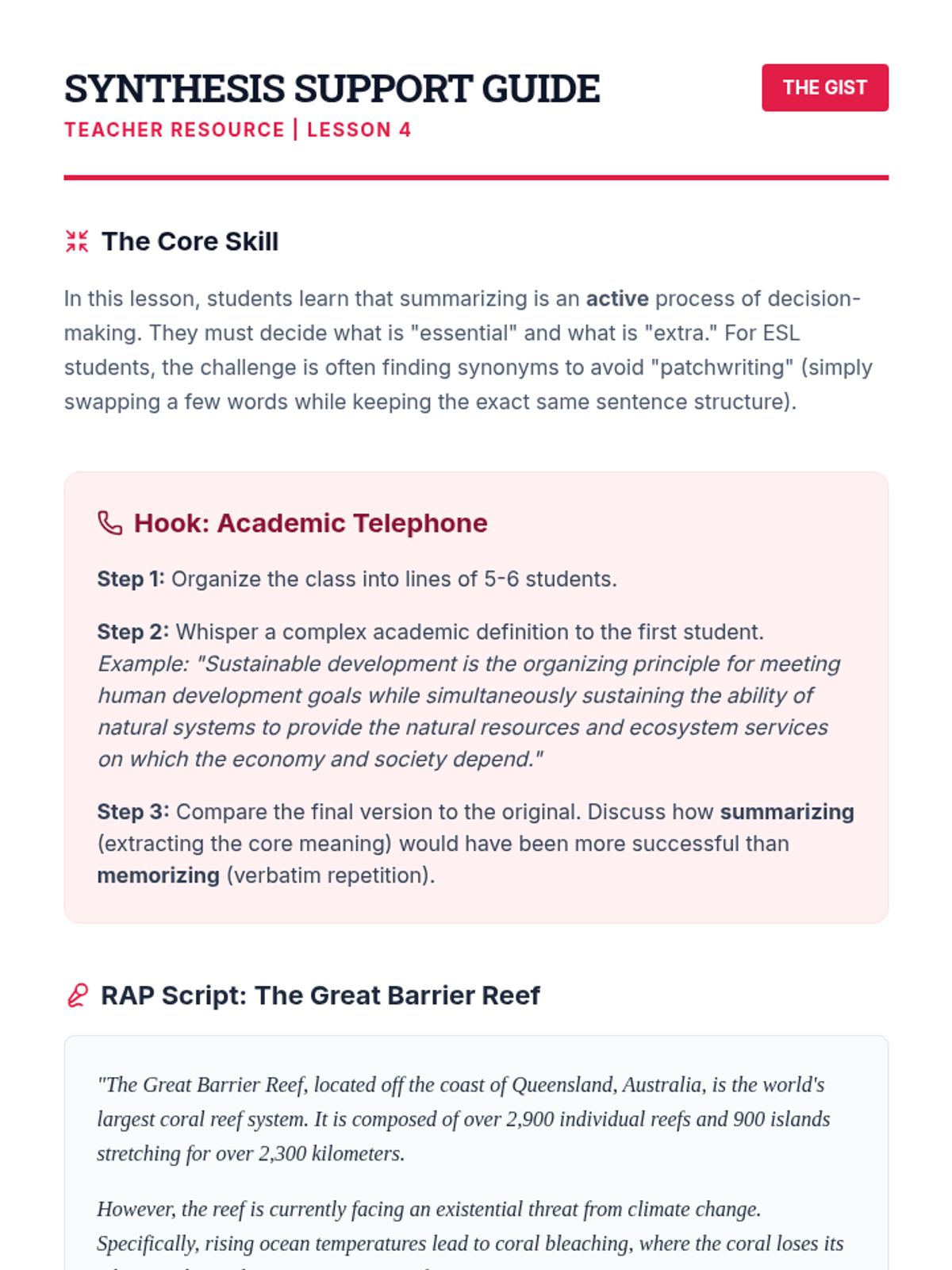 A comprehensive workshop-style unit for 6th Grade ESL students focused on the linguistic mechanics of paraphrasing and synthesizing information. Students move from identifying core concepts to orally retelling information, transforming individual sentences, and finally weaving multiple sources into a single coherent paragraph without plagiarizing.