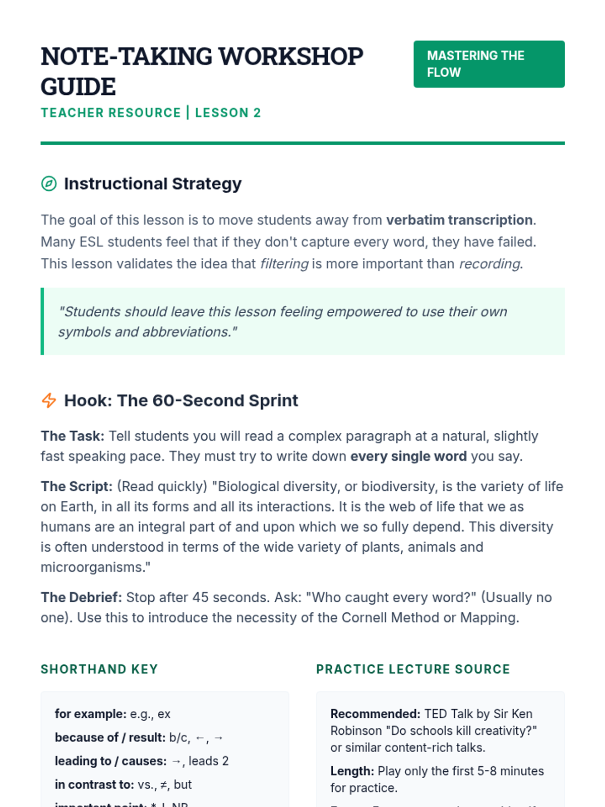 A comprehensive sequence for intermediate ESL graduate students focused on mastering academic lecture comprehension, identifying discourse markers, filtering digressions, and implementing effective note-taking strategies.