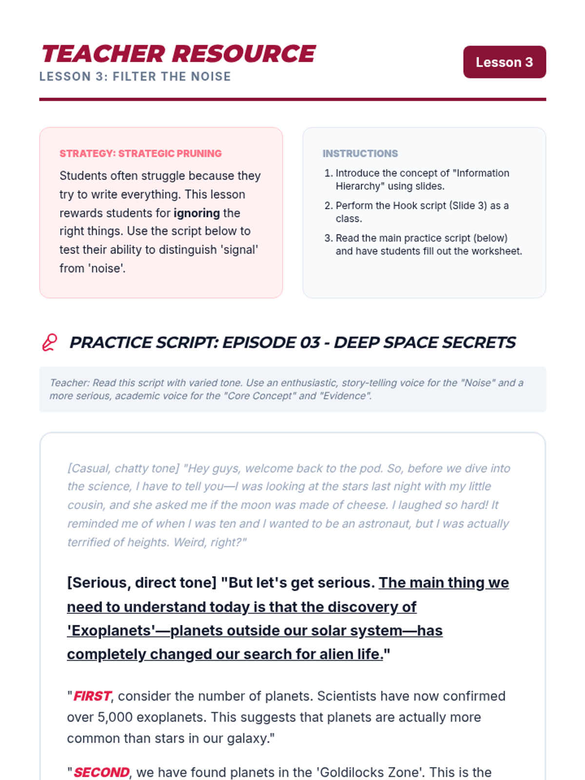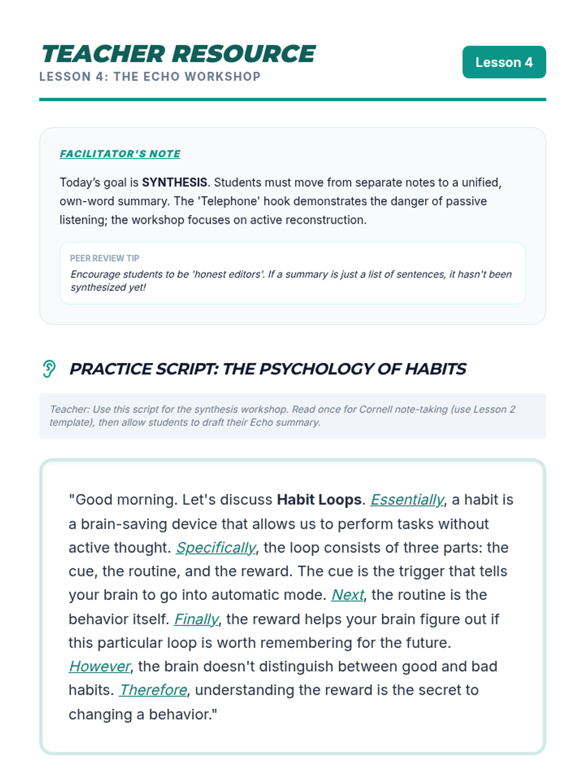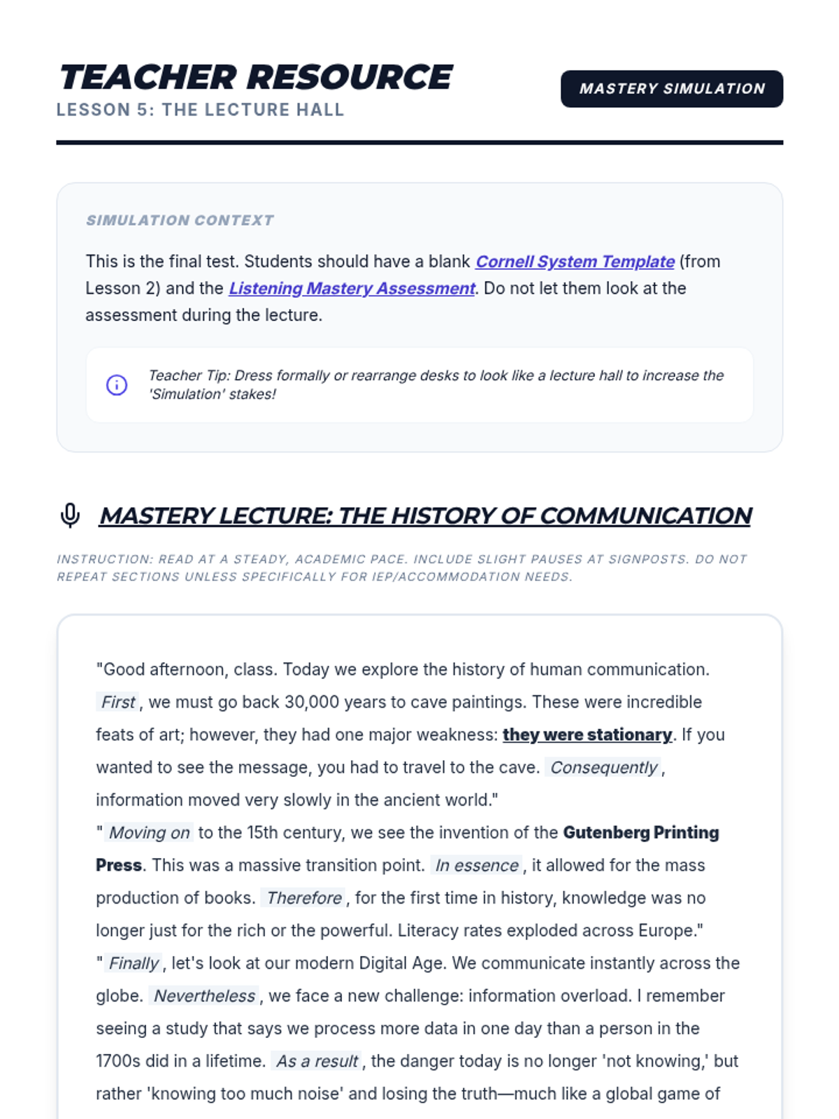 A comprehensive sequence for 10th-grade ESL students focusing on academic listening and note-taking. Students learn to identify signpost language, use the Cornell method, distinguish main ideas from supporting details, and synthesize information from lectures.