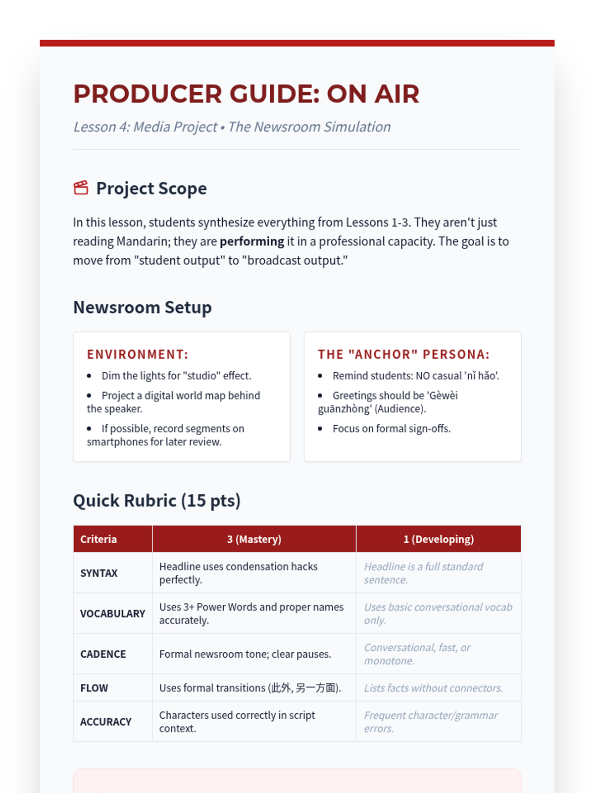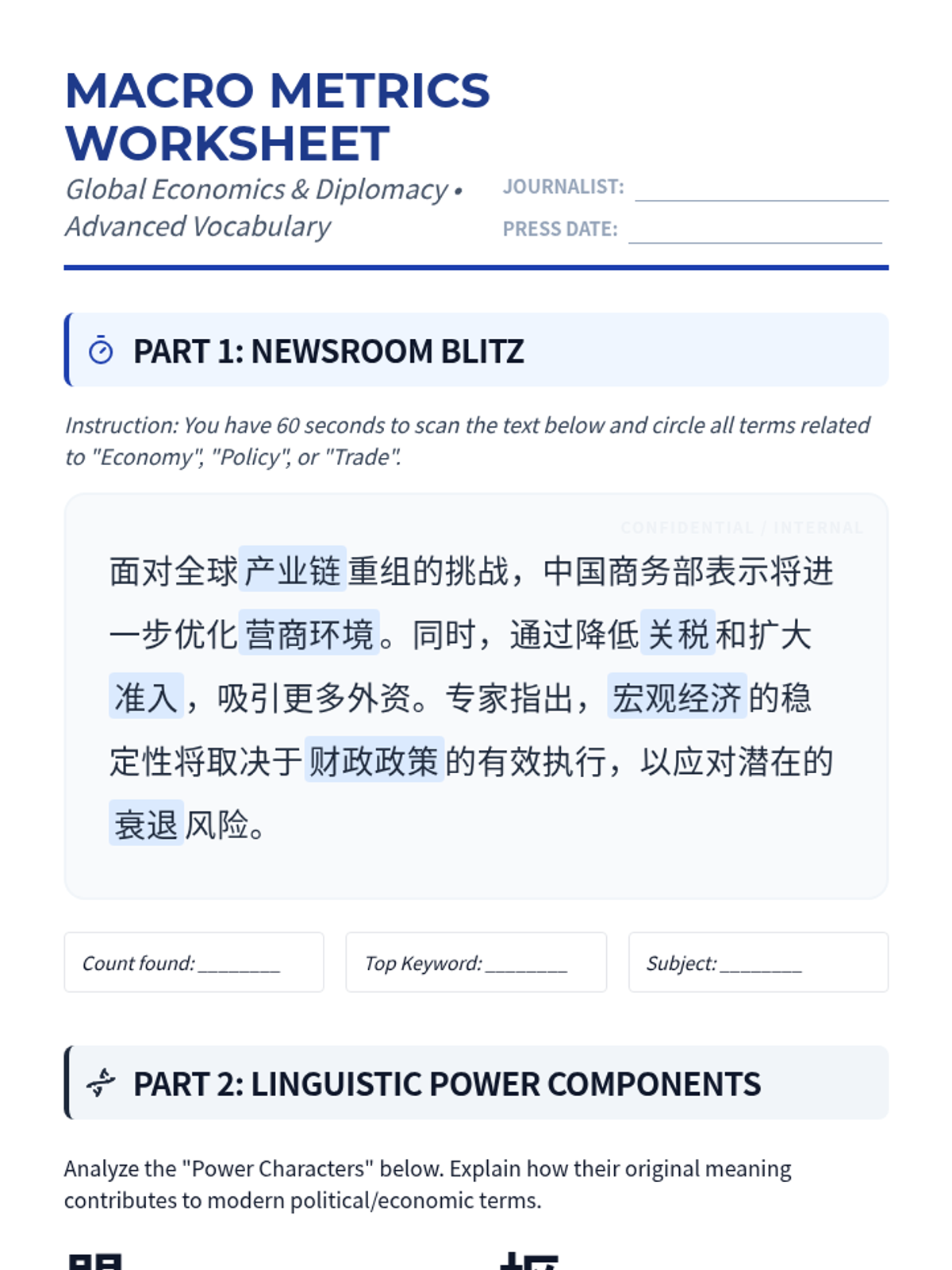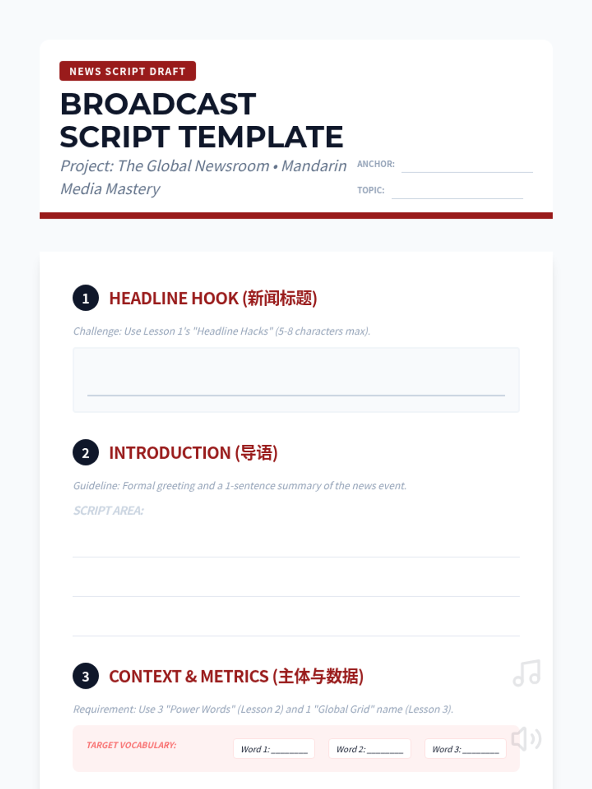This sequence equips advanced Mandarin students with the linguistic tools to navigate modern Chinese media, focusing on the specific vocabulary, syntax, and cultural nuances found in headlines, political reports, and economic news. Students progress from decoding cryptic headlines to producing their own professional-style news broadcasts.