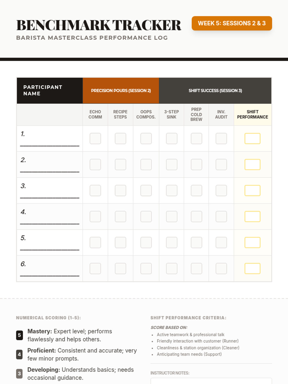 A specialized two-part training module focusing on order accuracy and professional equipment maintenance for aspiring baristas.
