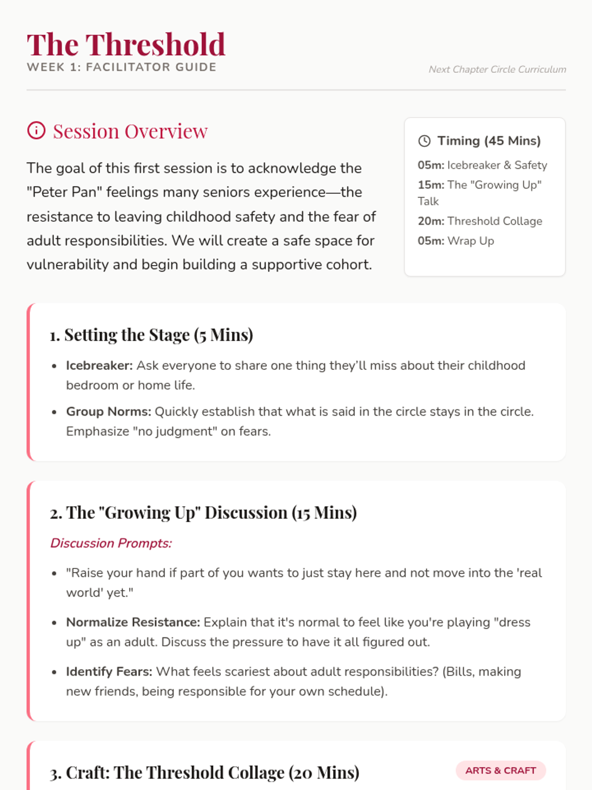 A comprehensive 8-week curriculum for high school senior girls transitioning to college. The program combines group counseling techniques with hands-on arts and crafts to address stress management, resource-seeking, and the emotional complexity of adulthood.