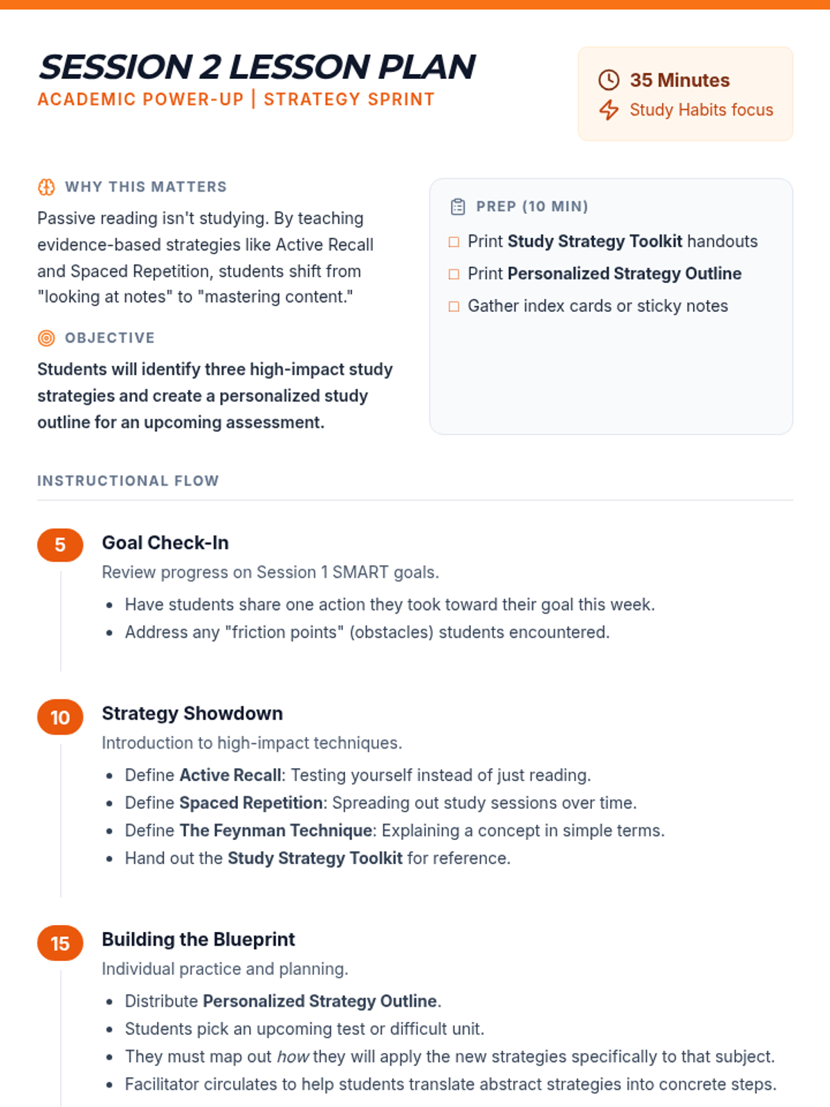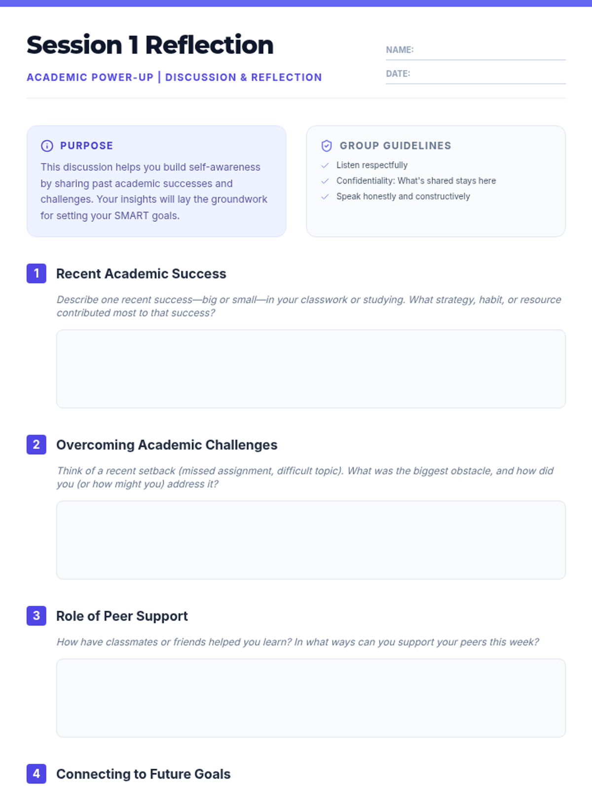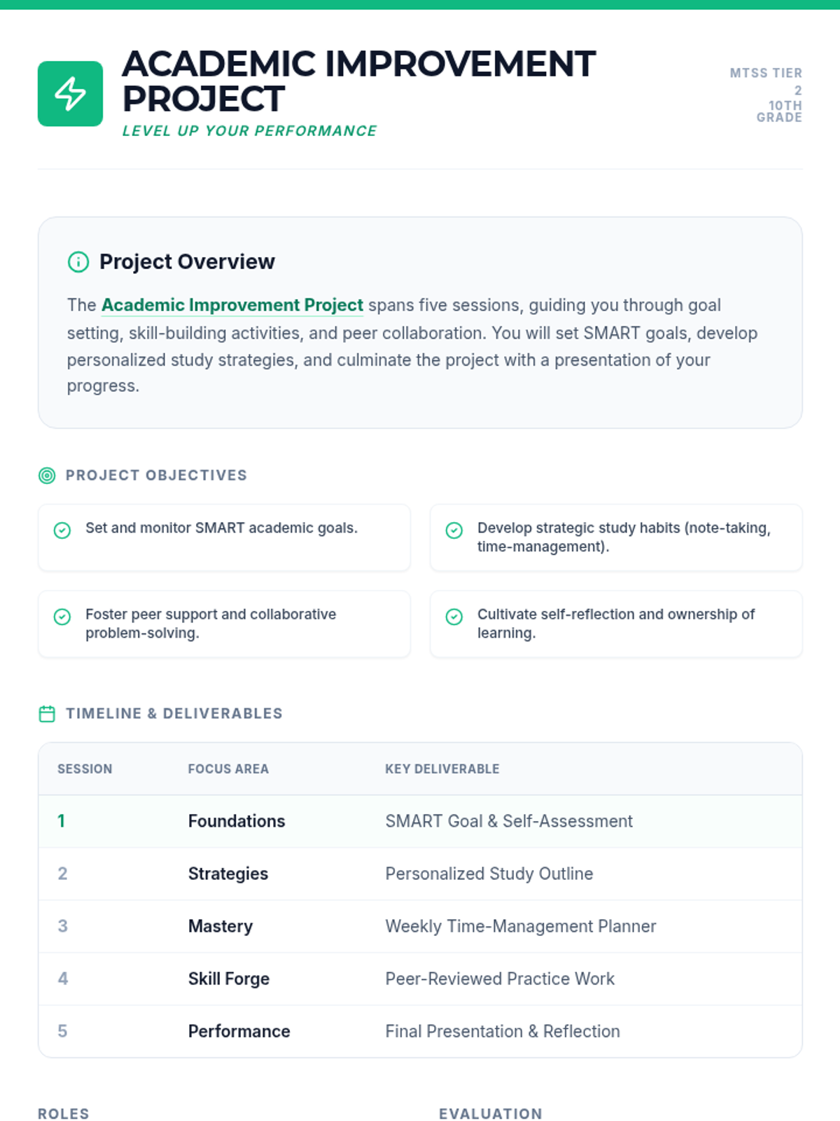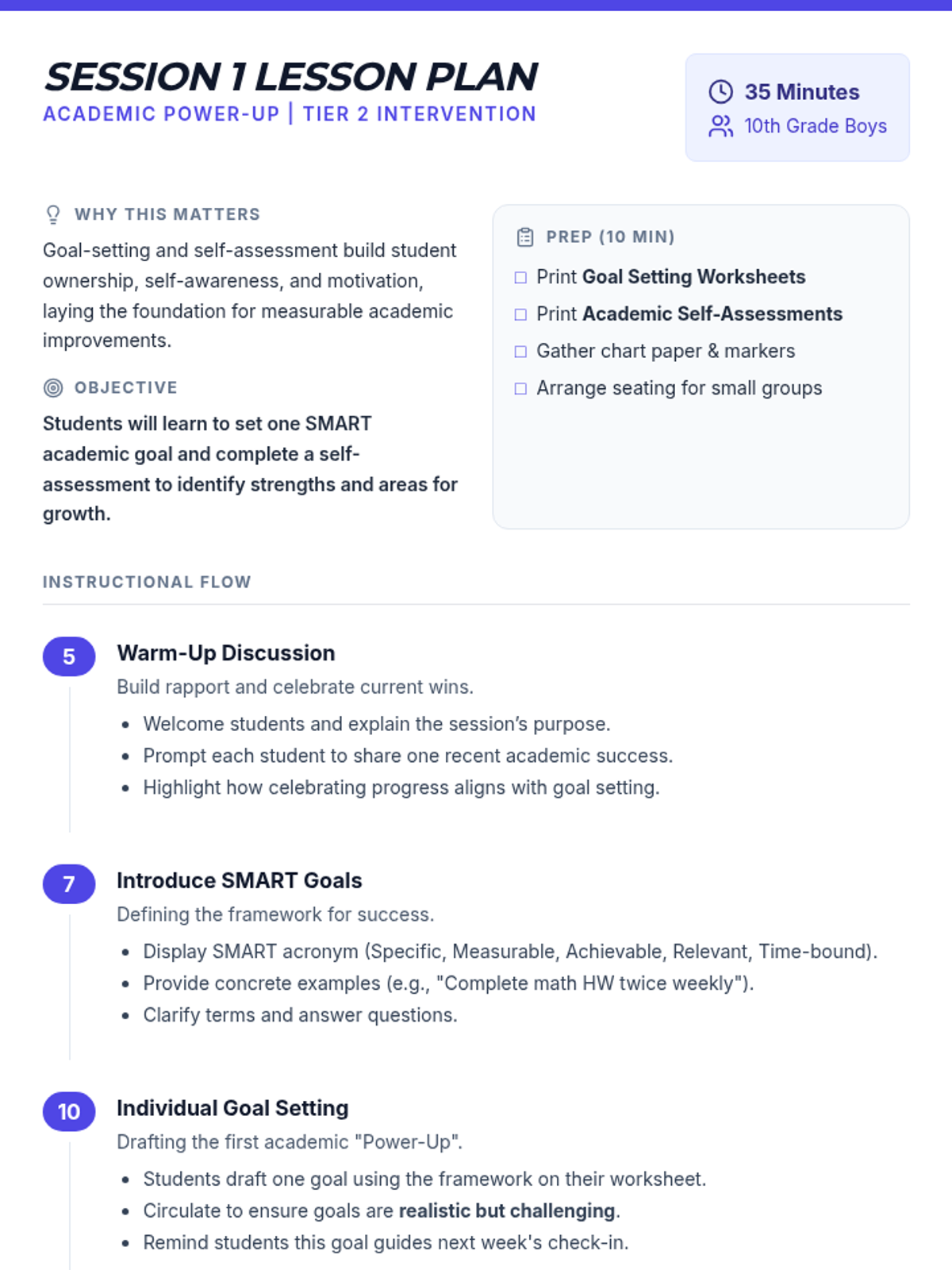 A comprehensive five-session Tier 2 intervention for 10th-grade boys focused on goal setting, study habits, and academic accountability. This sequence provides a structured pathway for students to take ownership of their learning and drive measurable academic improvement.