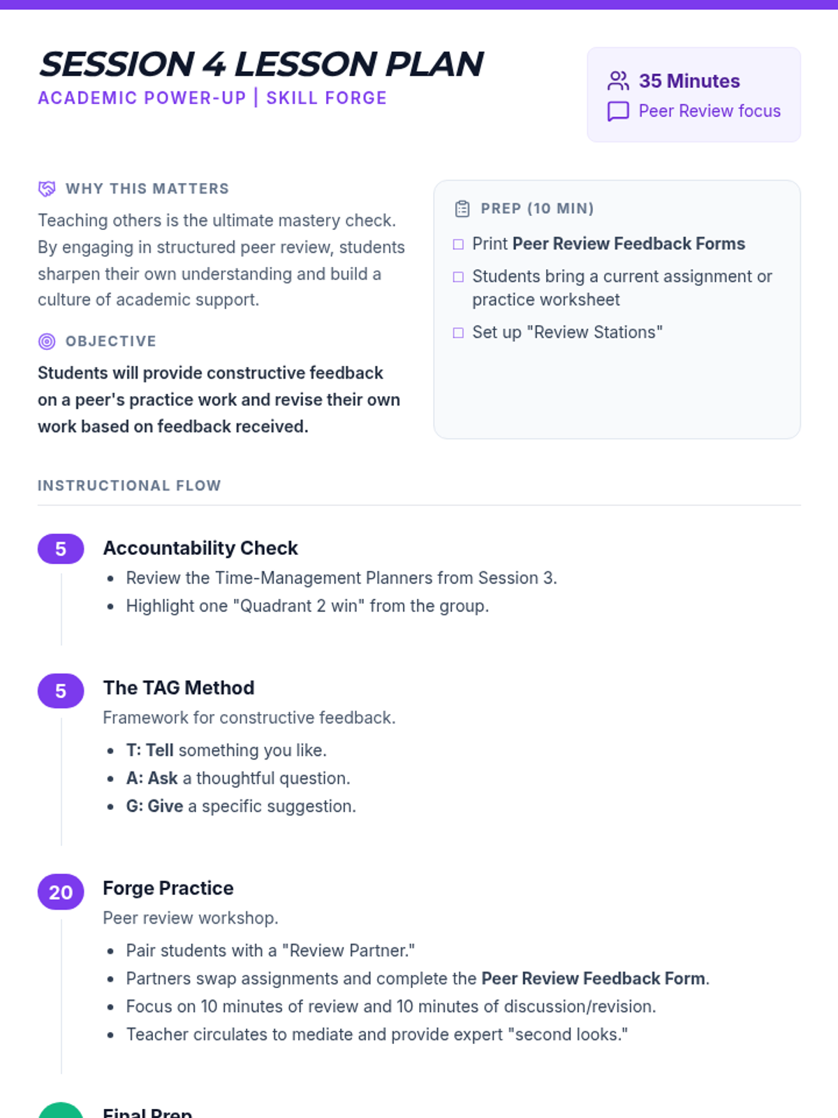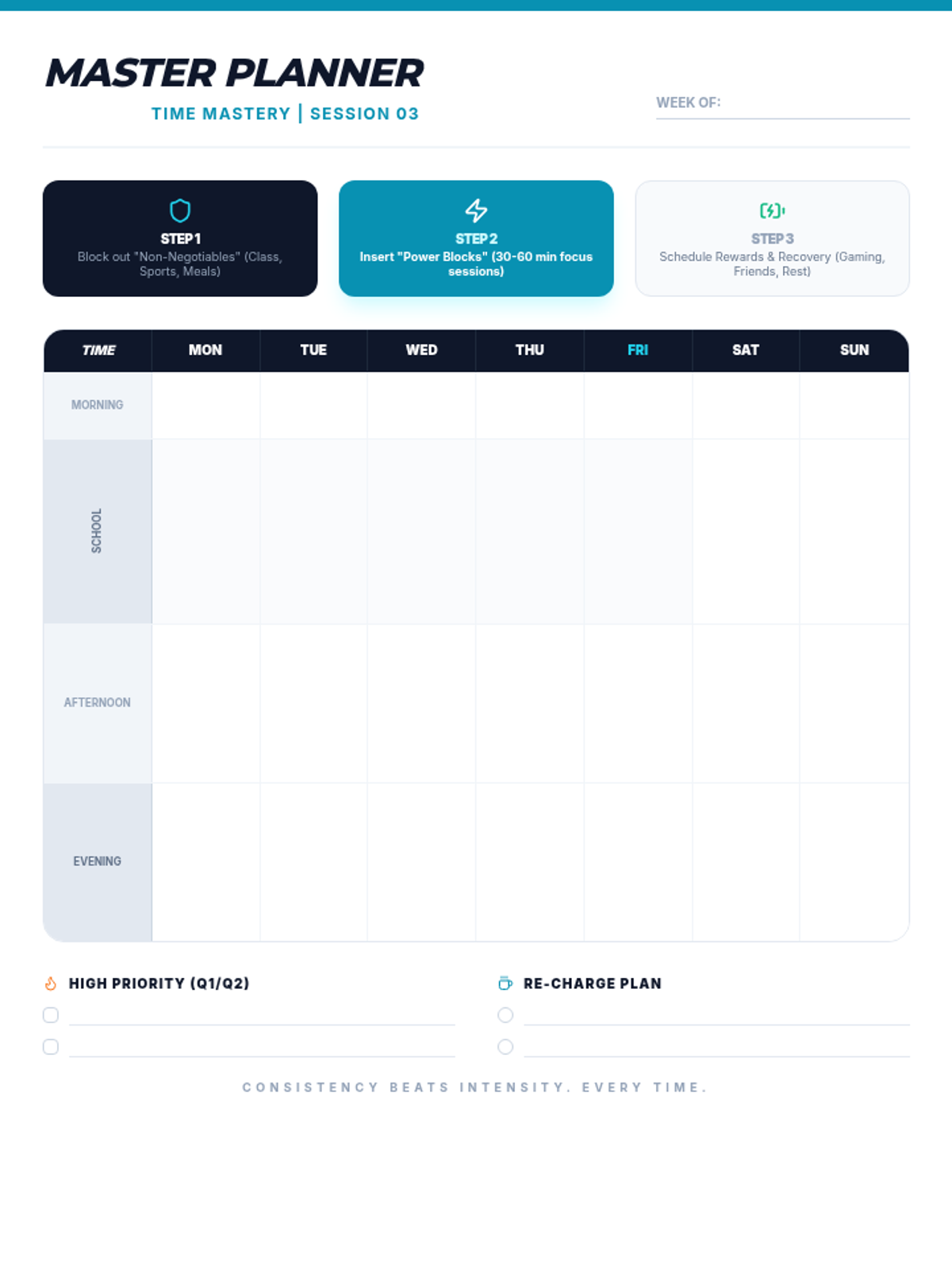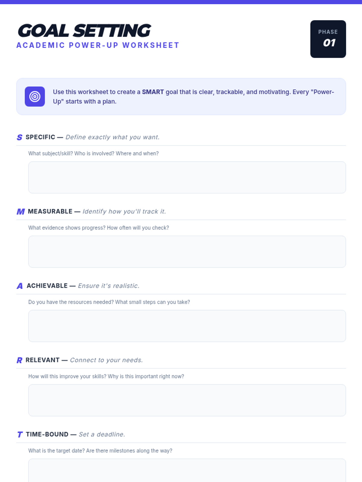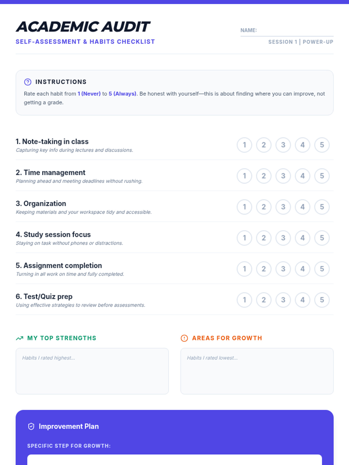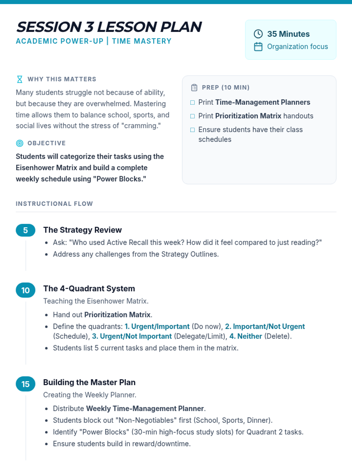 A comprehensive five-session Tier 2 intervention for 10th-grade boys focused on goal setting, study habits, and academic accountability. This sequence provides a structured pathway for students to take ownership of their learning and drive measurable academic improvement.
