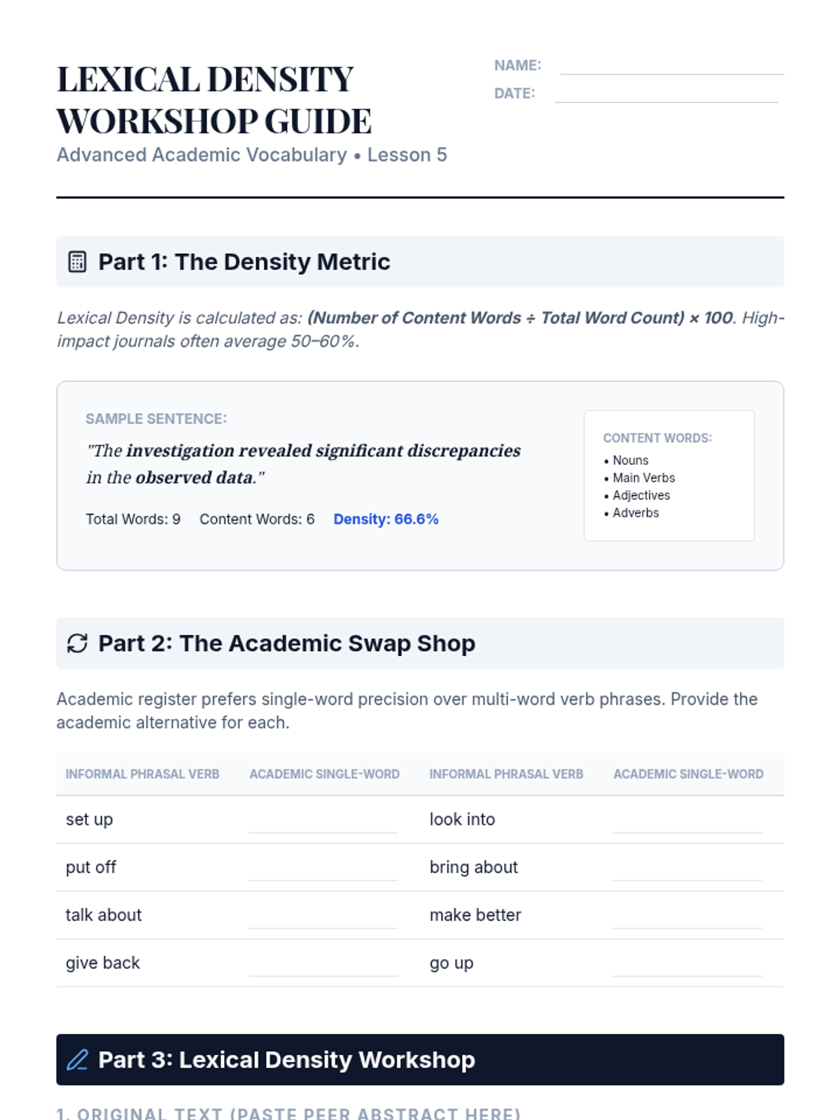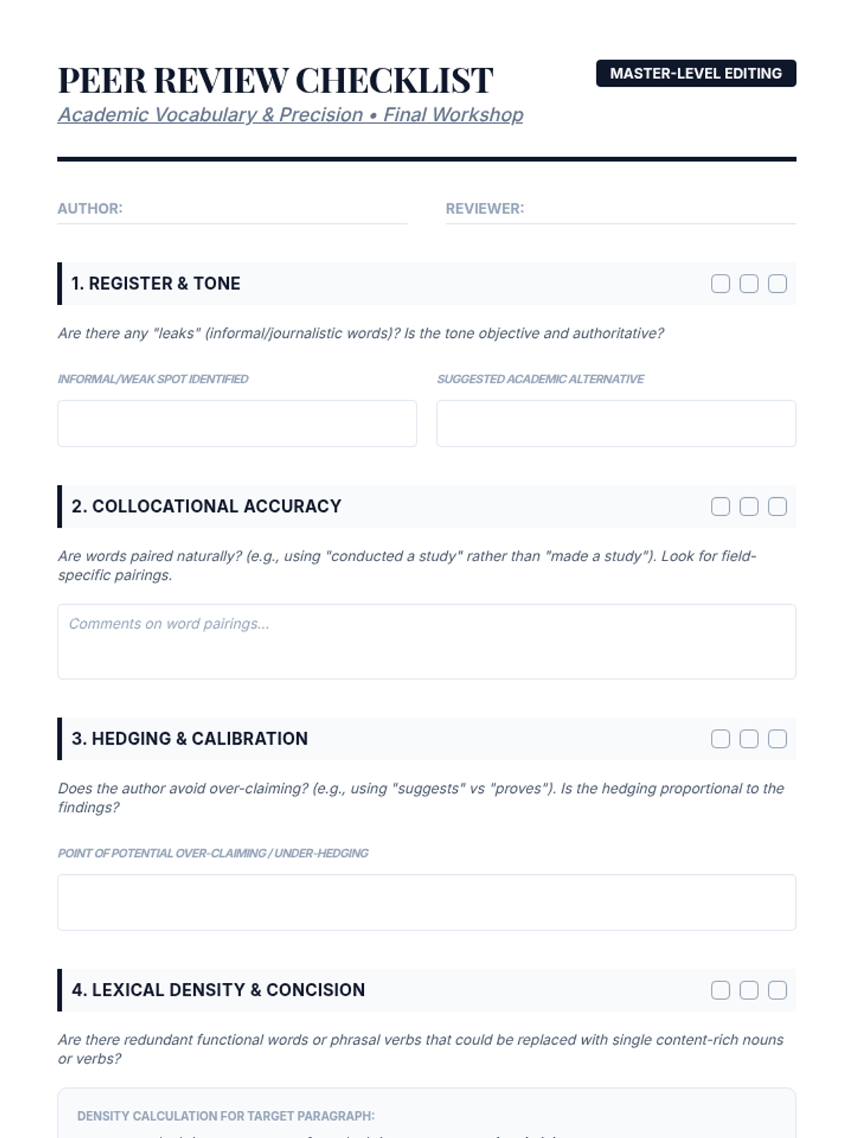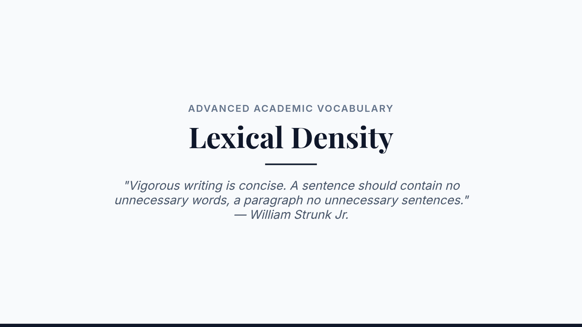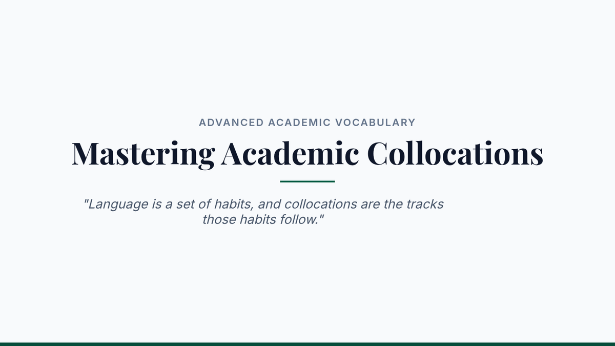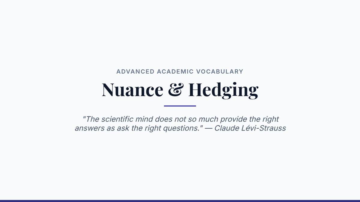 A comprehensive sequence for graduate students focusing on advanced academic vocabulary, register, collocations, etymology, and hedging strategies in research writing. Students move from analysis to application, culminating in a lexical density editing workshop.