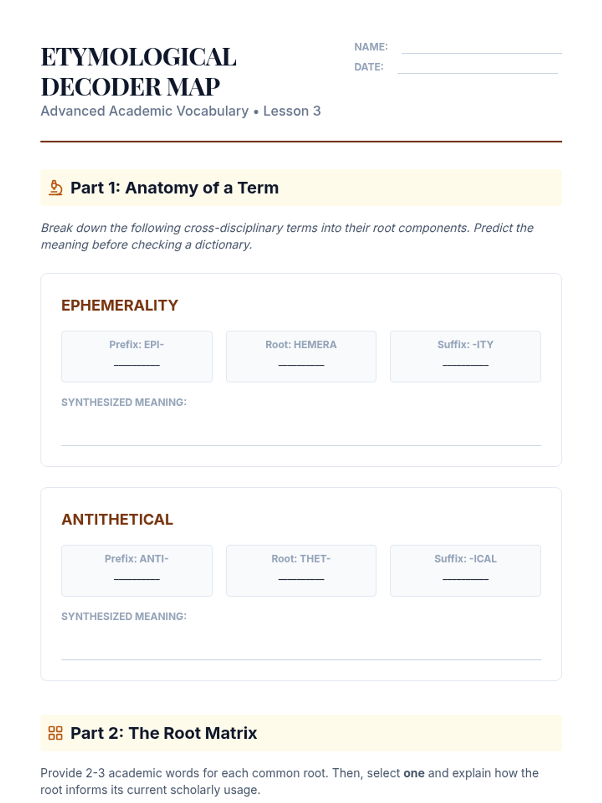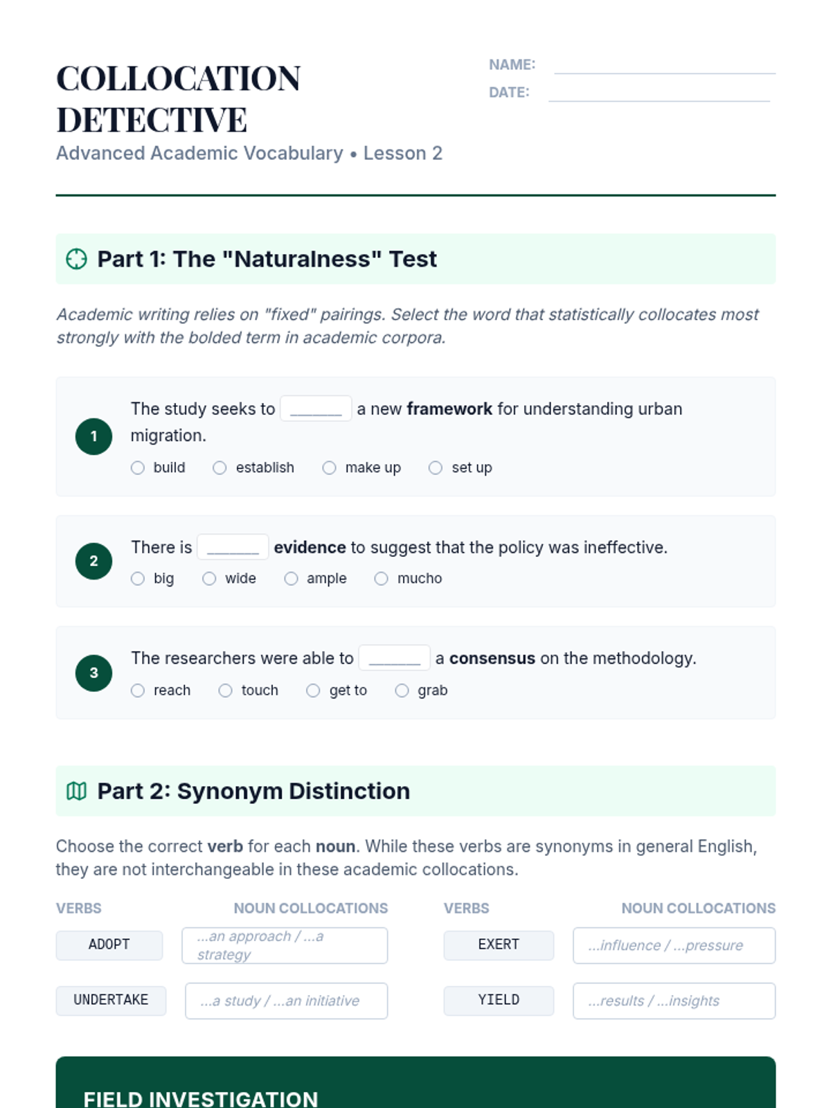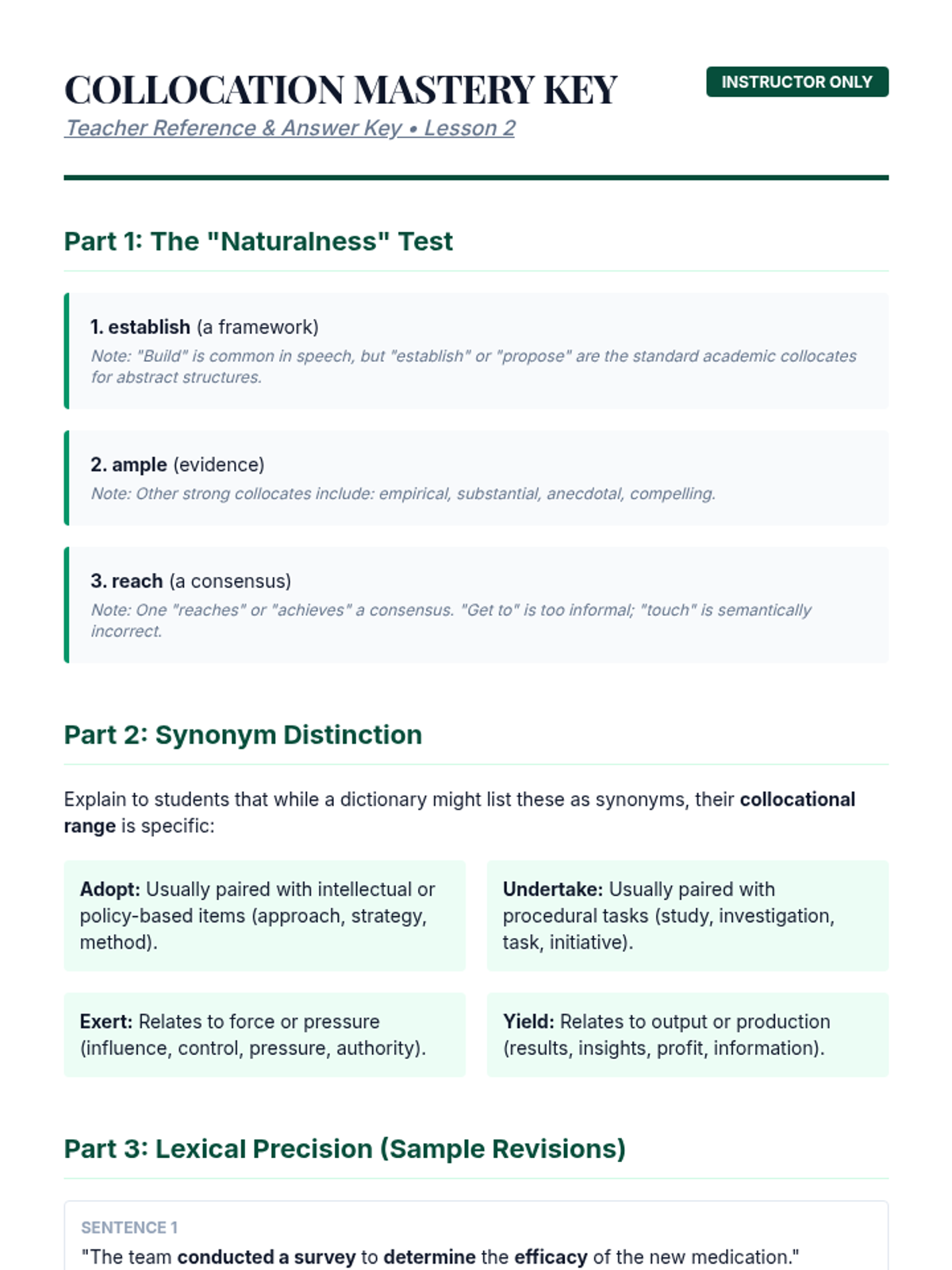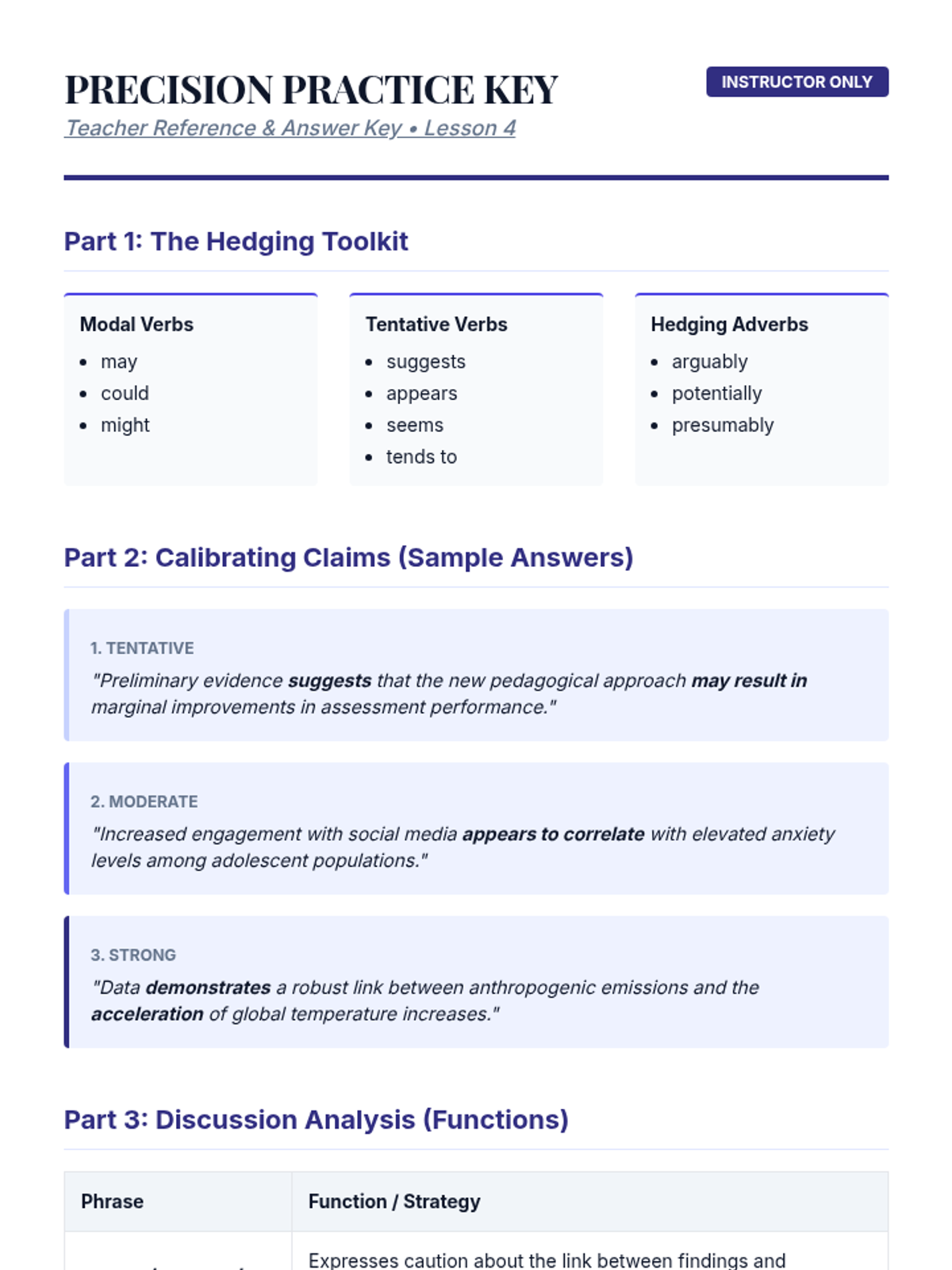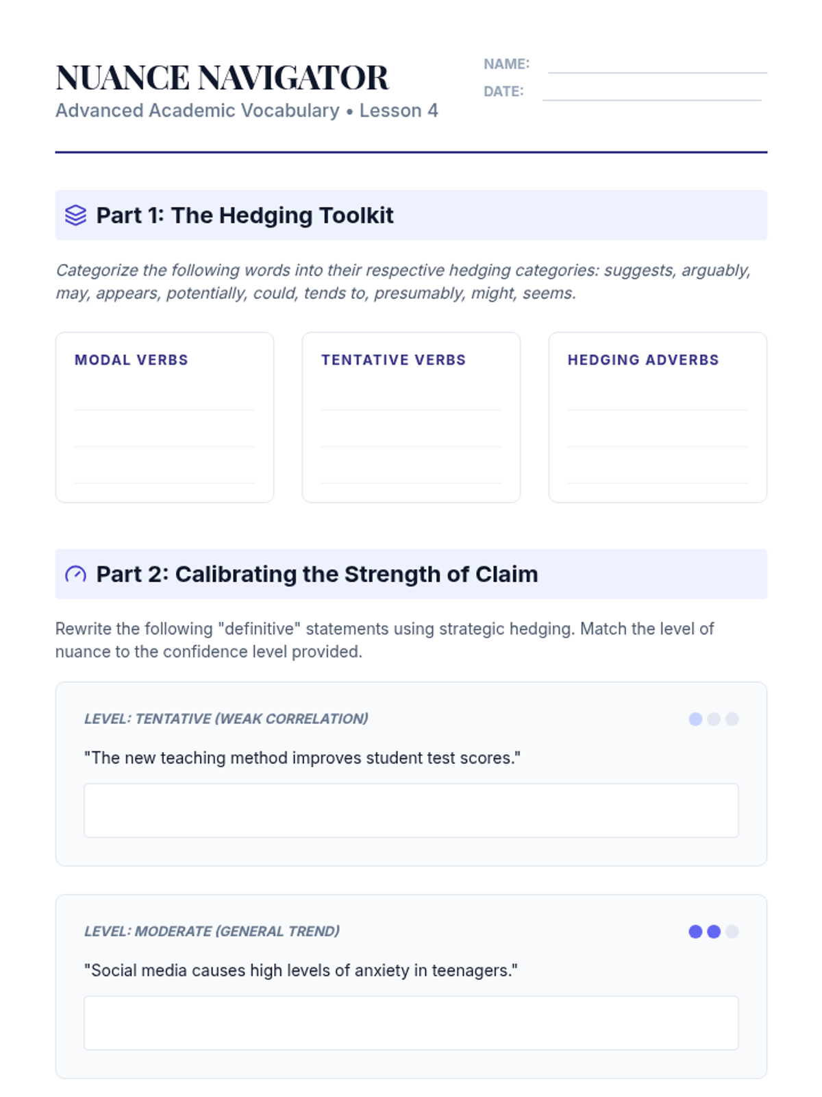 A comprehensive sequence for graduate students focusing on advanced academic vocabulary, register, collocations, etymology, and hedging strategies in research writing. Students move from analysis to application, culminating in a lexical density editing workshop.