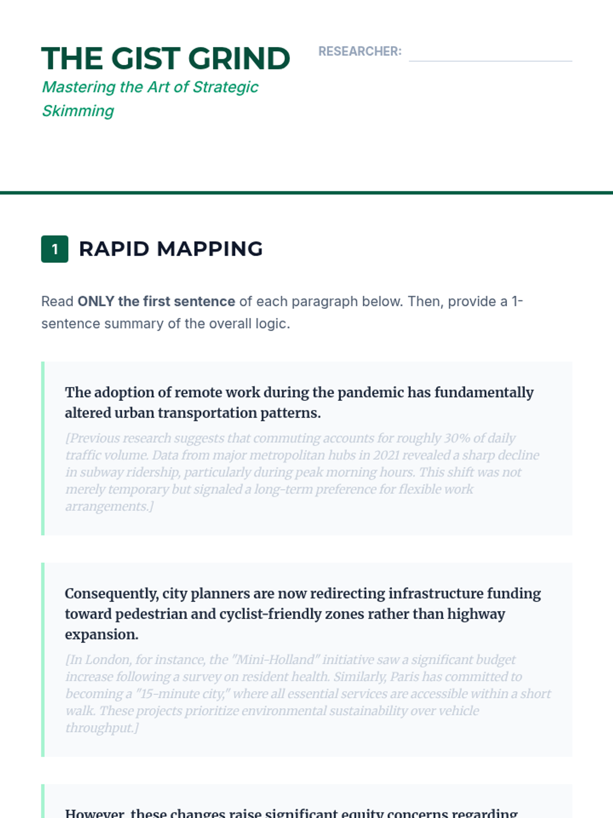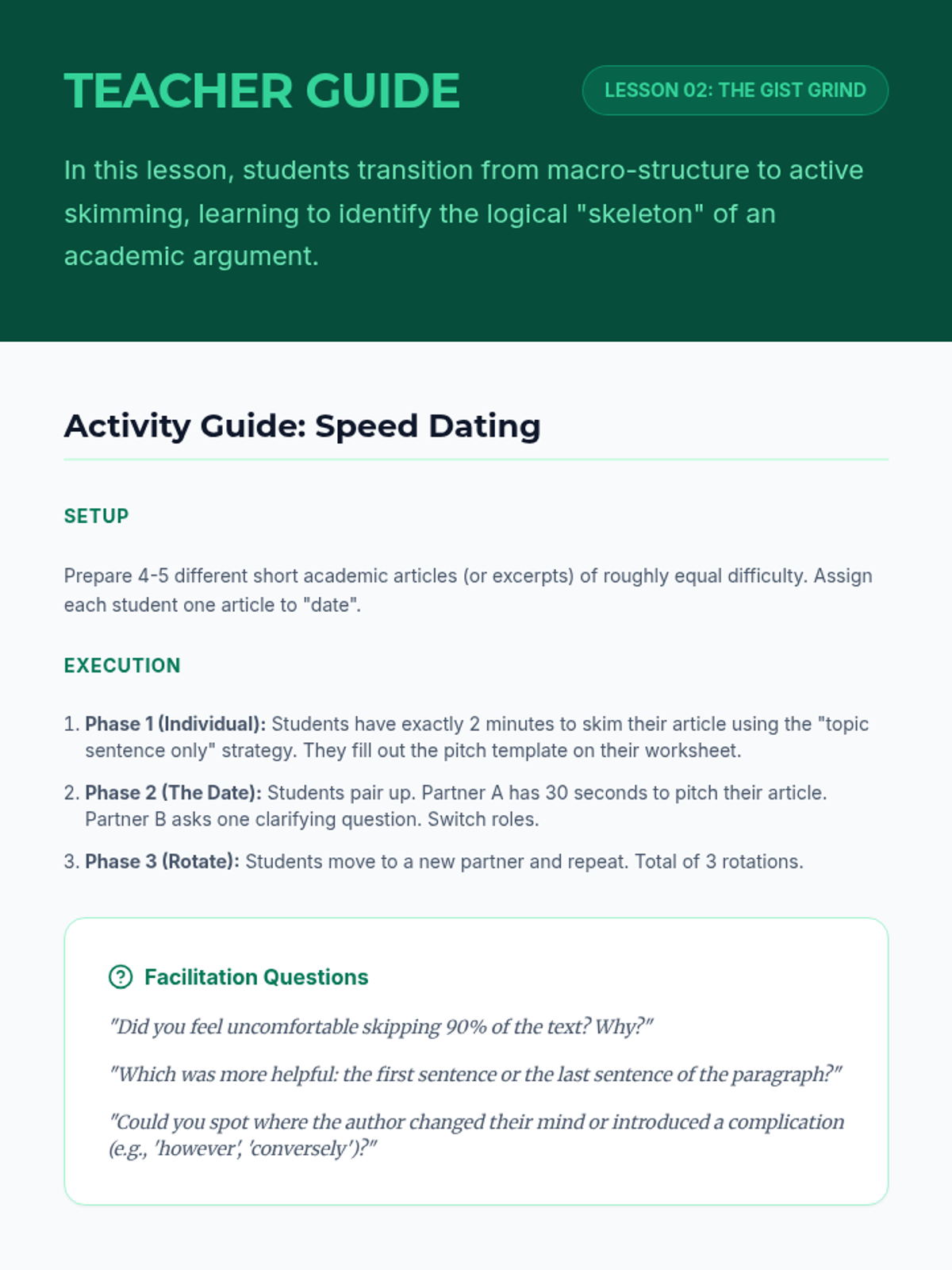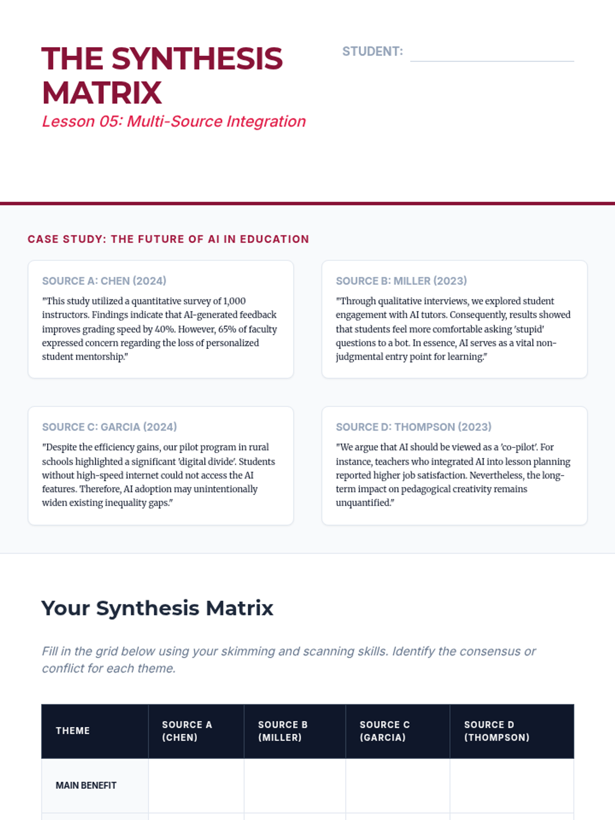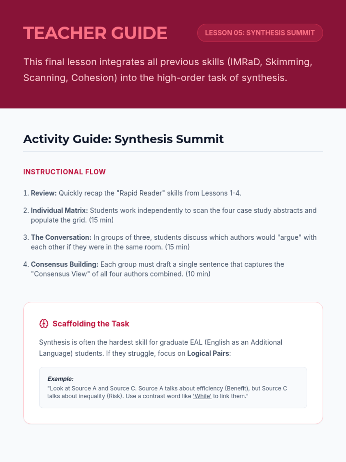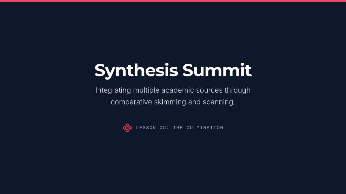 A comprehensive sequence for graduate students focusing on advanced academic reading strategies, including IMRaD deconstruction, skimming, scanning, paragraph cohesion, and multi-source synthesis.
