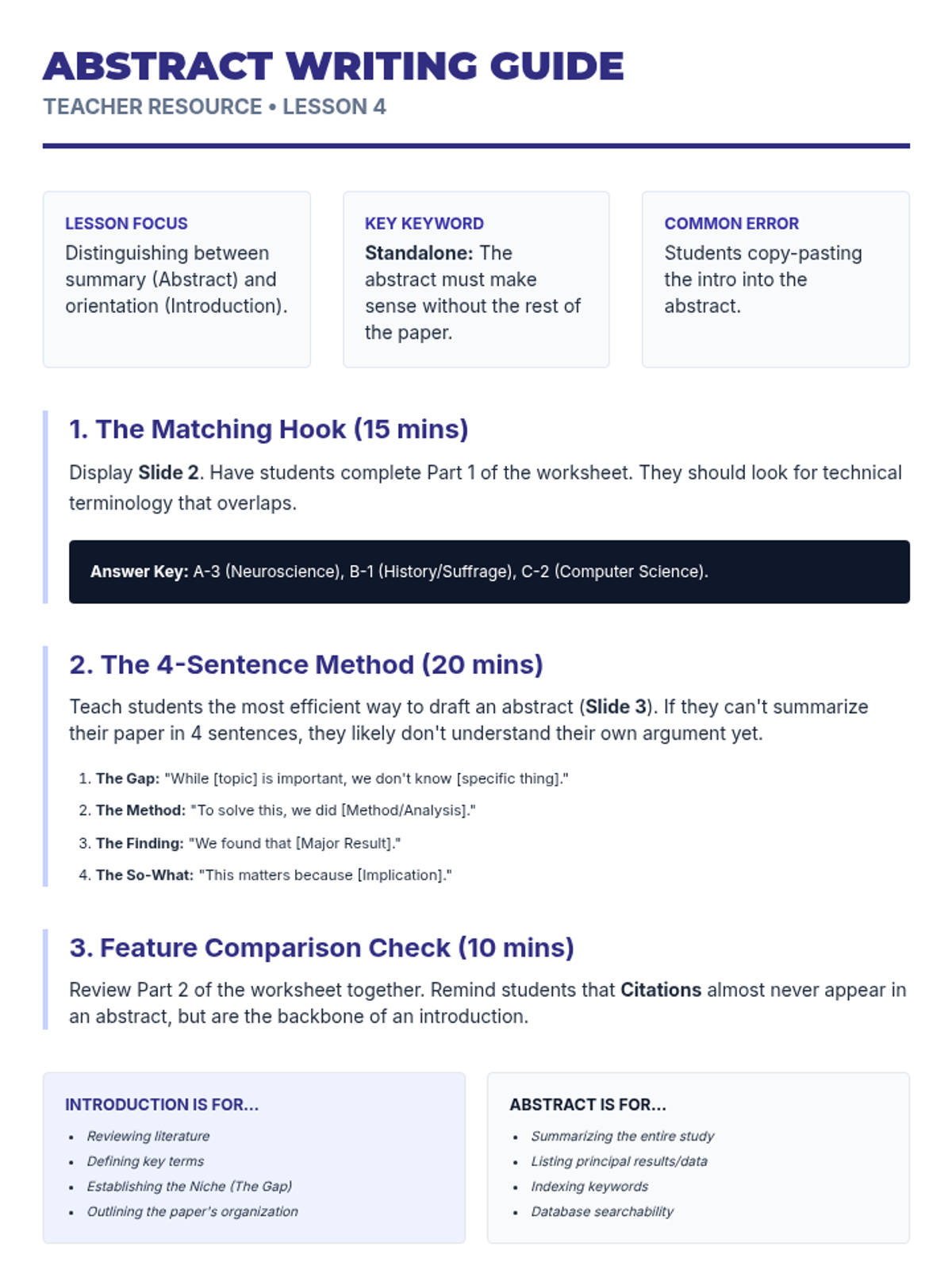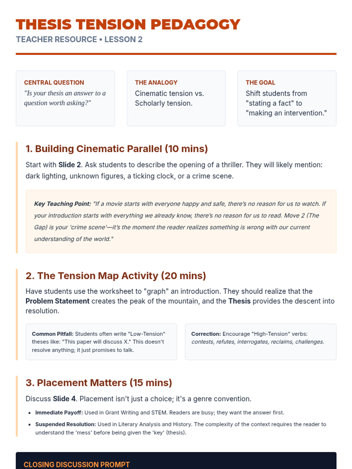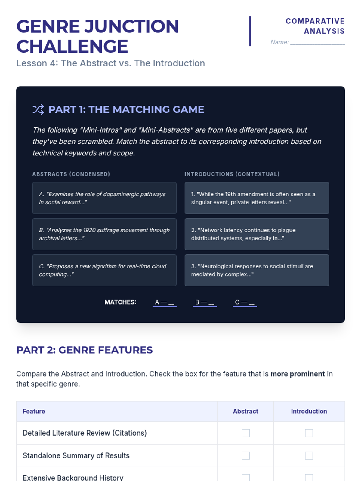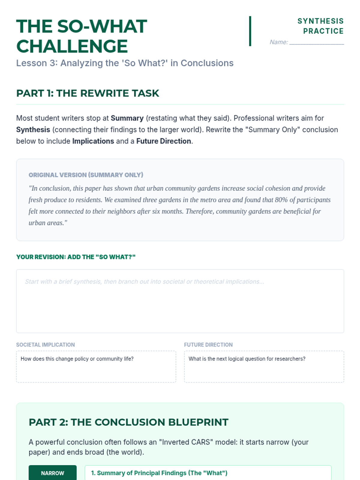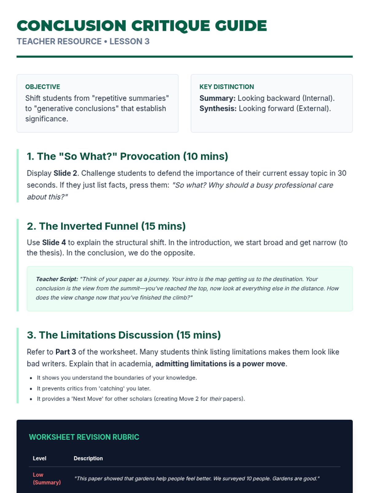 This sequence guides undergraduate students through a rhetorical deconstruction of academic writing, focusing on the specific 'moves' used in introductions and conclusions to establish research significance and contribute to scholarly conversations.