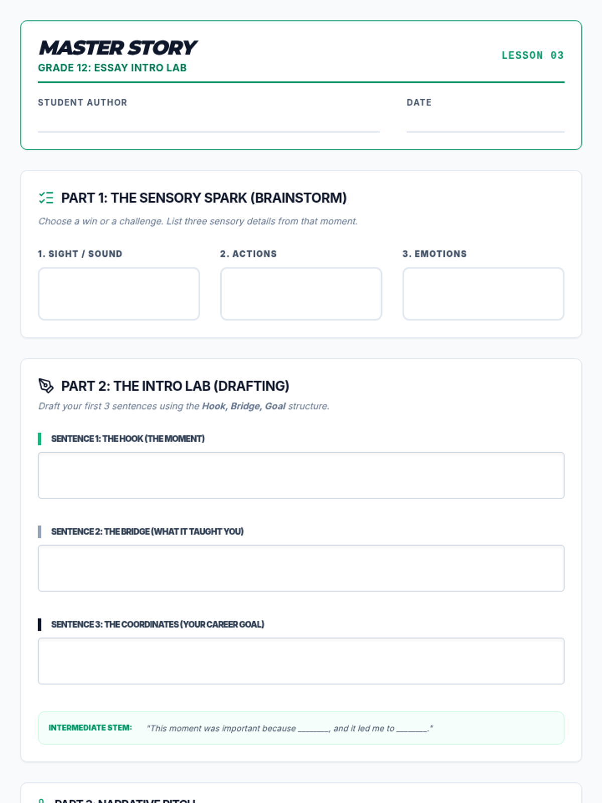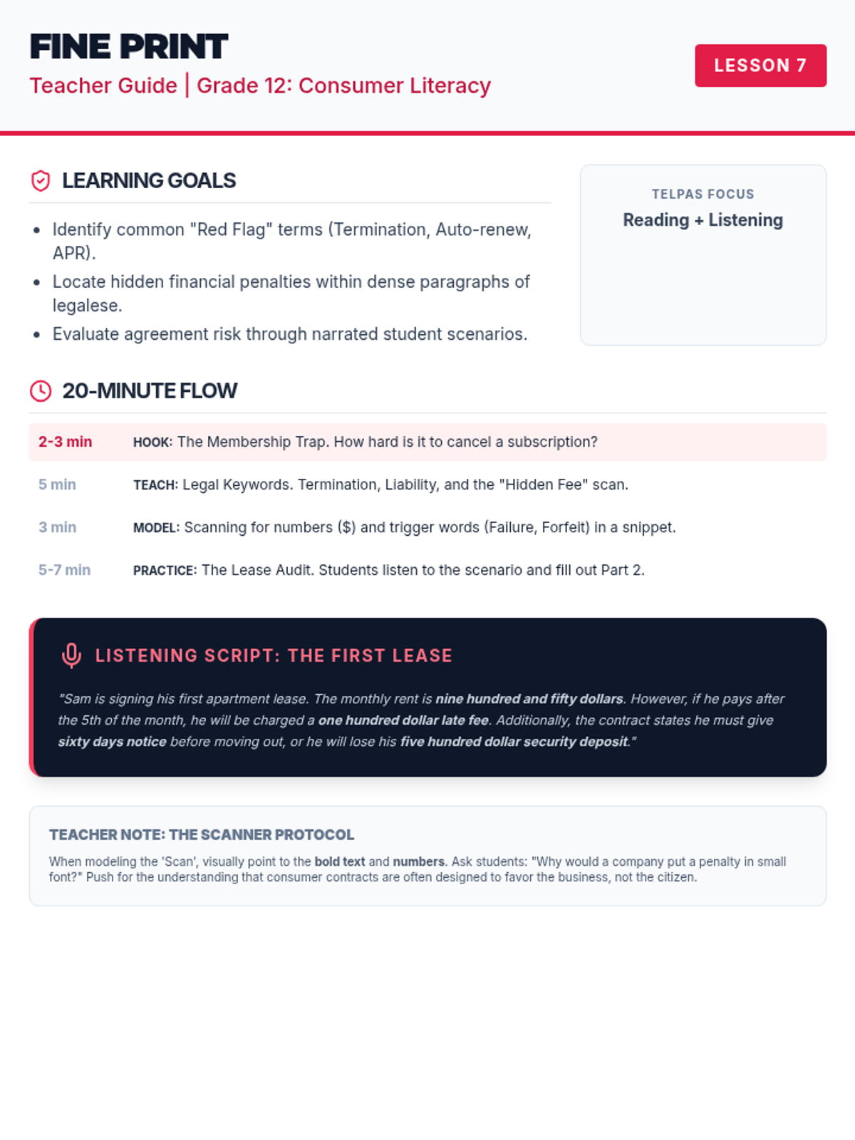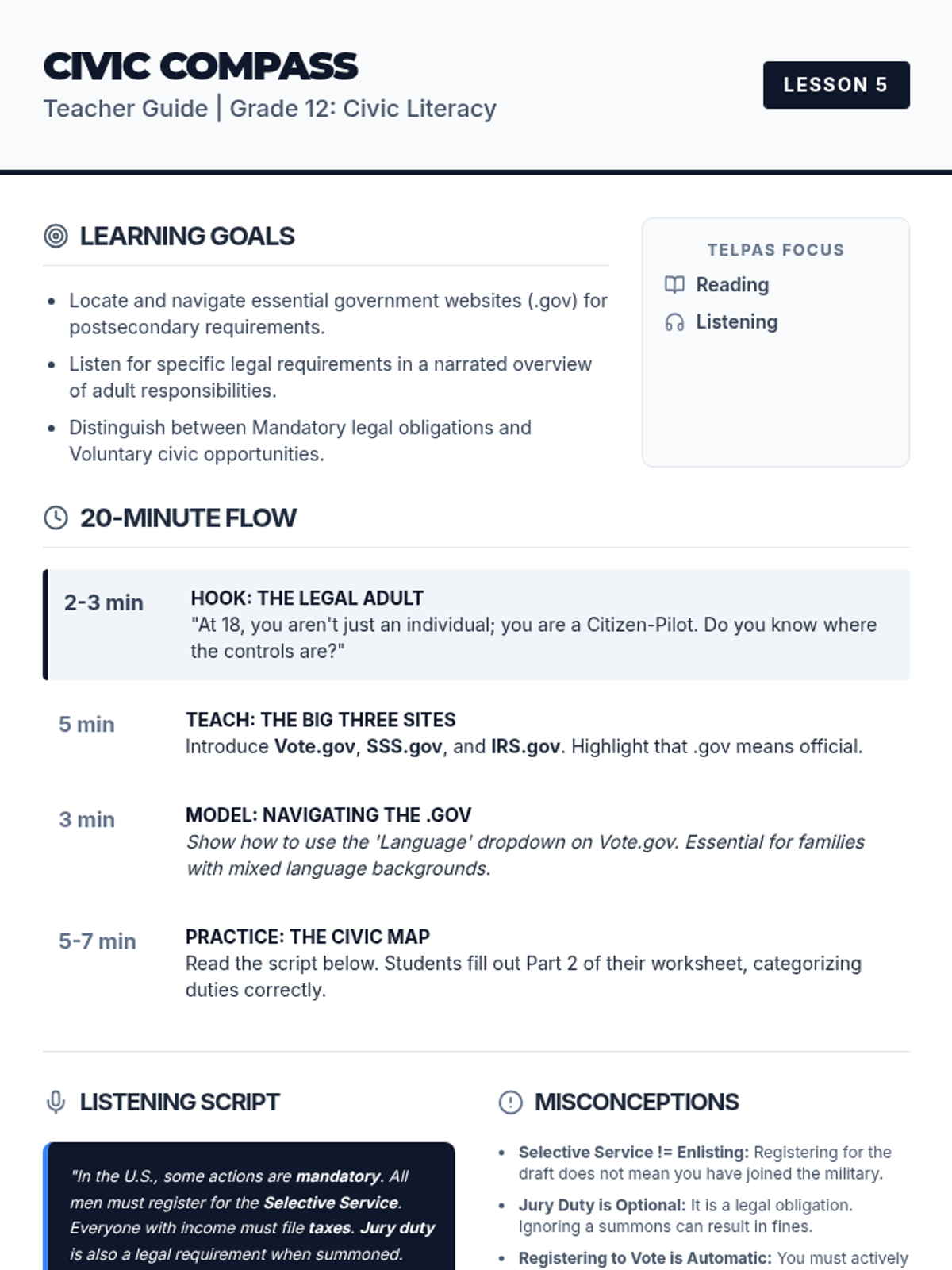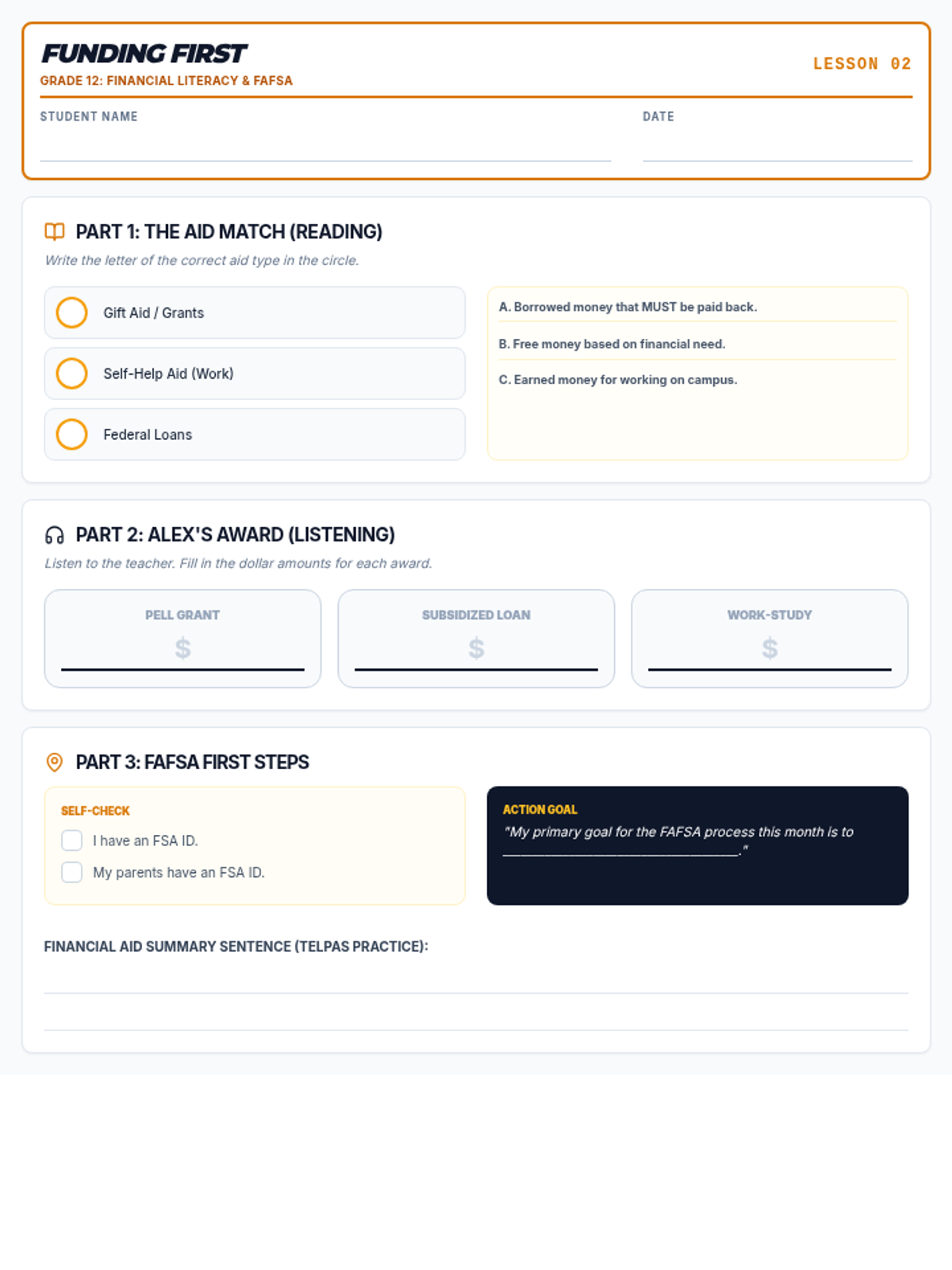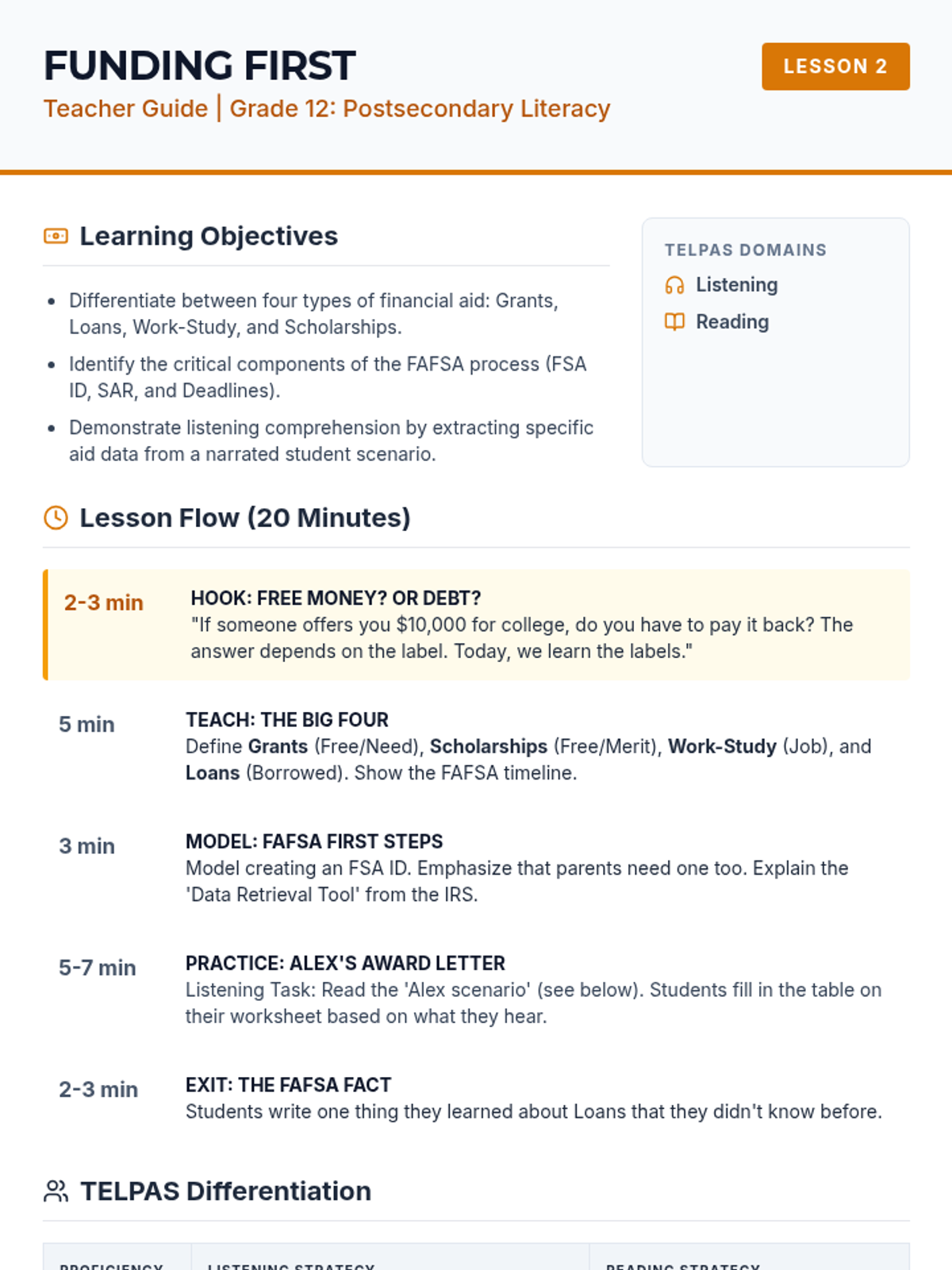 A comprehensive 18-lesson sequence for Grade 11 and 12 students focusing on academic scholarships, postsecondary literacy, and civic engagement, with integrated TELPAS support for English Language Learners.