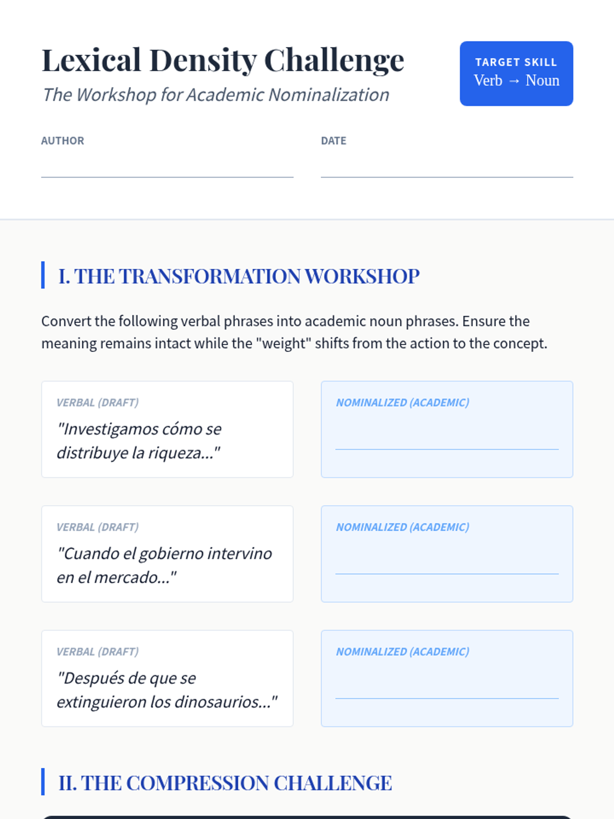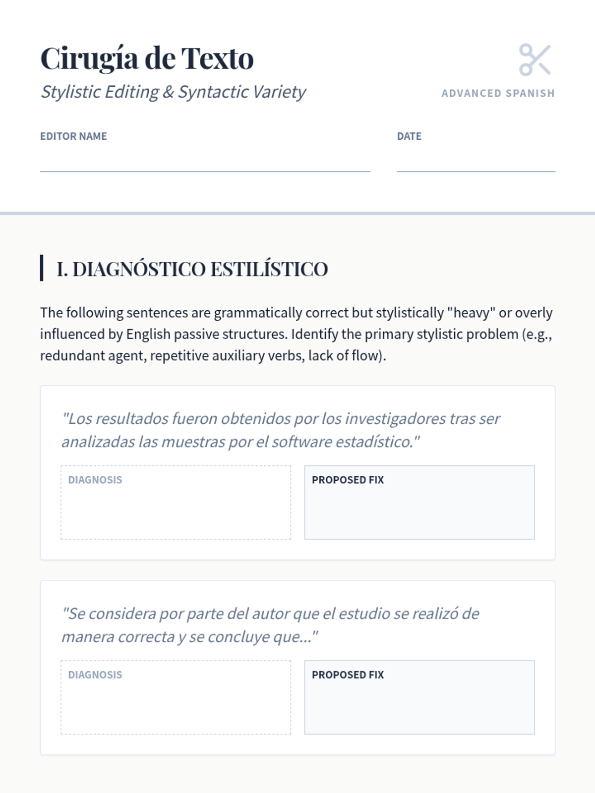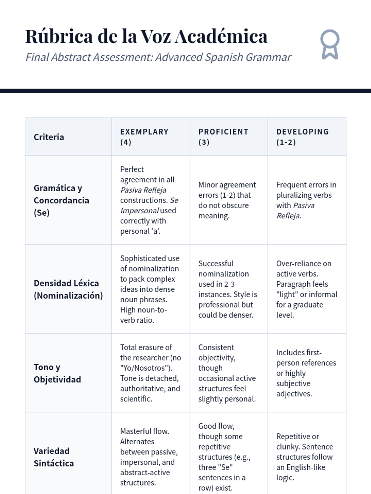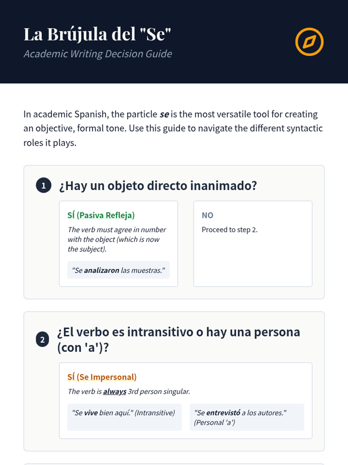 A comprehensive sequence for graduate students focusing on the grammatical tools required to achieve an objective academic tone in Spanish research writing. Students master the nuances of passive voice, impersonal 'se', and nominalization to enhance the authority and density of their scholarly work.