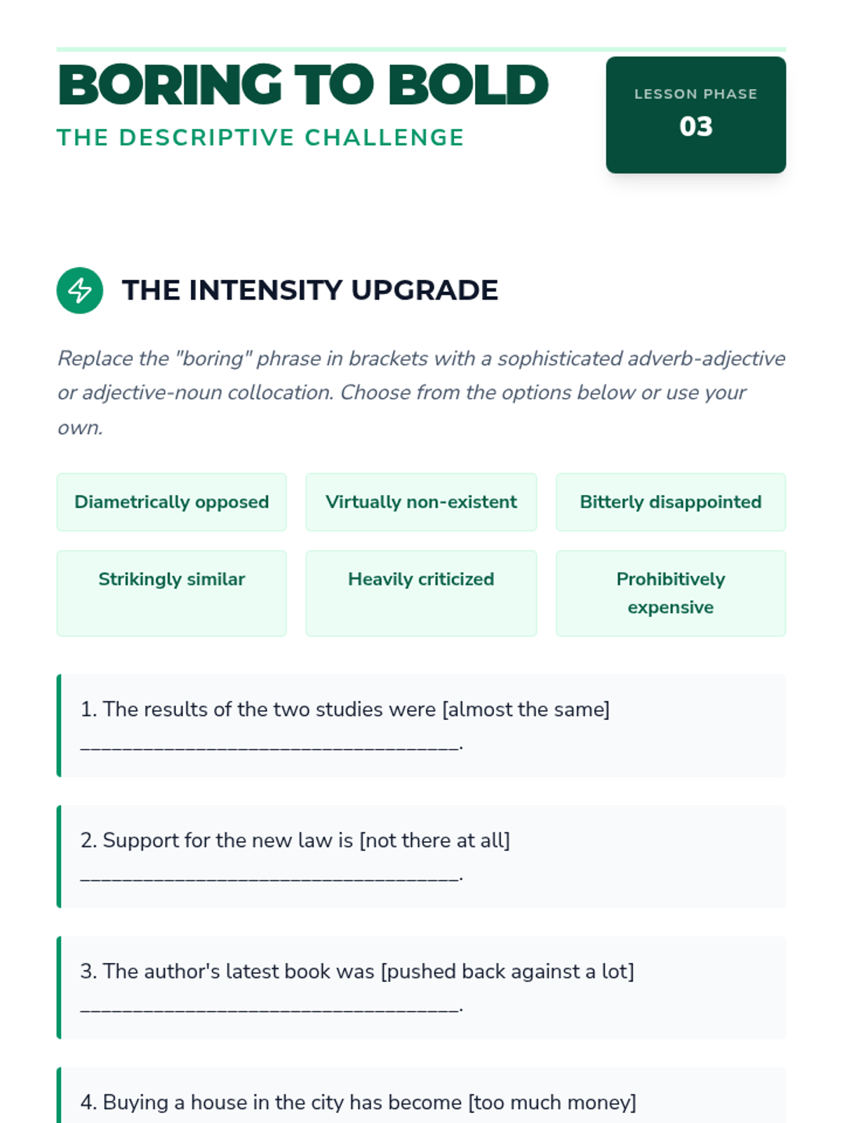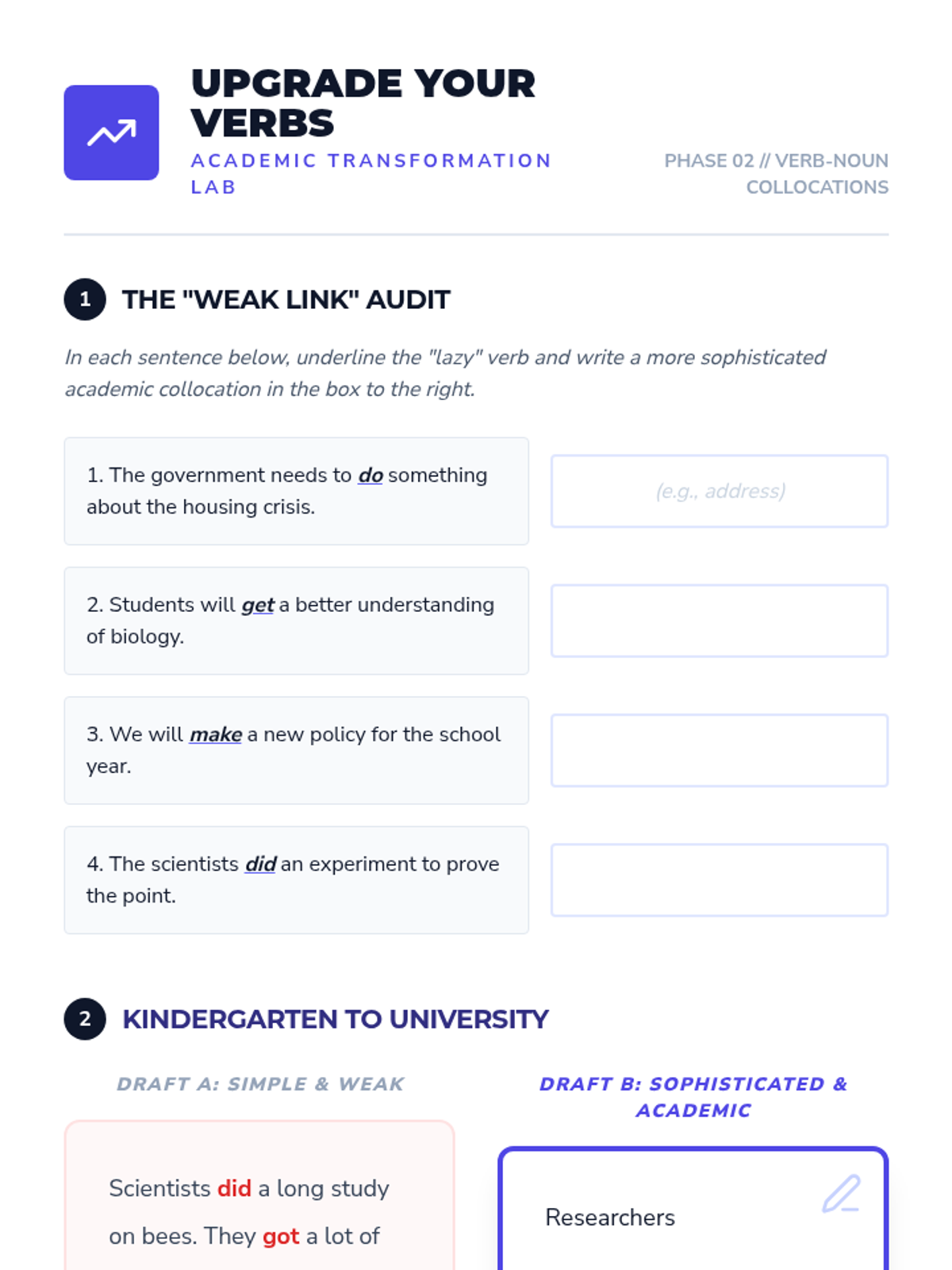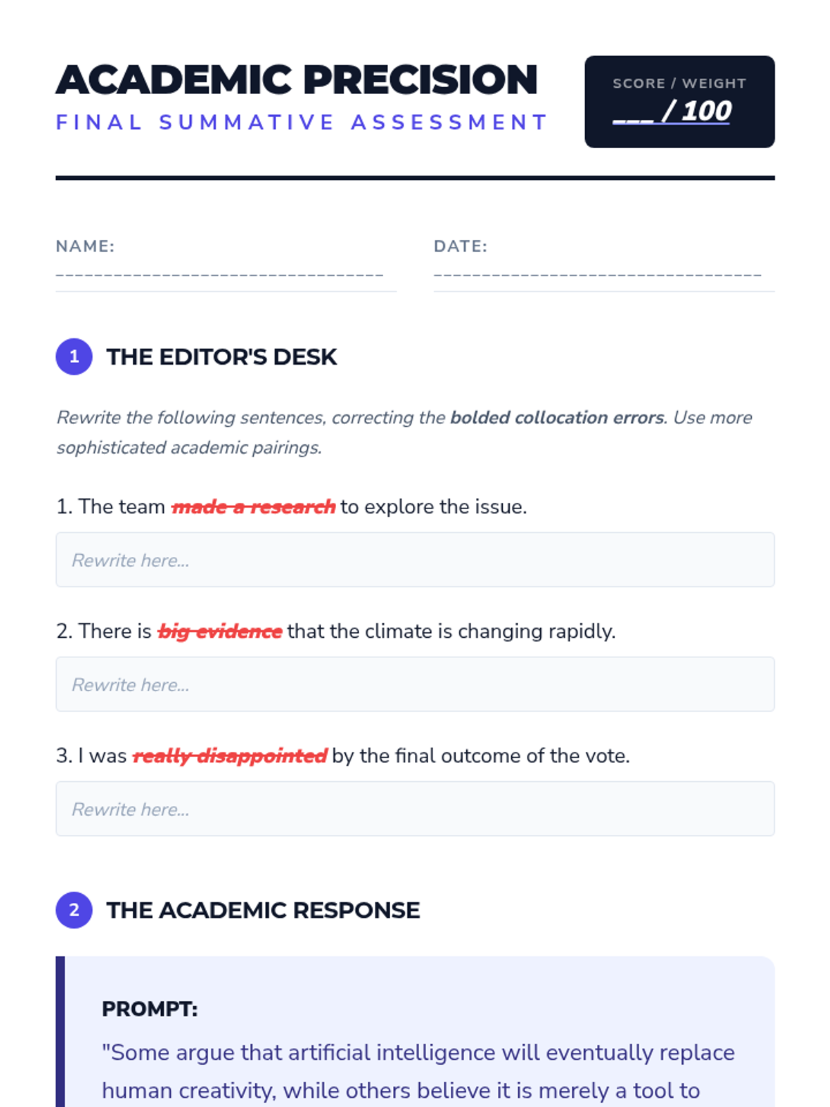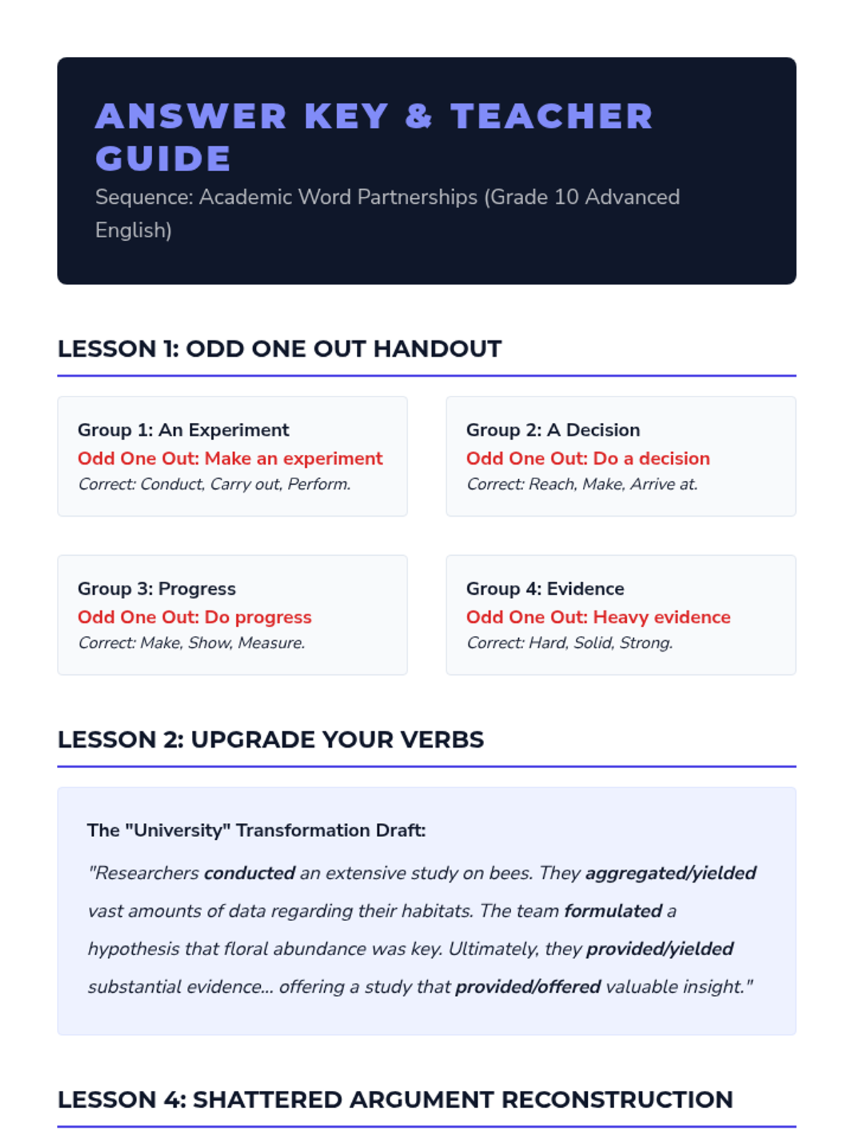 This sequence guides 10th-grade students through the nuances of academic collocations, helping them achieve native-like fluency by mastering natural word partnerships in formal English.
