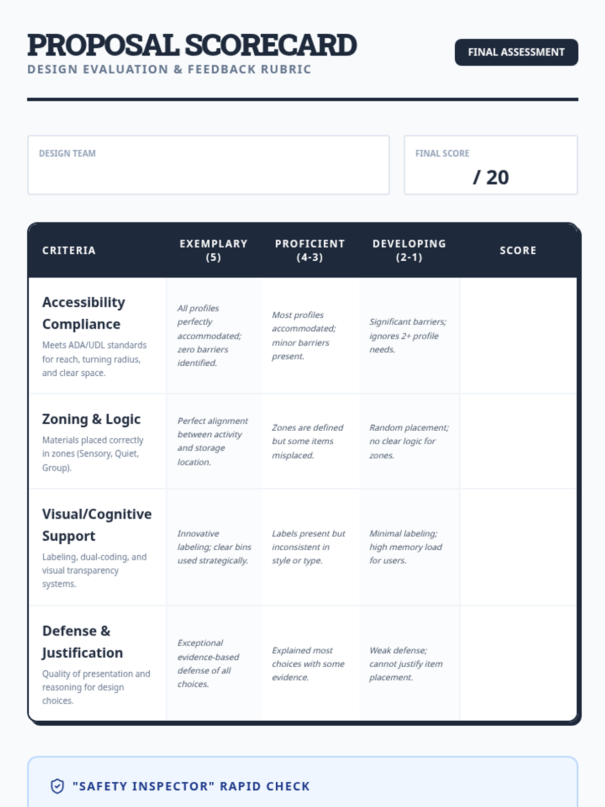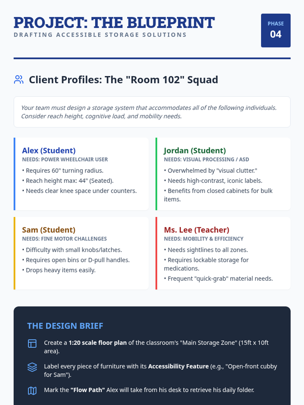 This project-based sequence guides students through the principles of spatial planning and accessibility within a special education setting. Students analyze how physical layouts influence behavior and independence, then apply these concepts to design a storage system for a hypothetical classroom.