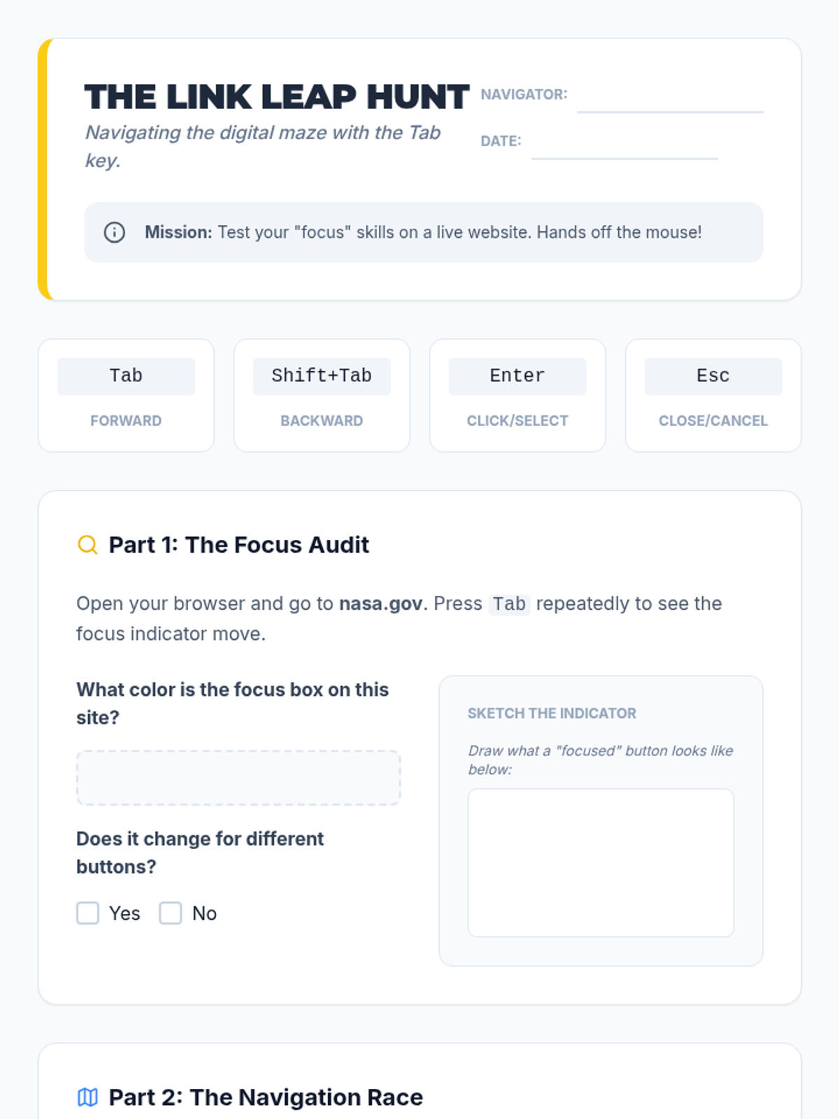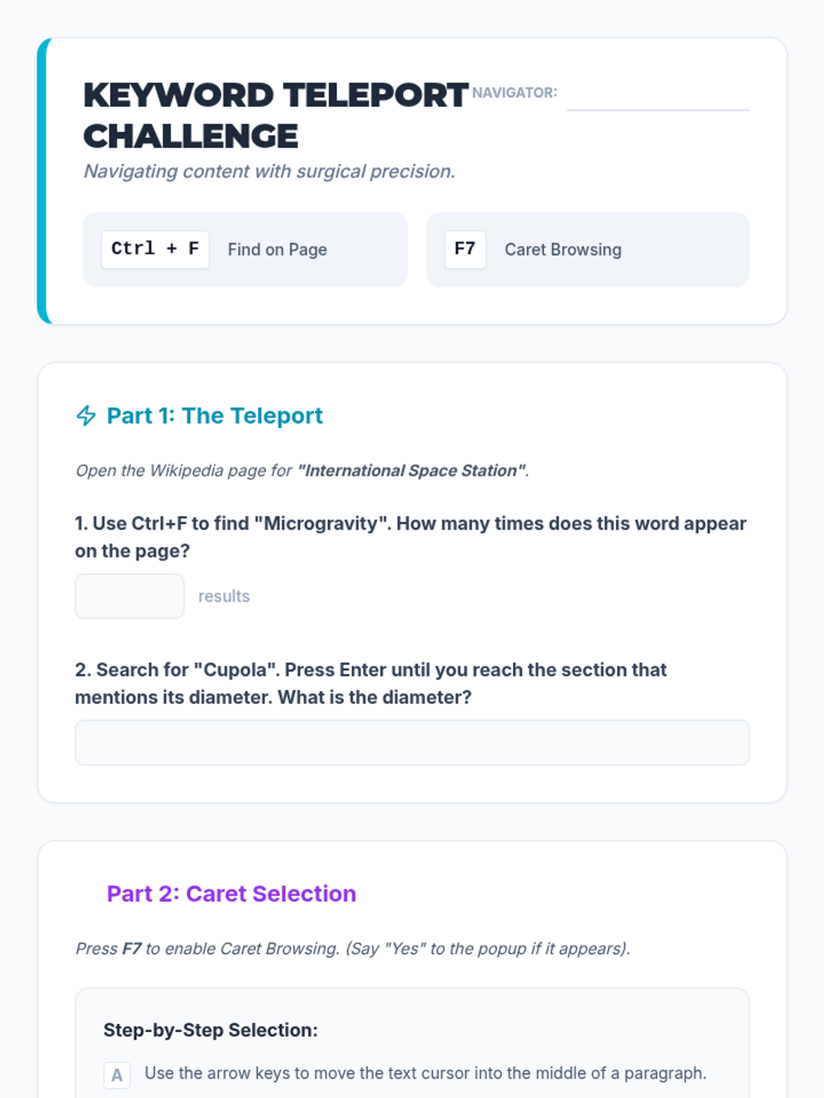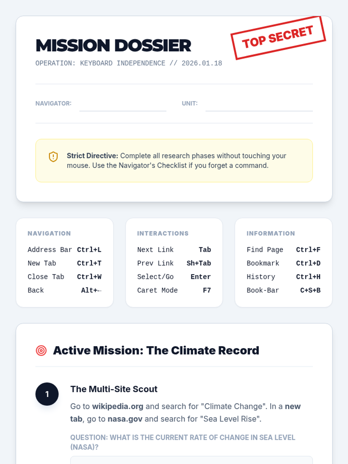 A sequence designed for 10th-grade students to master keyboard shortcut navigation within web browsers, promoting independence and accessibility for students with diverse needs. The progression moves from basic window and tab management to advanced search techniques and full keyboard-only research.