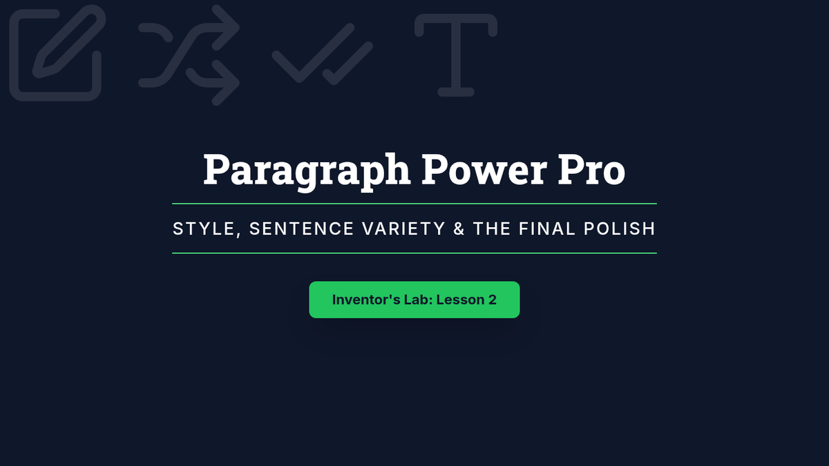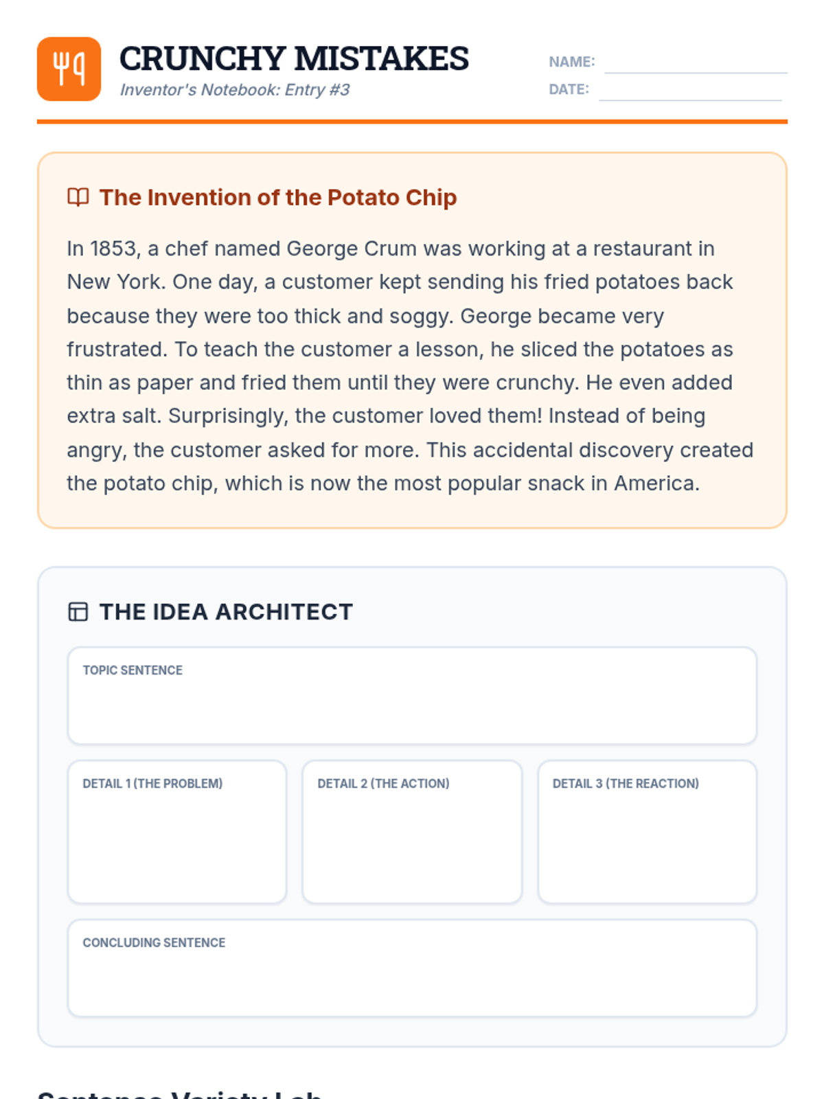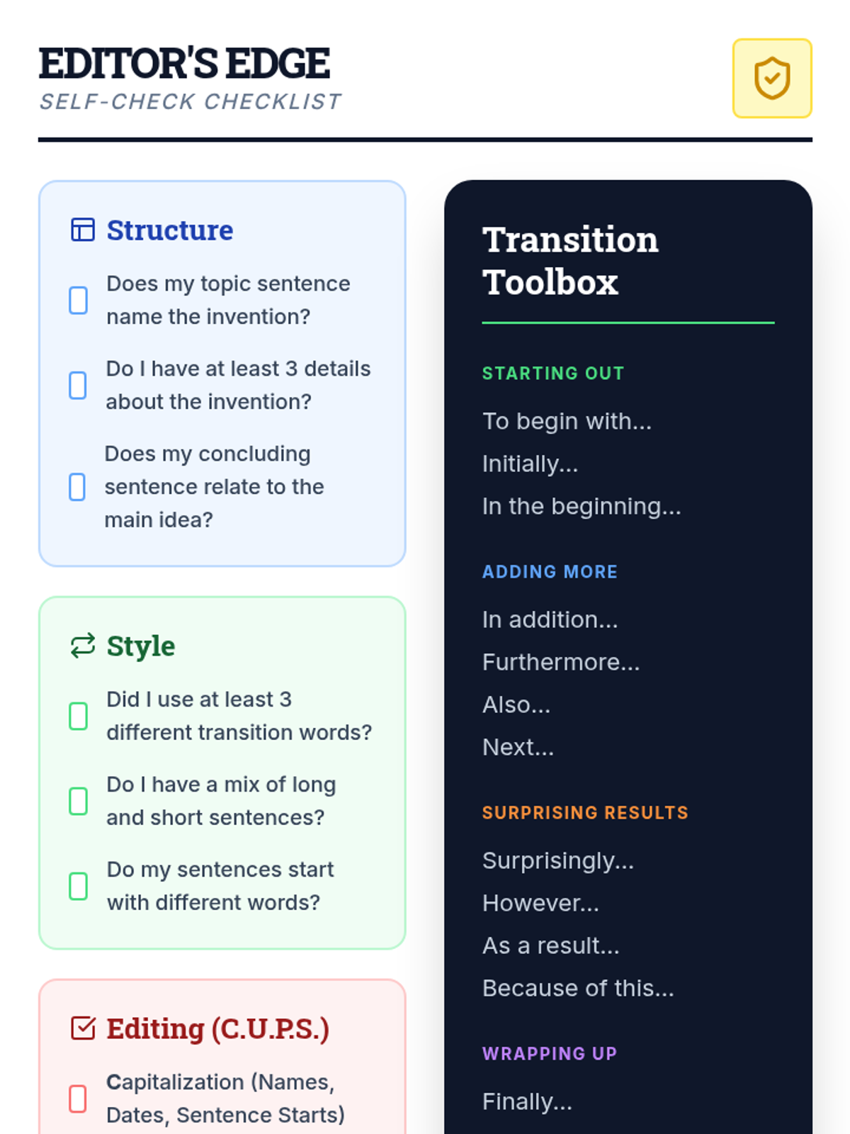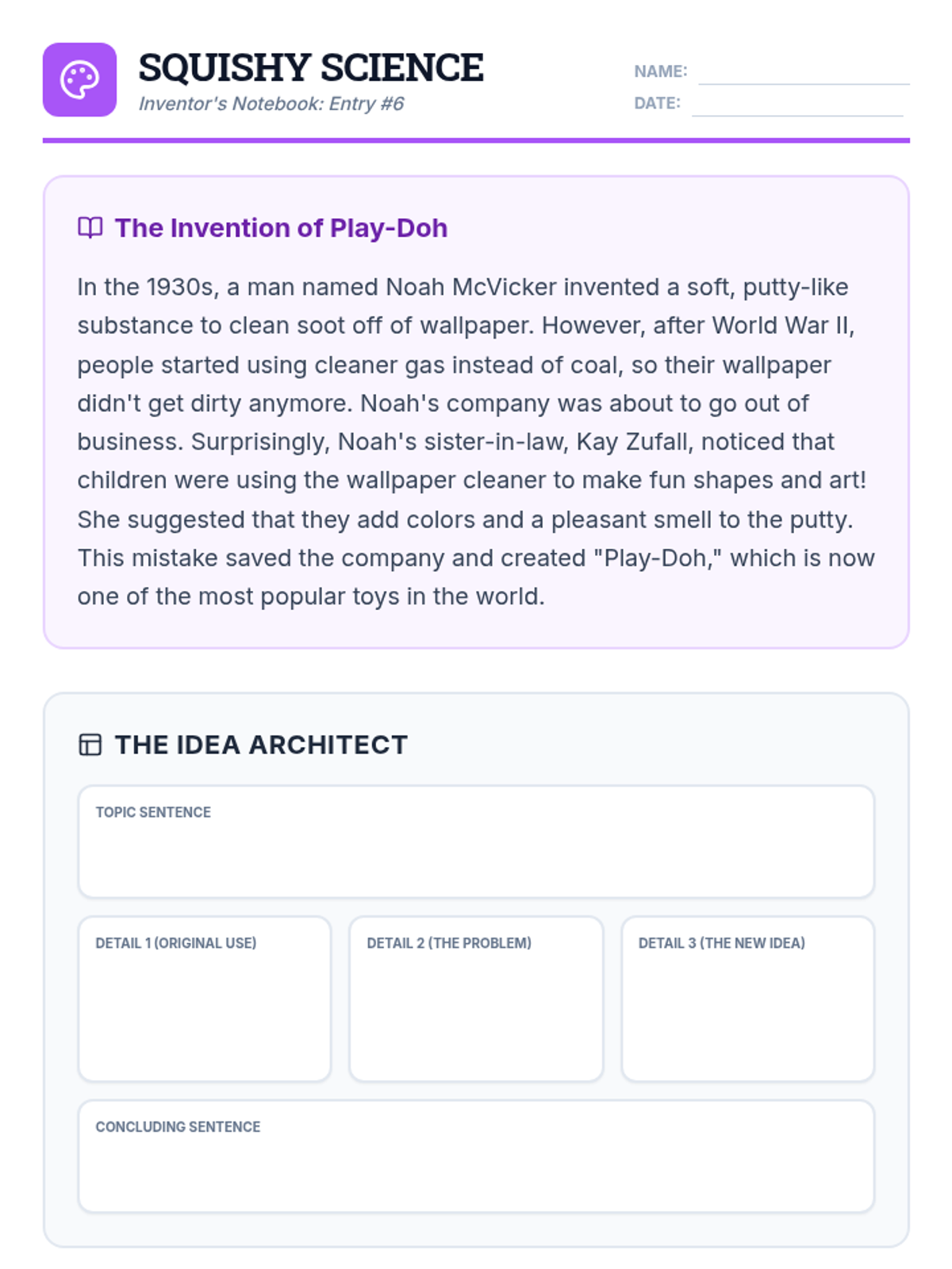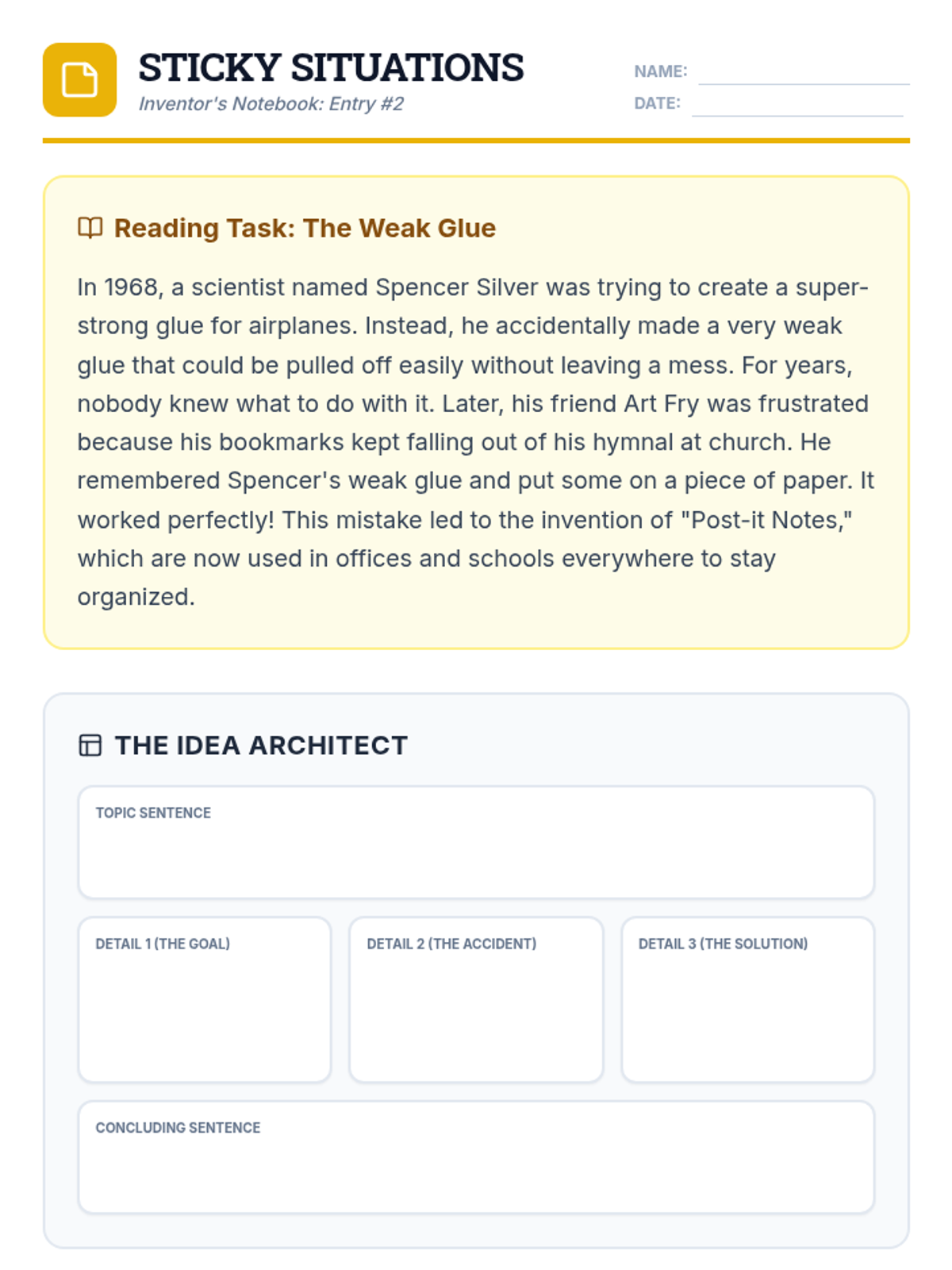 A writing intervention focused on taking notes from informational texts about accidental inventions and transforming them into structured paragraphs with transitions and sentence variety.