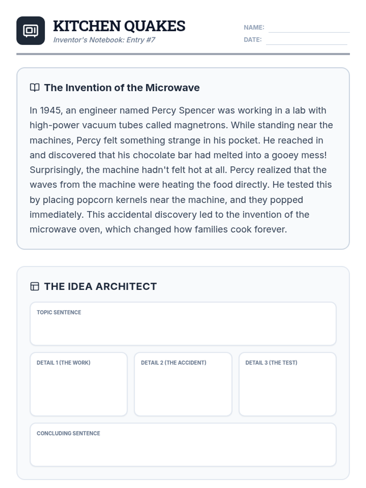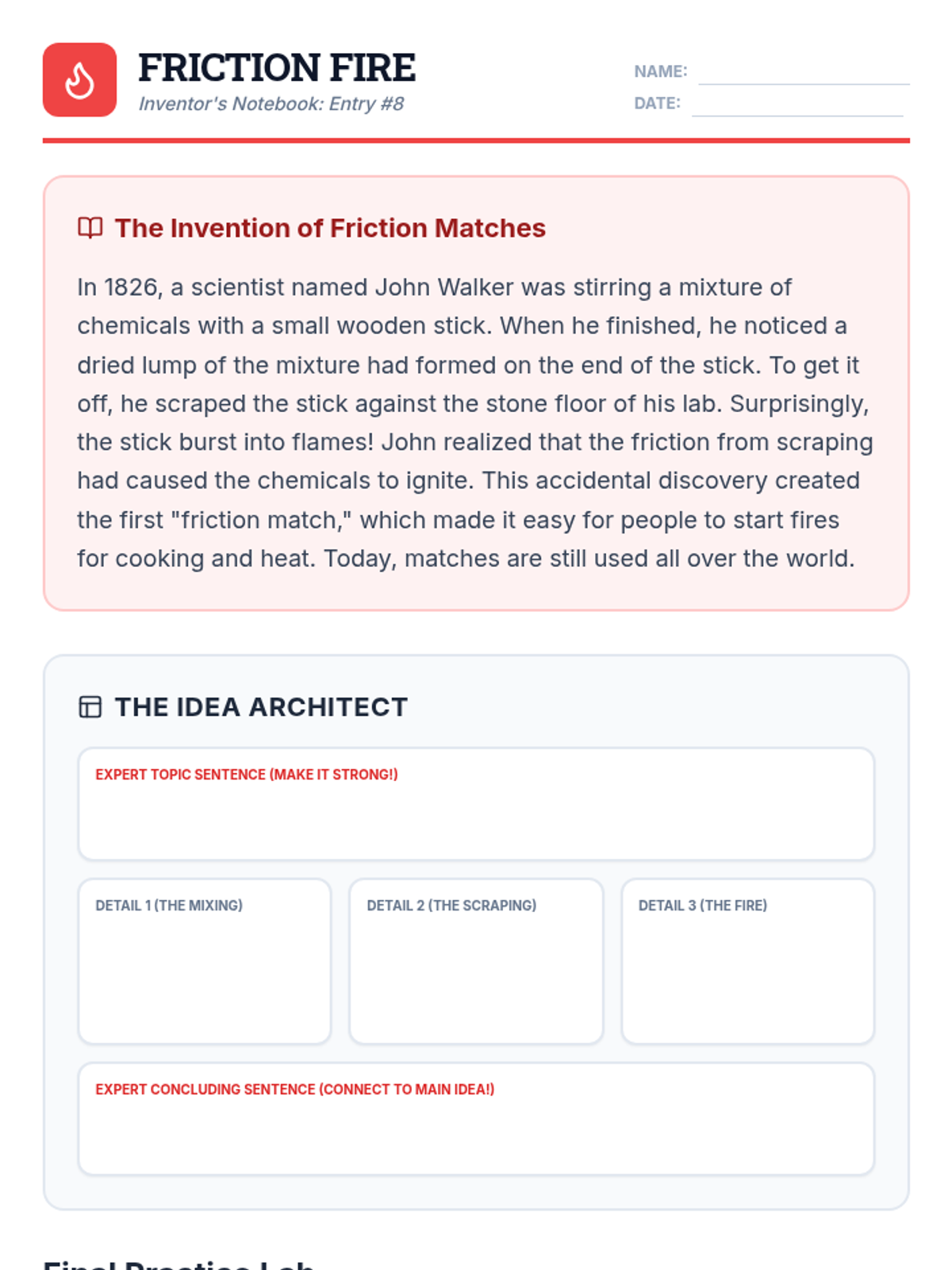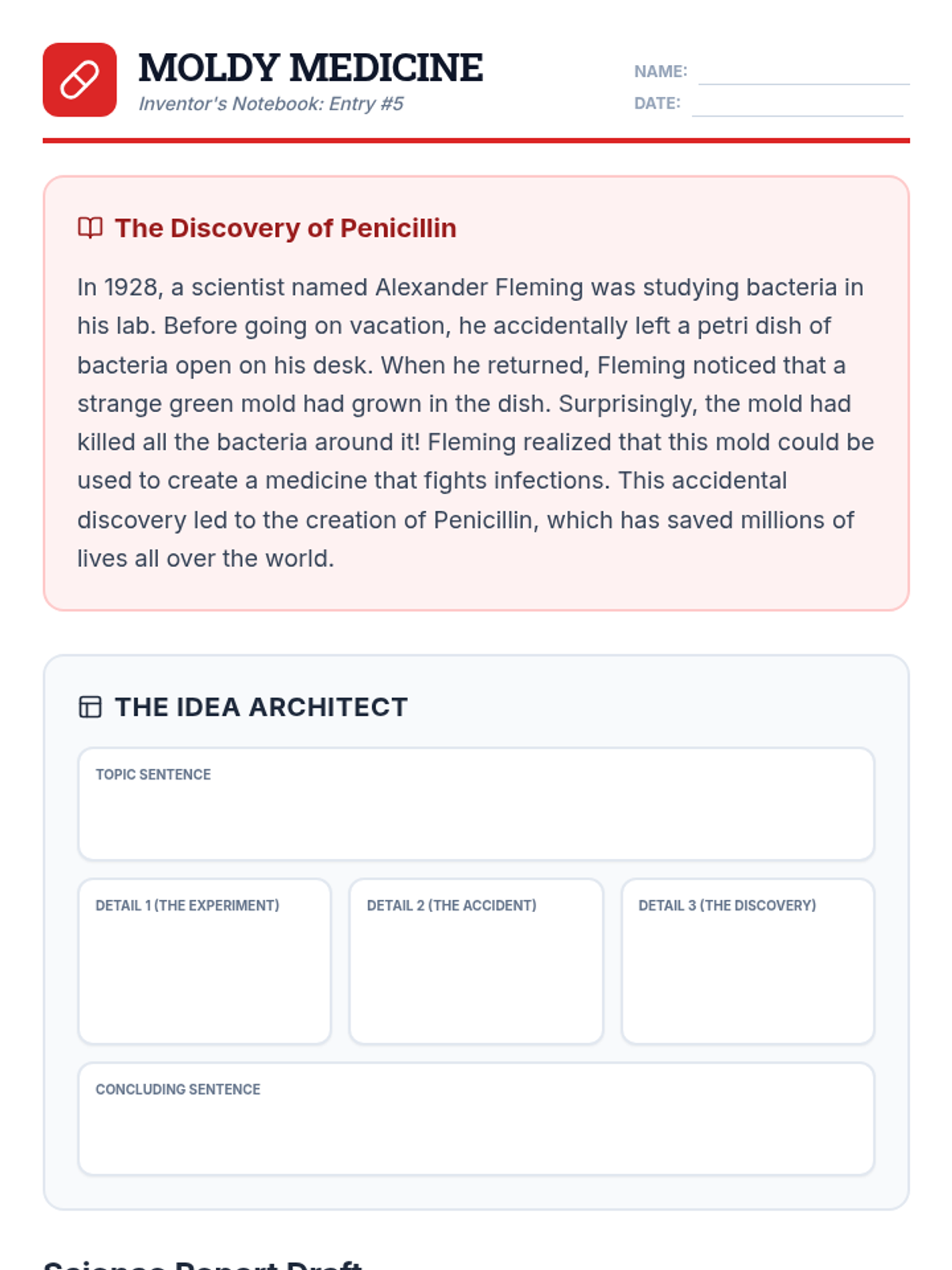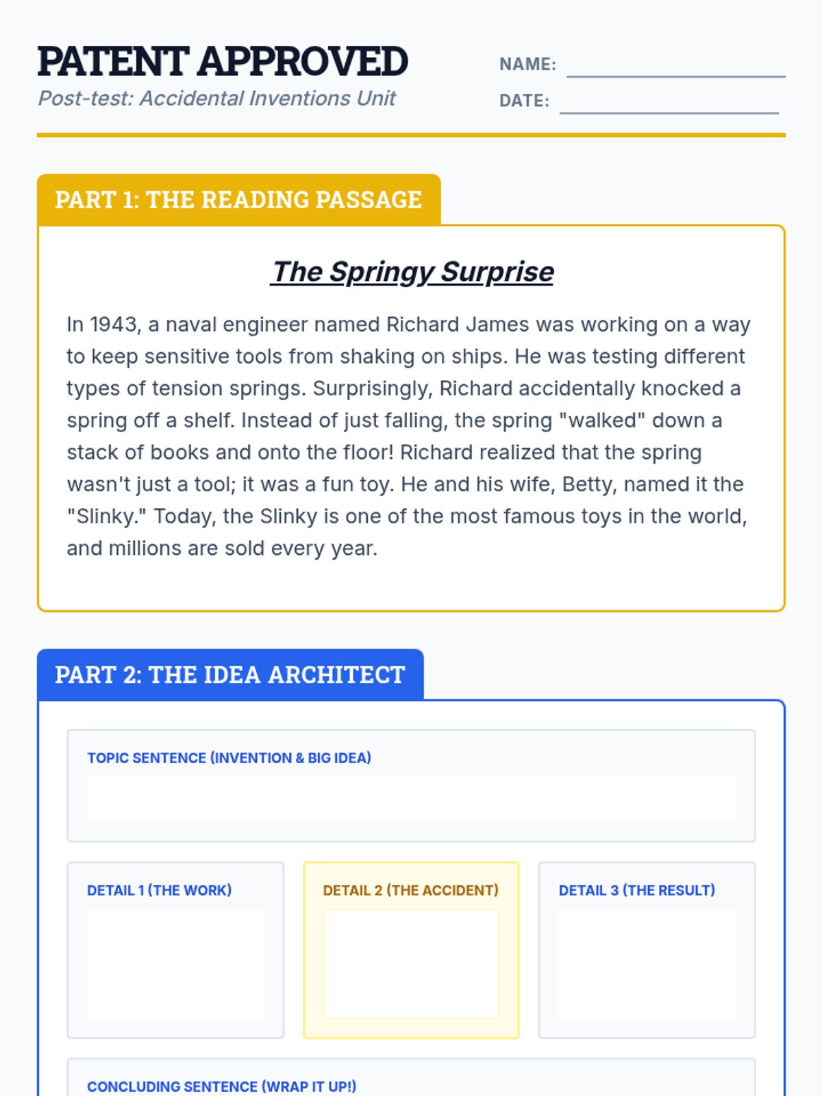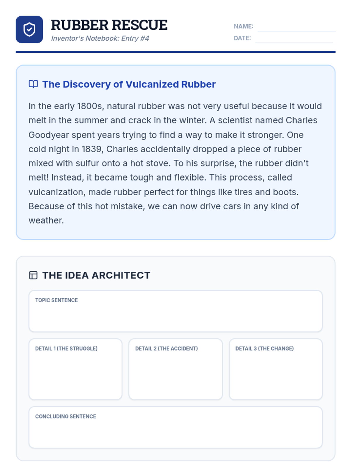A writing intervention focused on taking notes from informational texts about accidental inventions and transforming them into structured paragraphs with transitions and sentence variety.