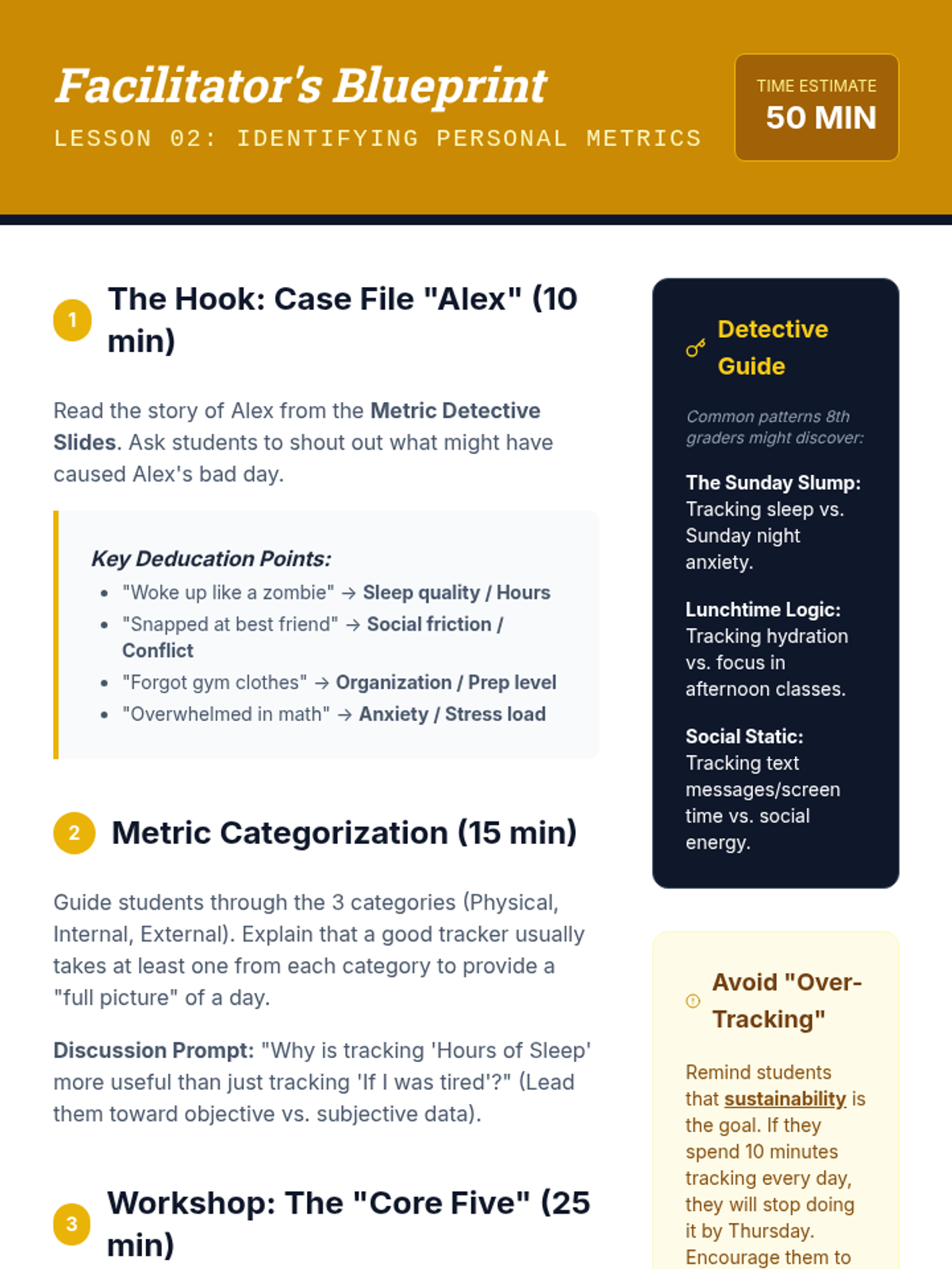 A comprehensive 8-lesson sequence for middle school students to master focus by distinguishing between and managing internal and external distractions. Each 20-minute session provides interactive instruction and practical activities.