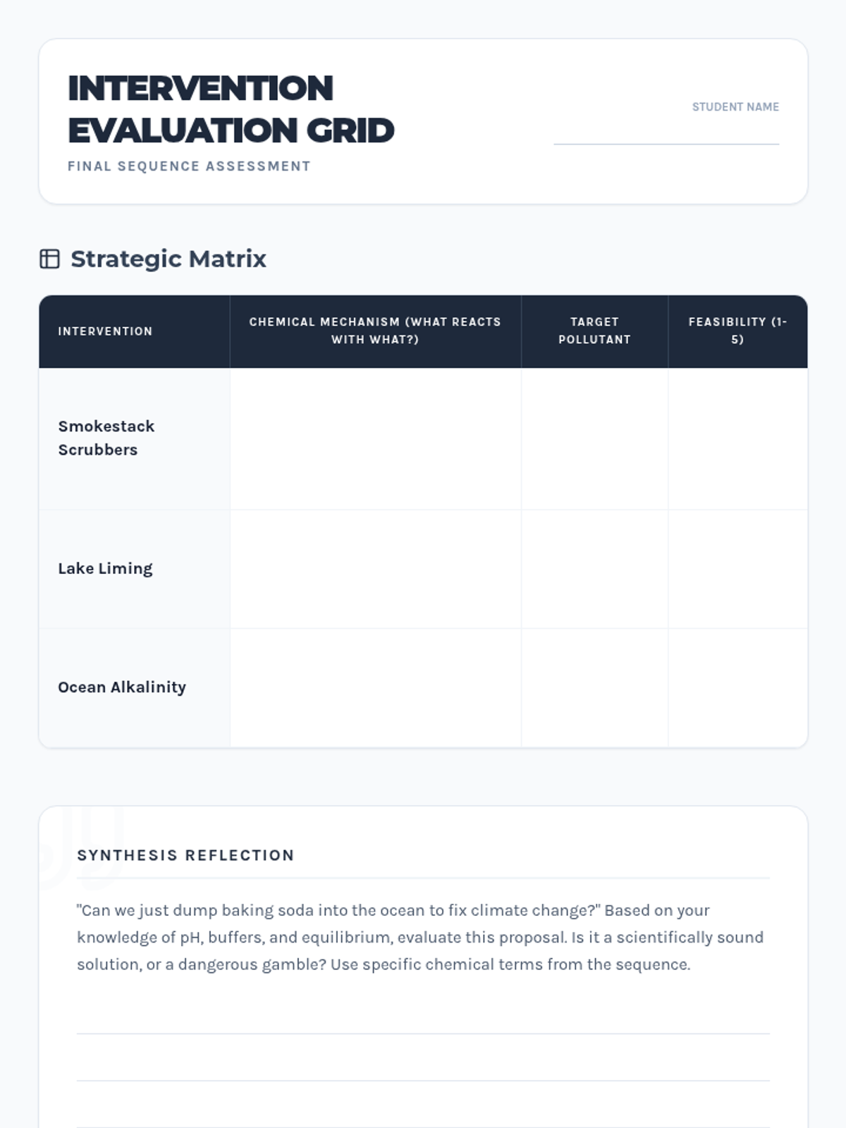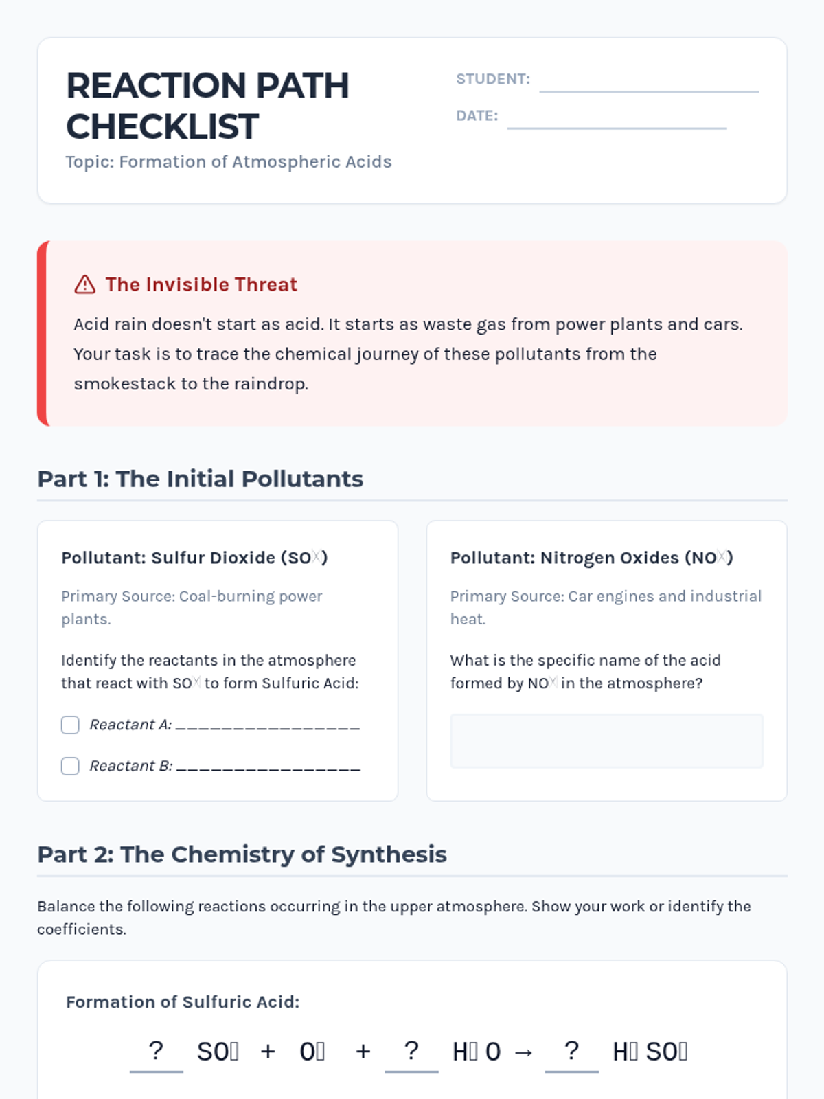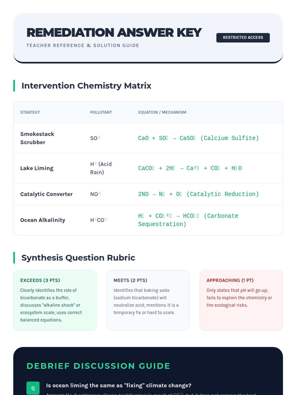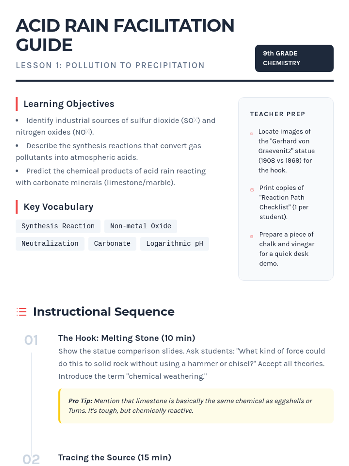 A 9th-grade chemistry sequence exploring the formation and impact of acid rain and ocean acidification on environmental systems, focusing on chemical reactions, ecosystem resilience, and remediation strategies.