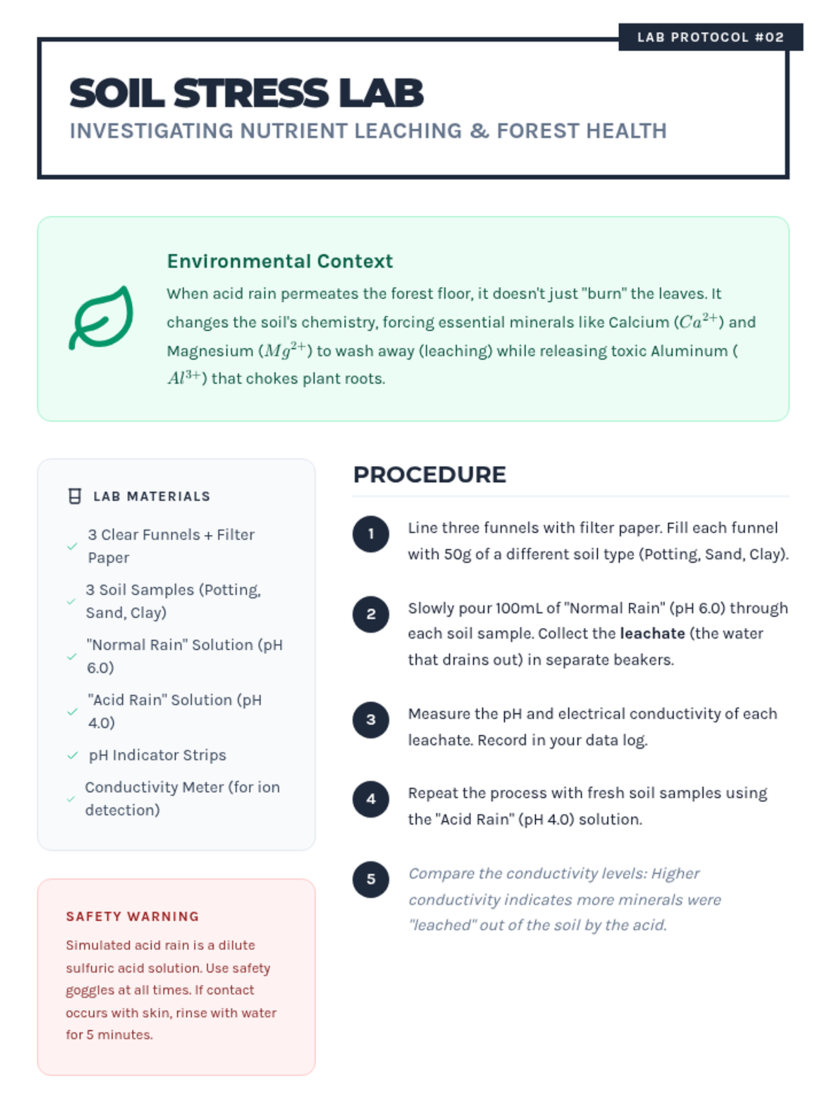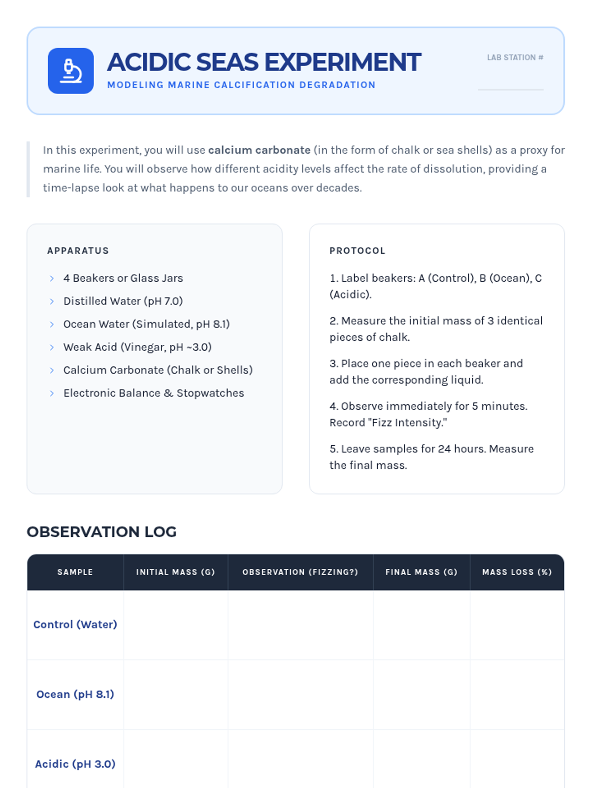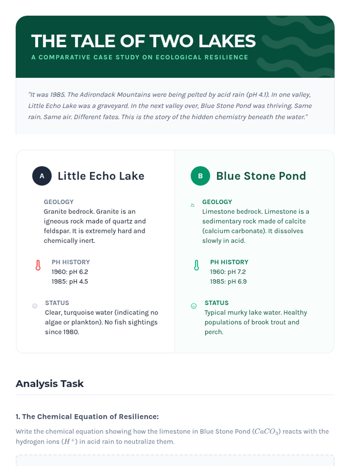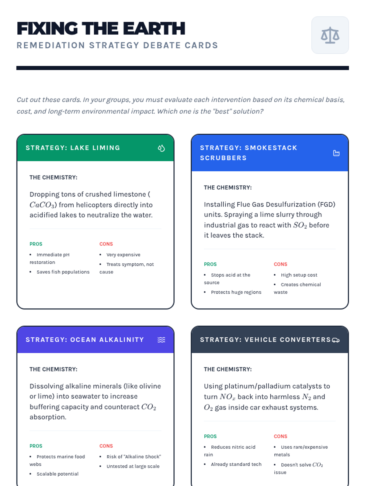 A 9th-grade chemistry sequence exploring the formation and impact of acid rain and ocean acidification on environmental systems, focusing on chemical reactions, ecosystem resilience, and remediation strategies.