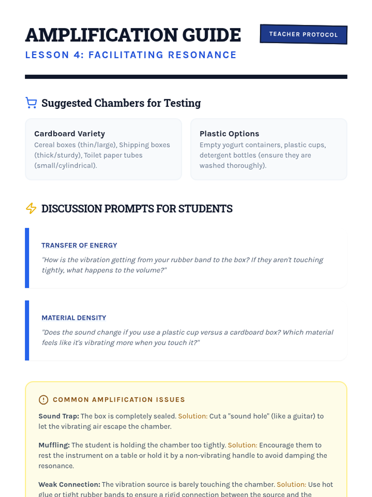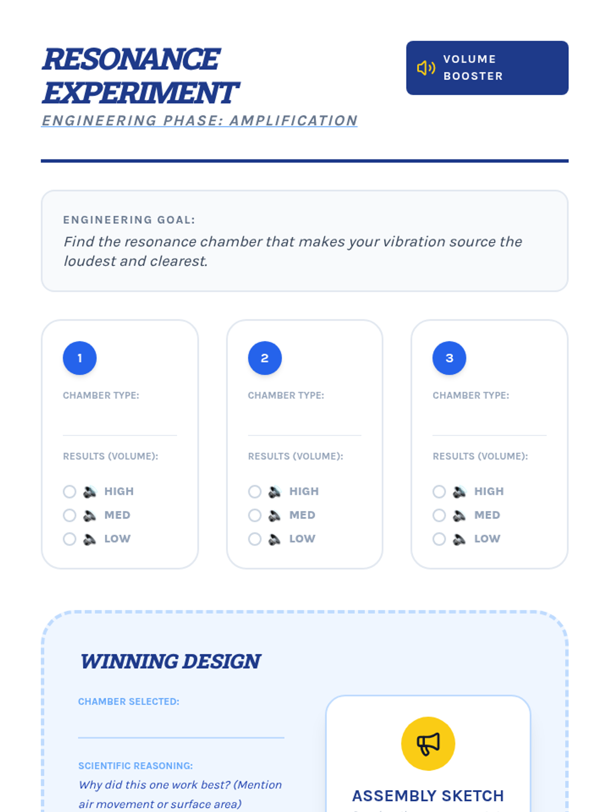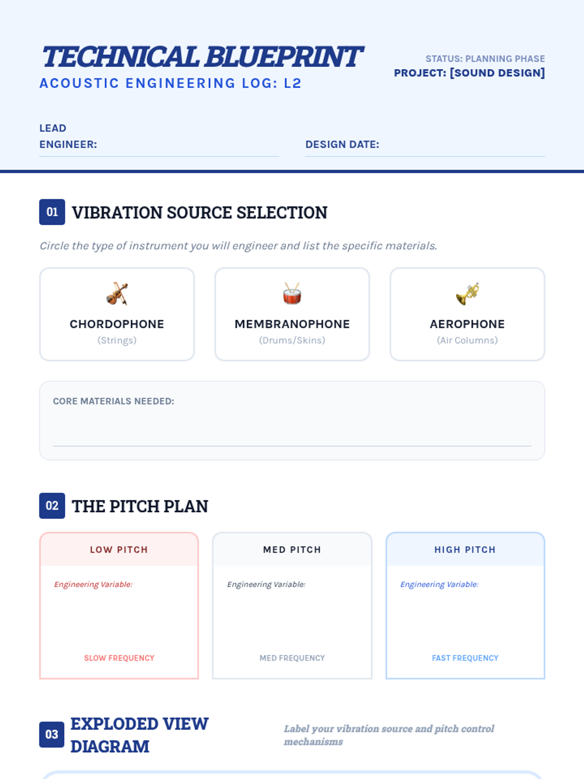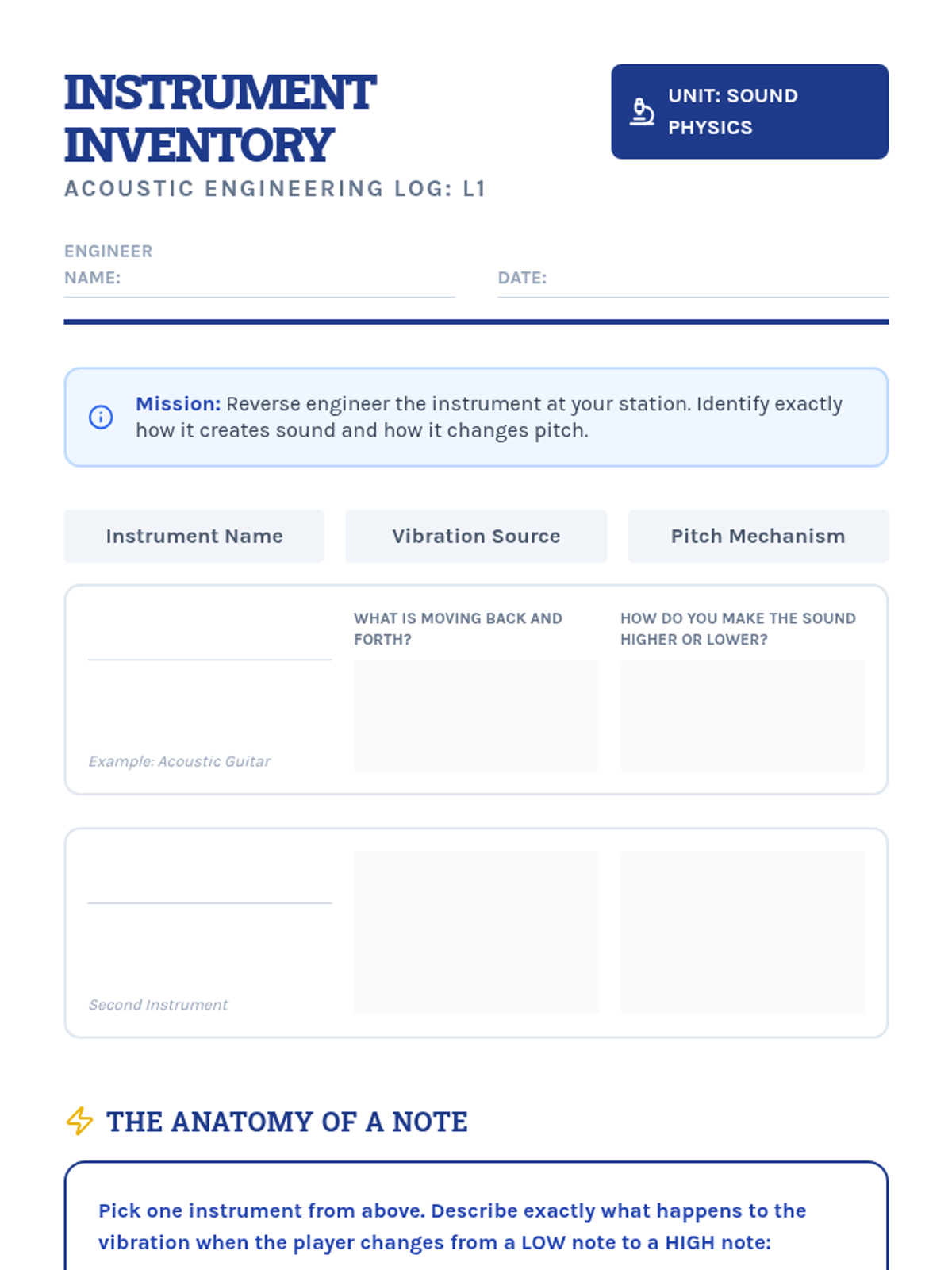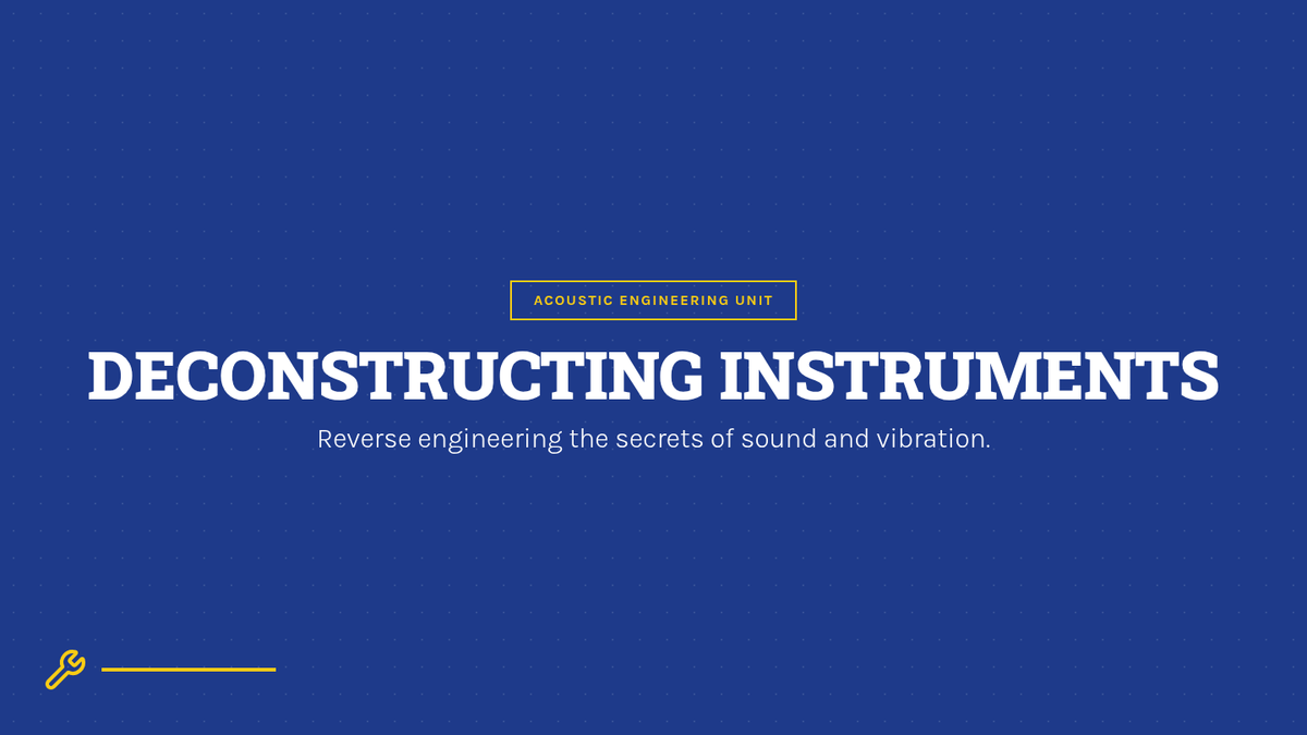 Students act as acoustic engineers to design and construct musical instruments by applying physics concepts of vibration, pitch (tension, length, mass), and resonance.