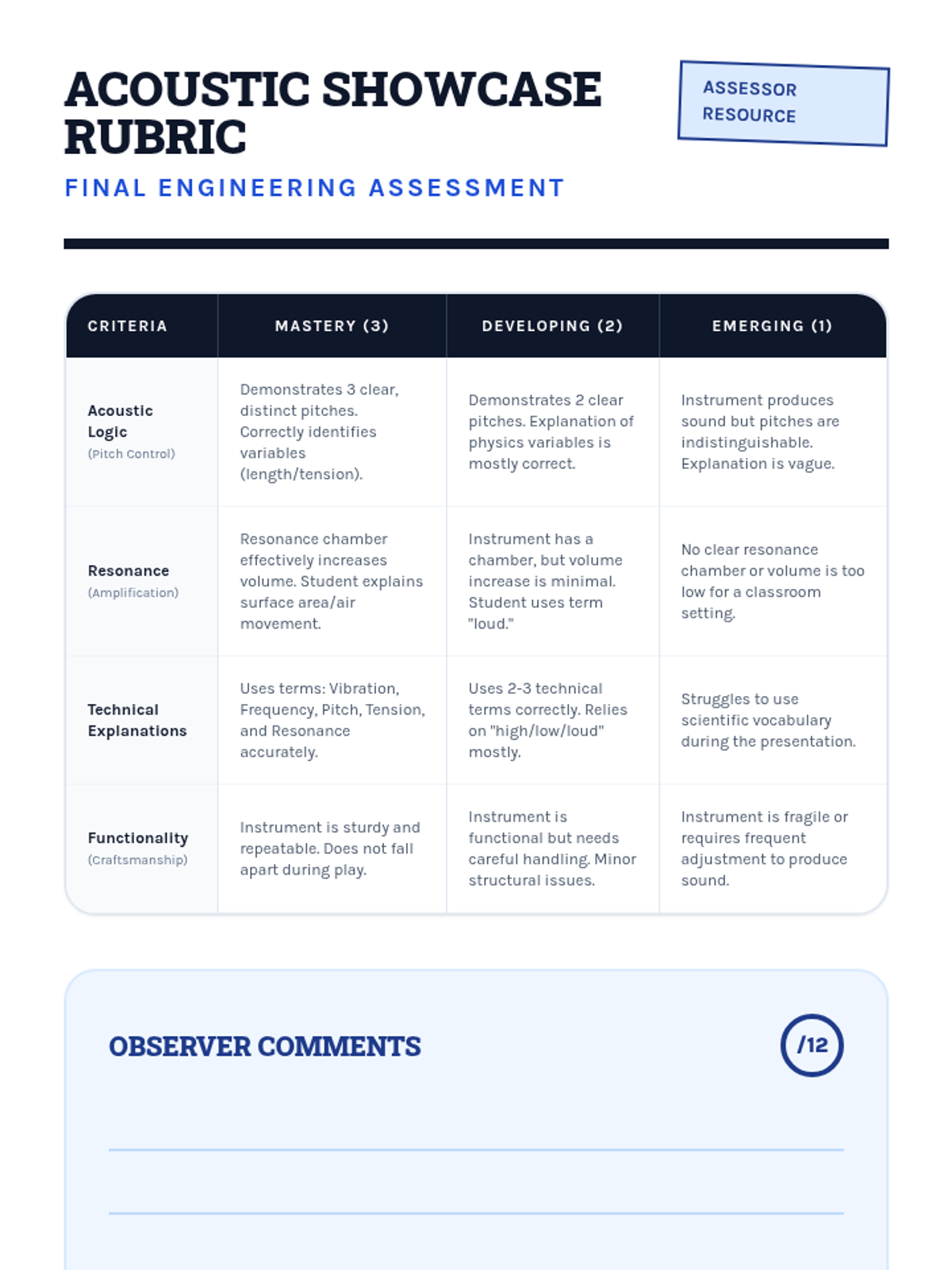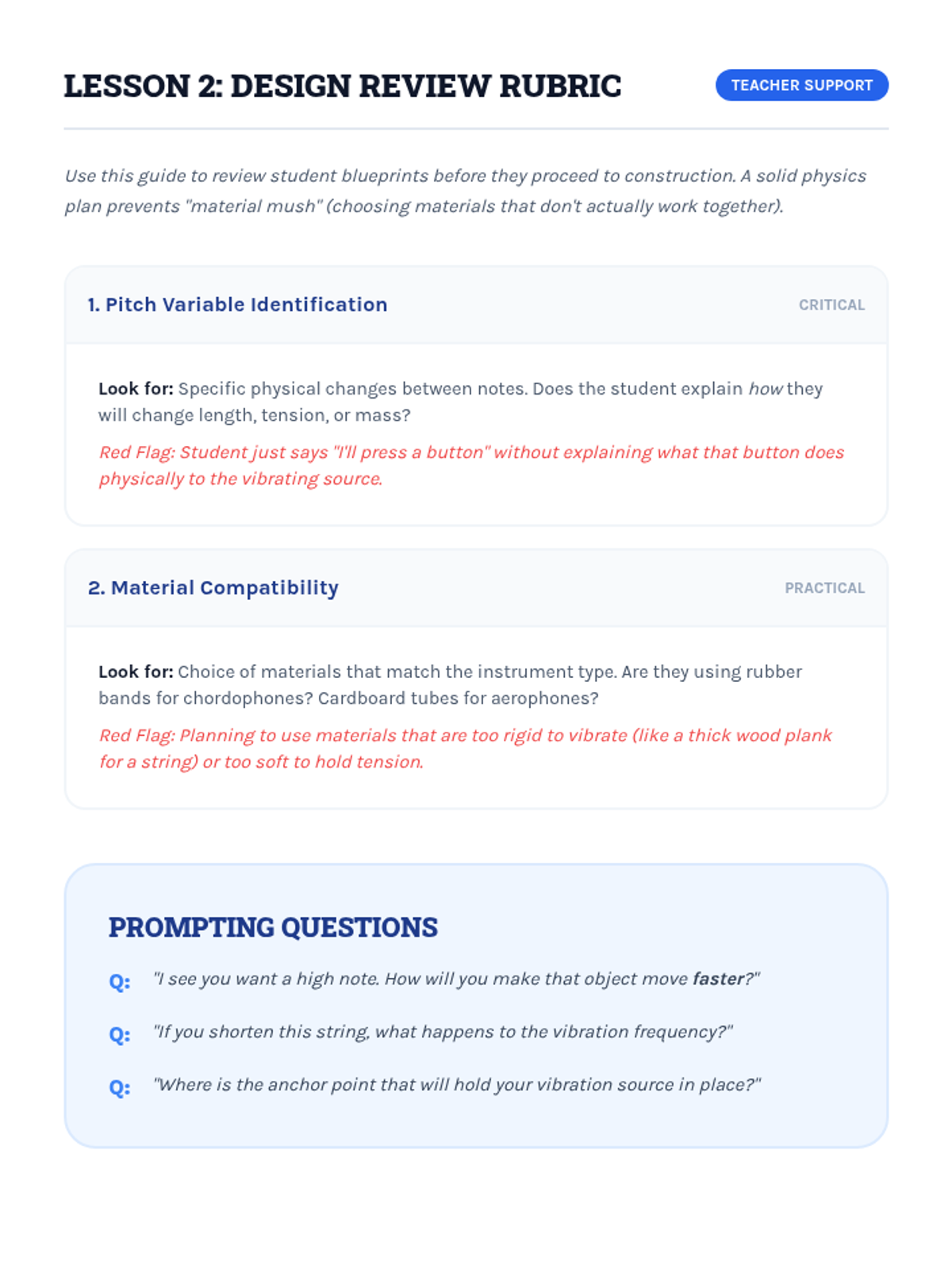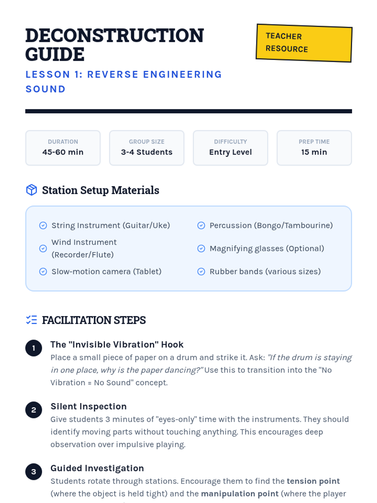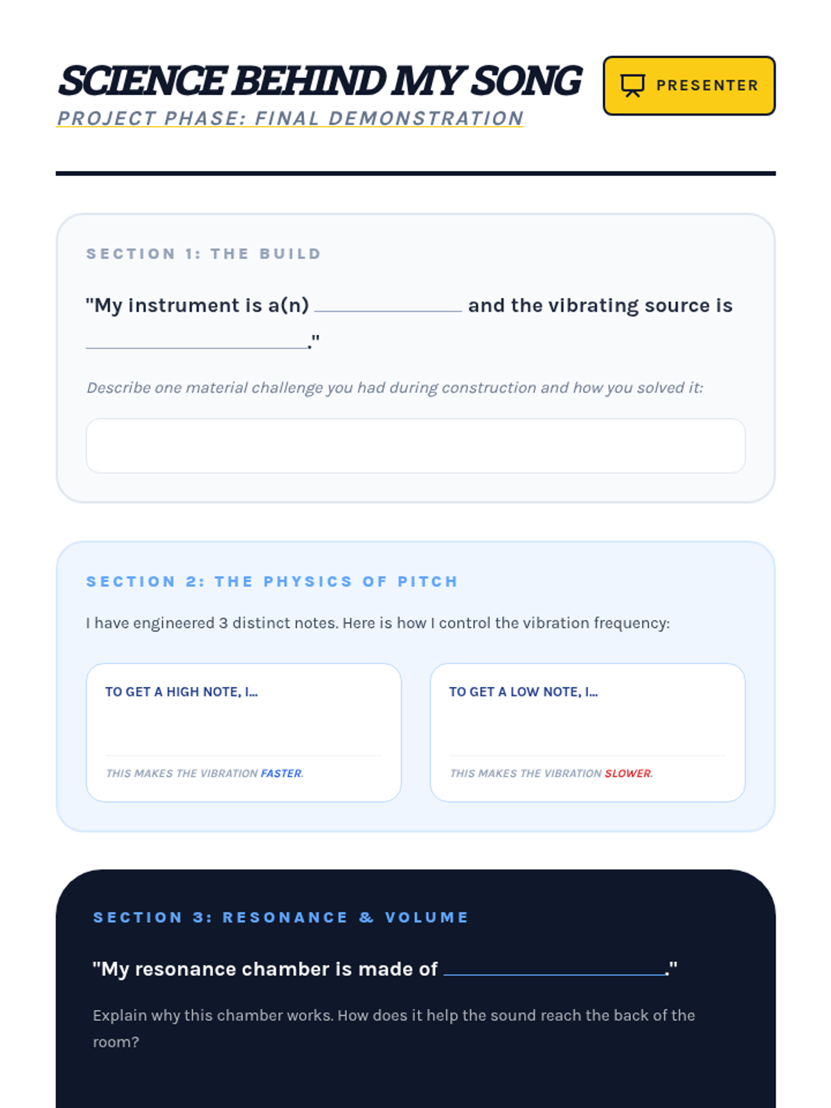 Students act as acoustic engineers to design and construct musical instruments by applying physics concepts of vibration, pitch (tension, length, mass), and resonance.