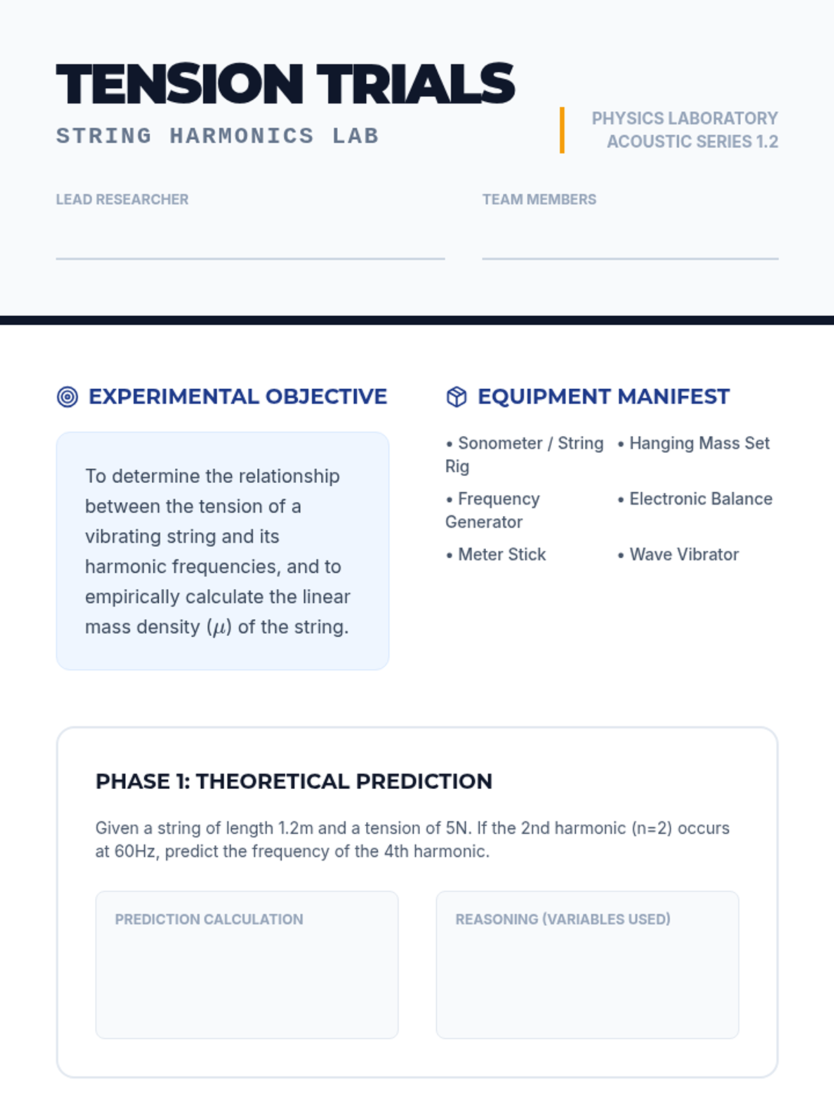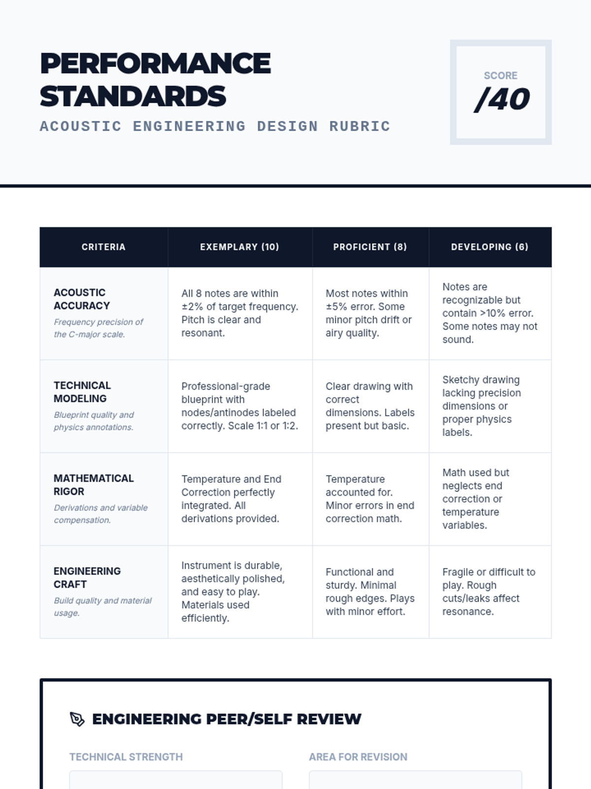 A project-based physics sequence exploring acoustics, resonance, and wave phenomena. Students progress from basic sound propagation to engineering their own acoustic devices, applying principles of harmonics, beats, and the Doppler effect.