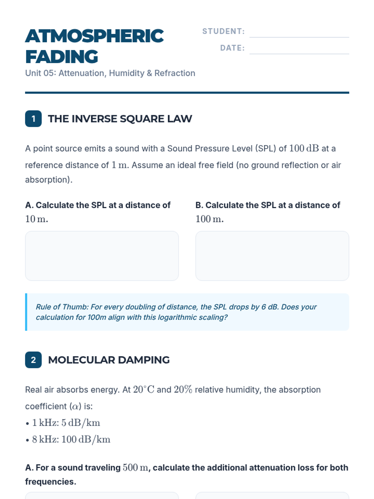 This undergraduate physics sequence explores the propagation of sound through complex environments, focusing on impedance, diffraction, architectural acoustics, and high-velocity phenomena. Students will bridge the gap between theoretical wave physics and practical acoustical engineering.