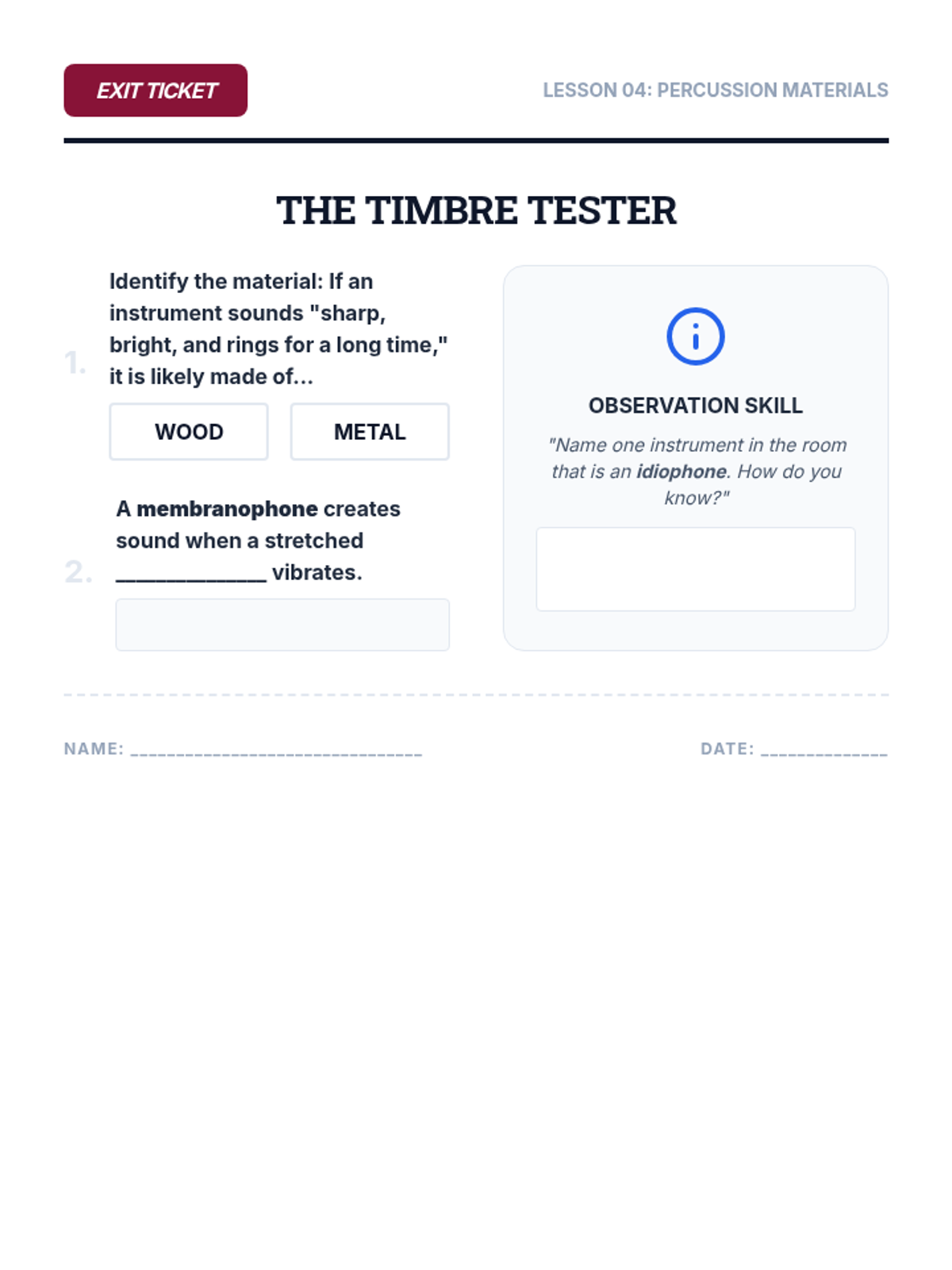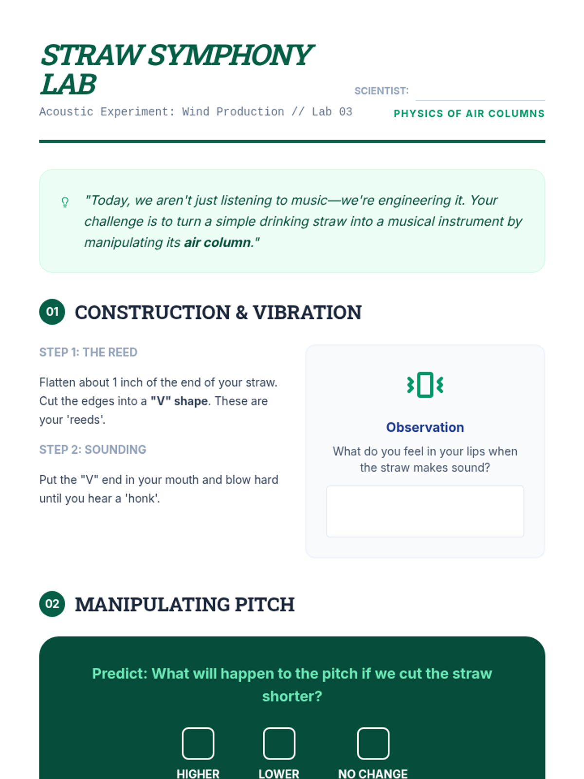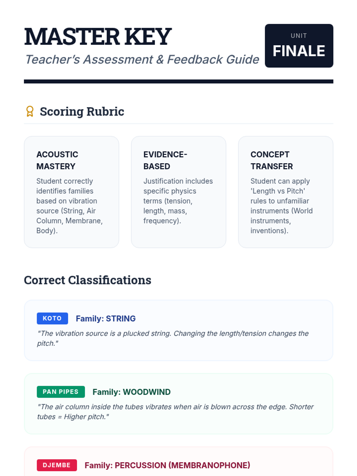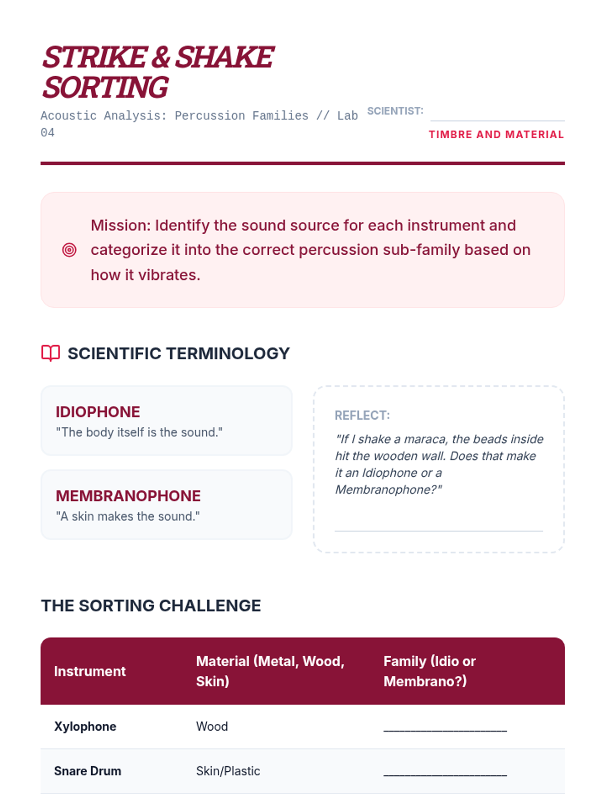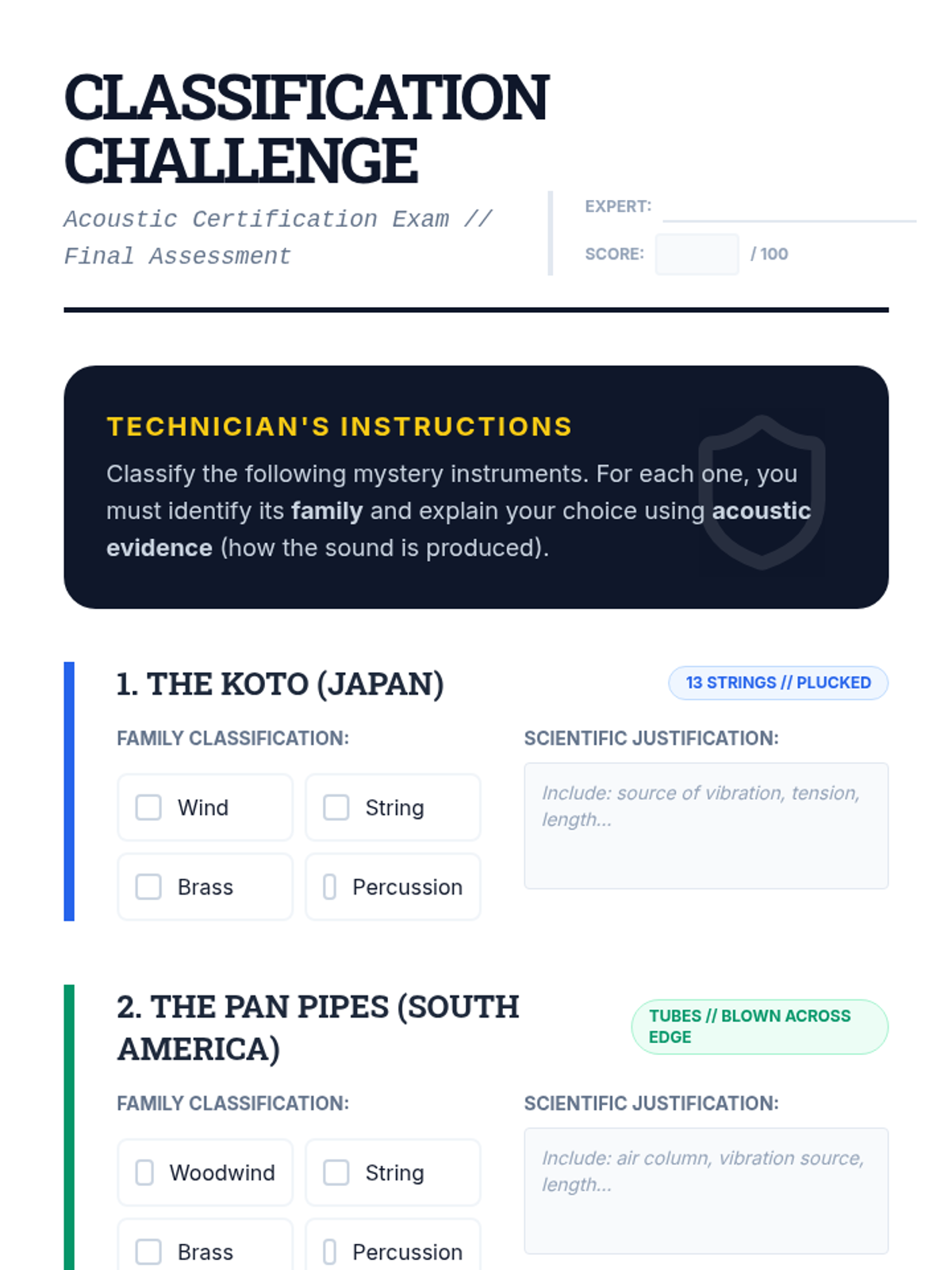 A scientific exploration of how instruments produce sound, categorized by vibration mechanics and physical properties. Students investigate the four main instrument families through the lens of acoustics and physics.