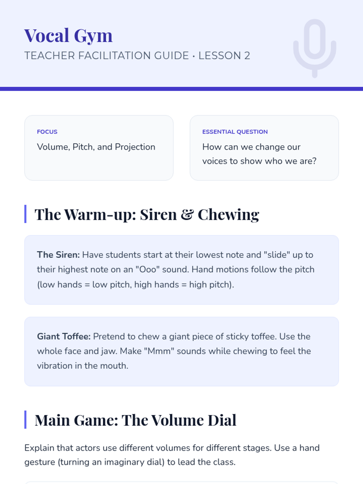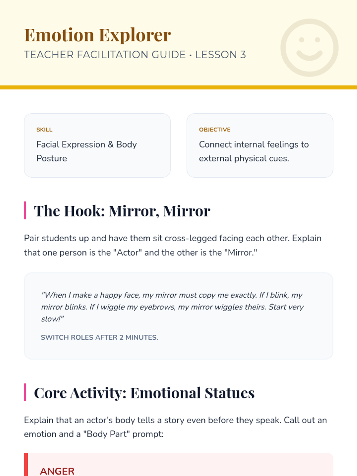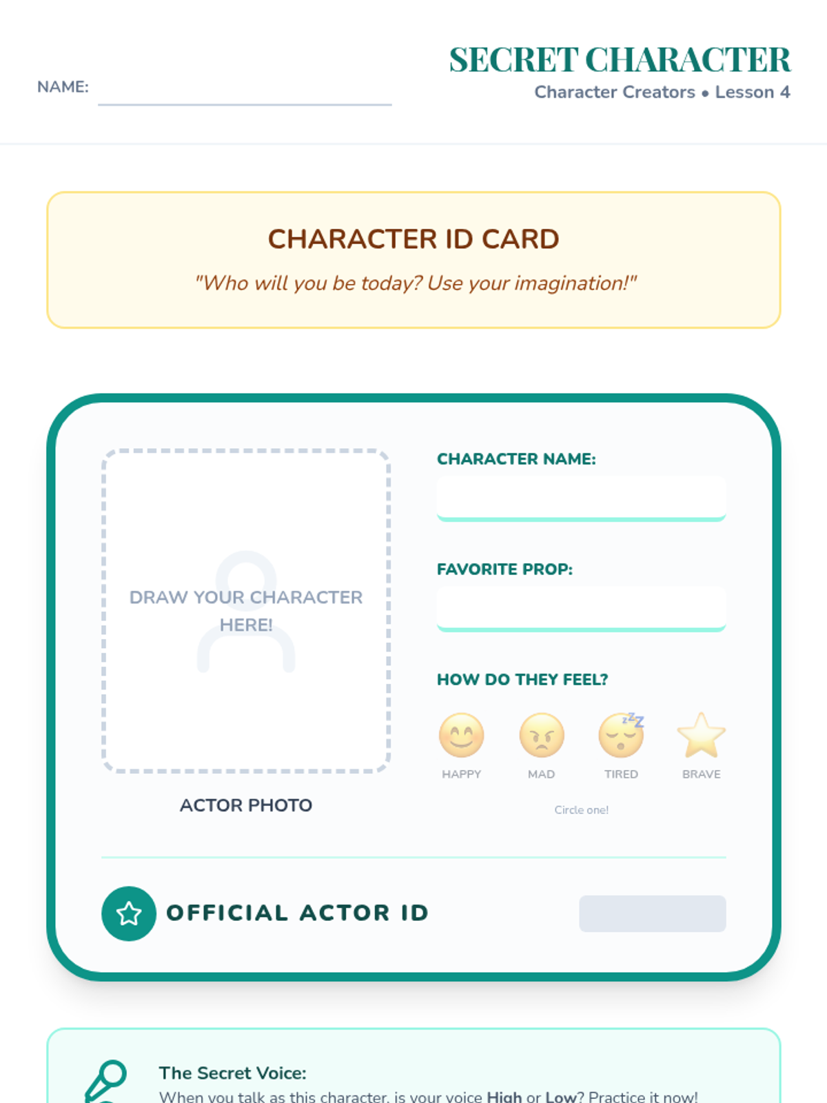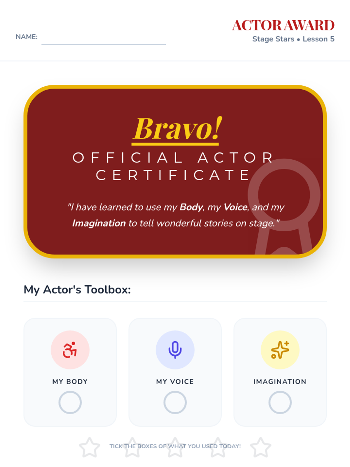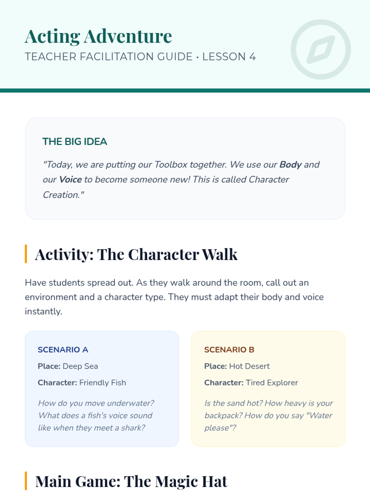 A Kindergarten theater sequence where students explore their 'Actor's Toolbox'—the body, voice, and imagination. Through movement games, vocal play, and emotional expression, students learn how to transform into characters and tell stories on stage.