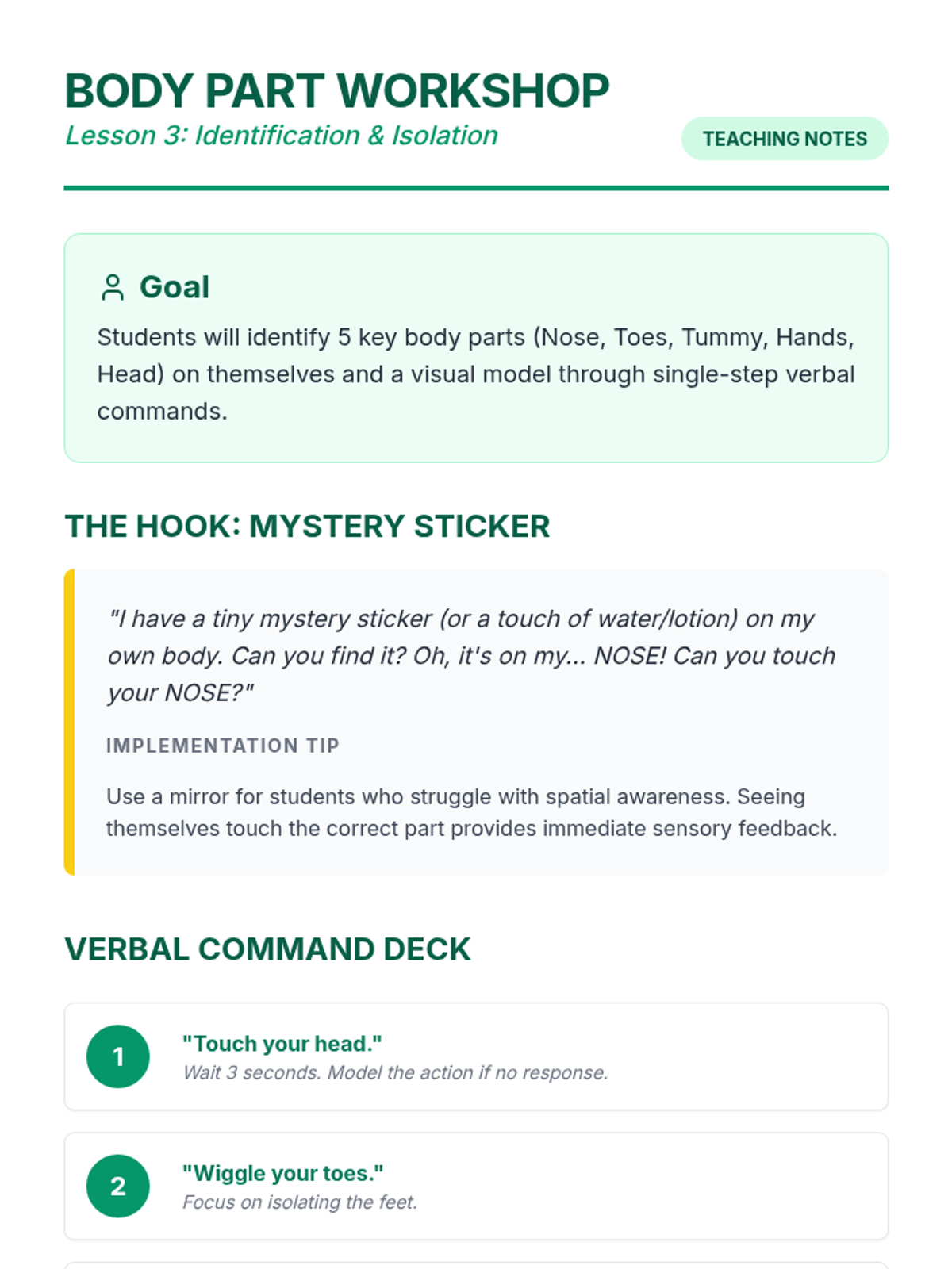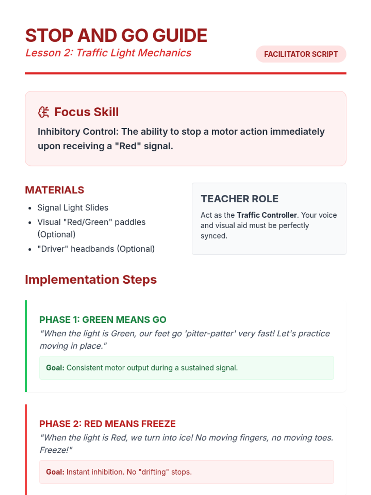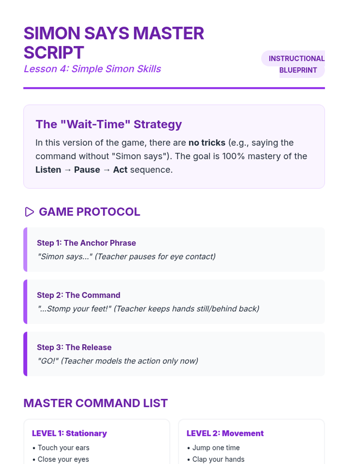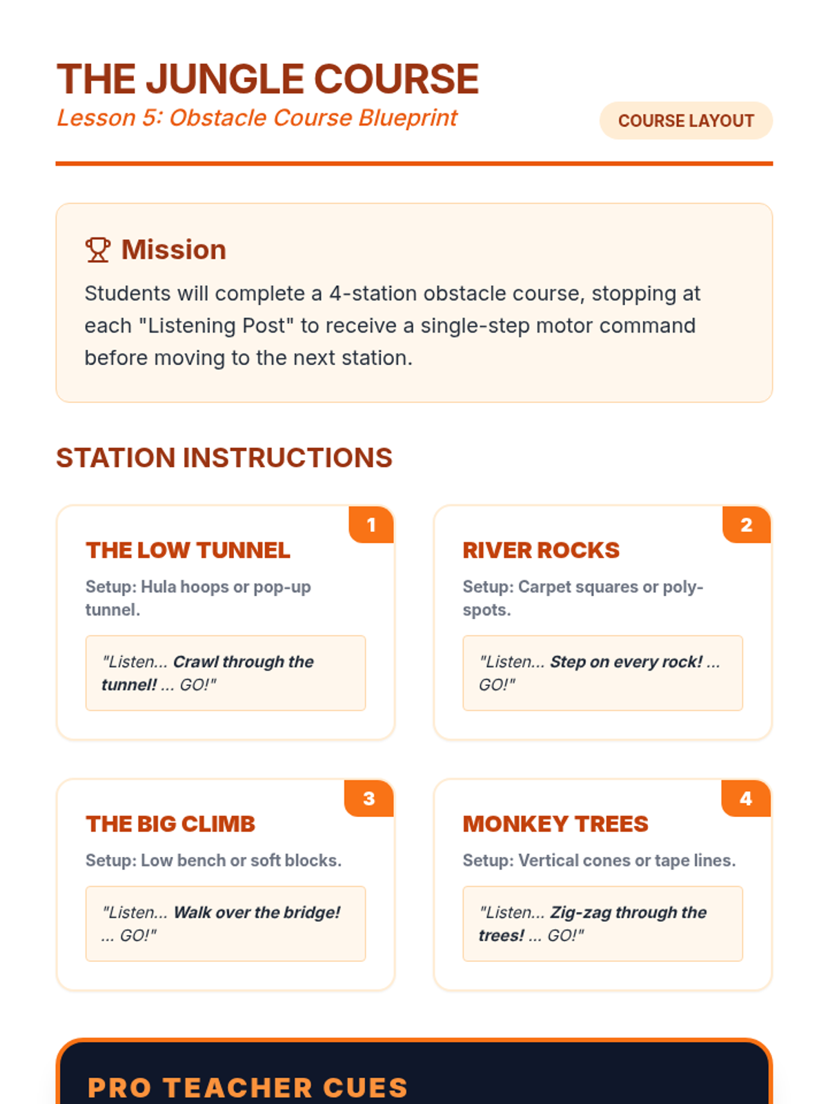 A 5-lesson sequence designed for Kindergarten students in Special Education to develop auditory processing and working memory through single-step gross motor commands. Students progress from identifying action verbs to navigating an obstacle course by following specific instructions.