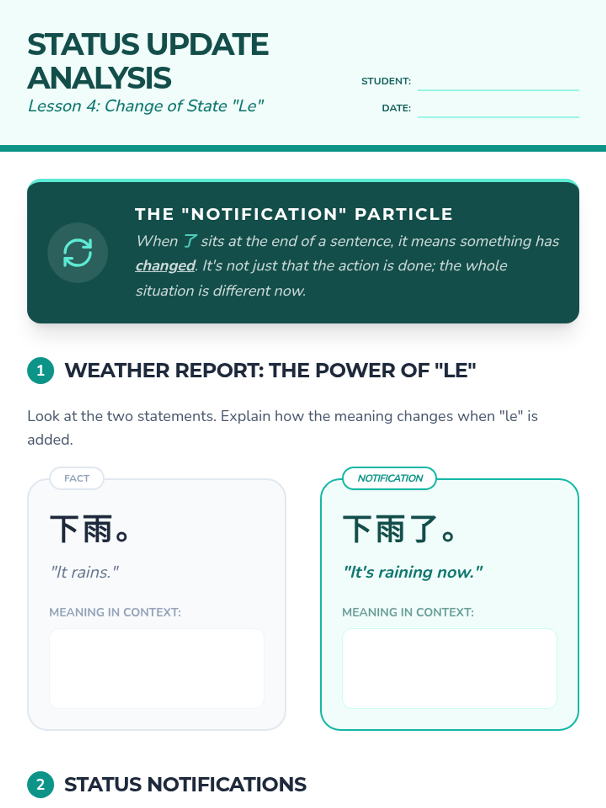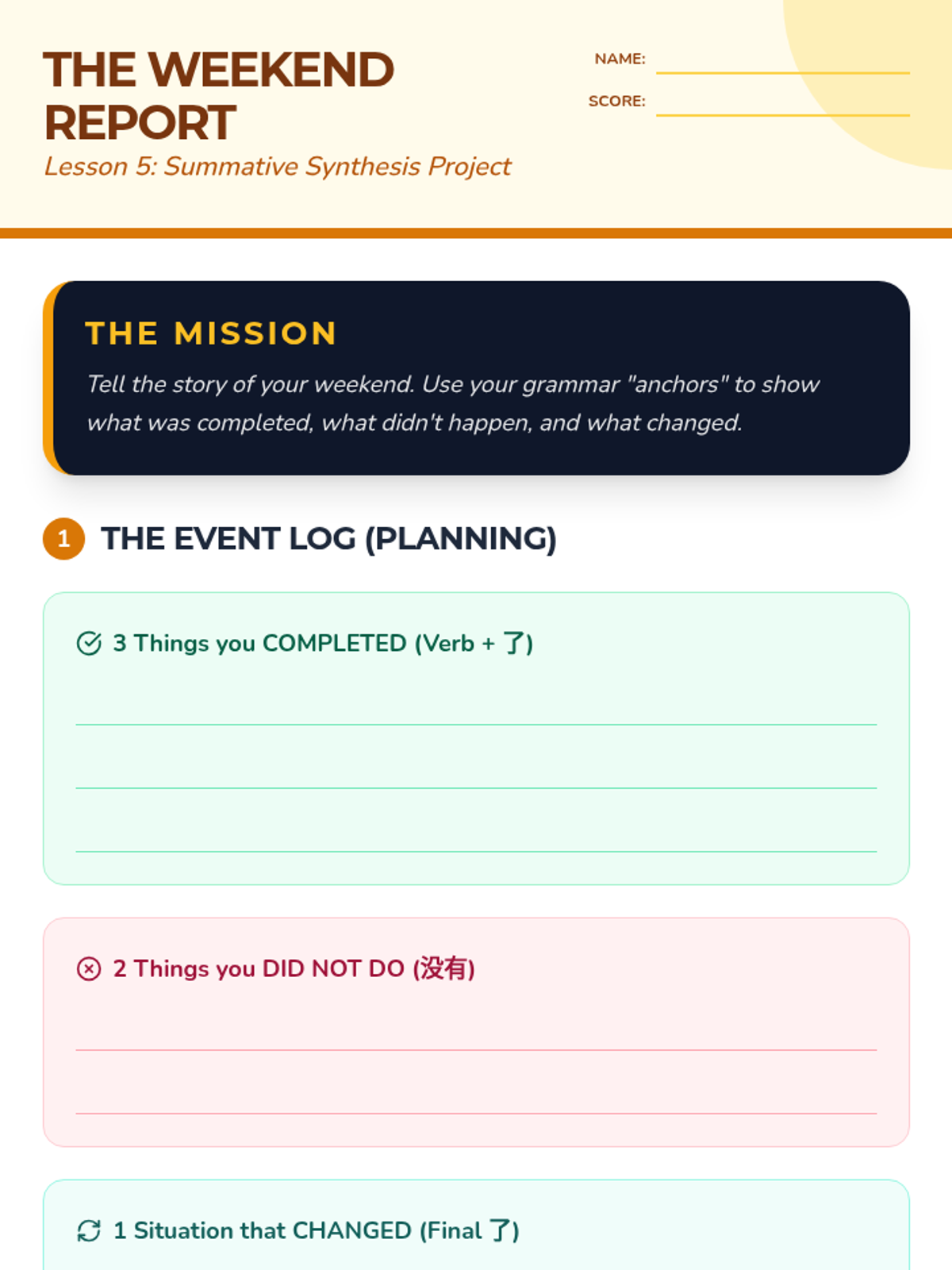 A comprehensive unit for 9th-grade Mandarin students on expressing completed actions and changes of state using the 'le' particle and 'meiyou' negation. Students move beyond English tense thinking to master Chinese aspect markers.