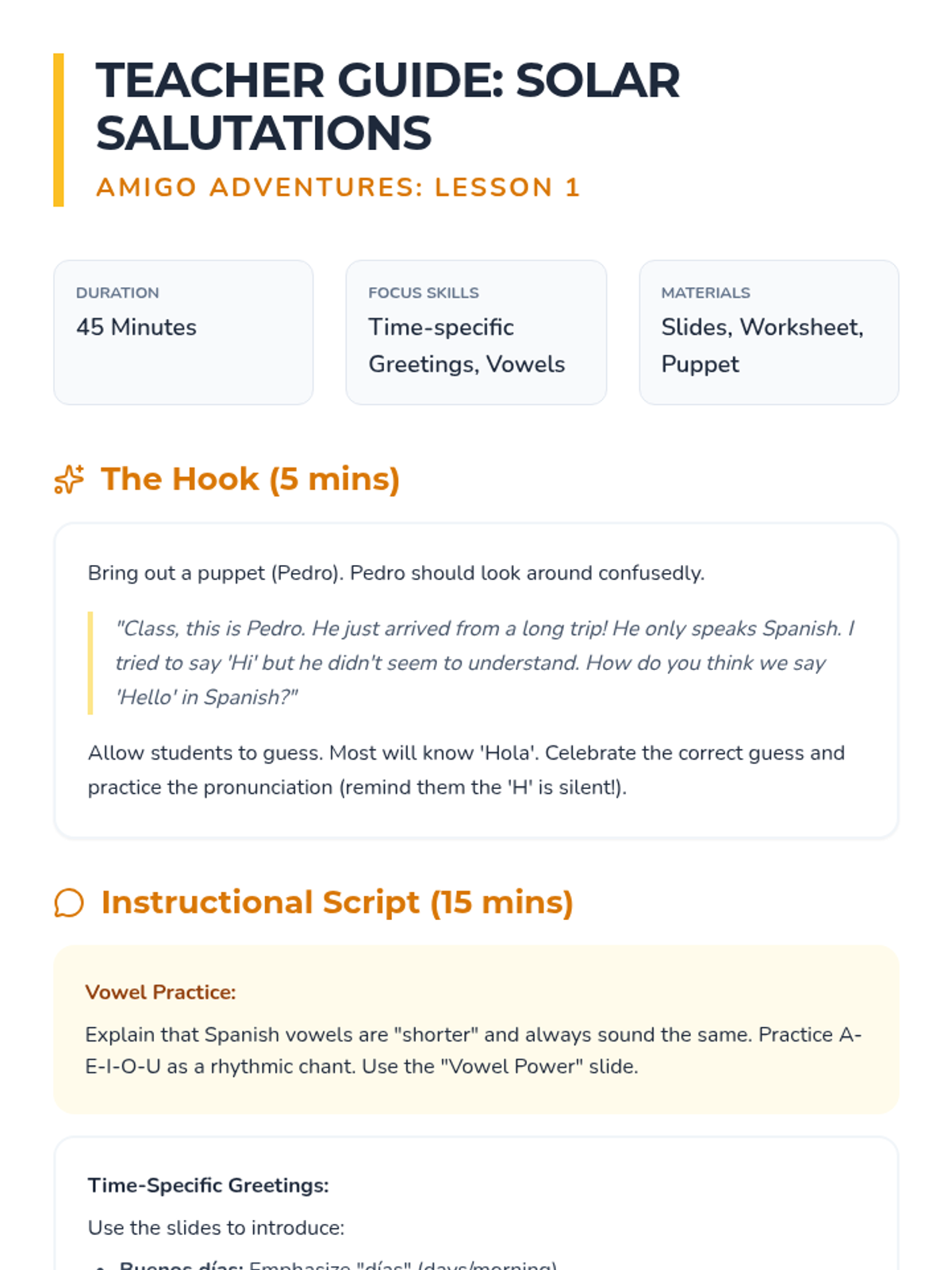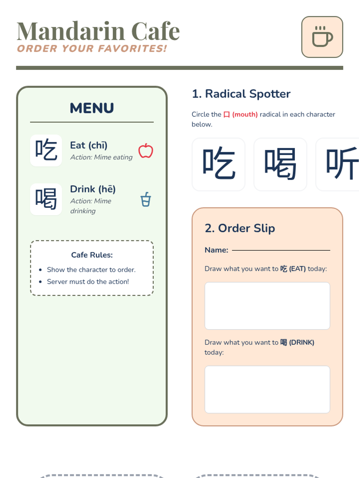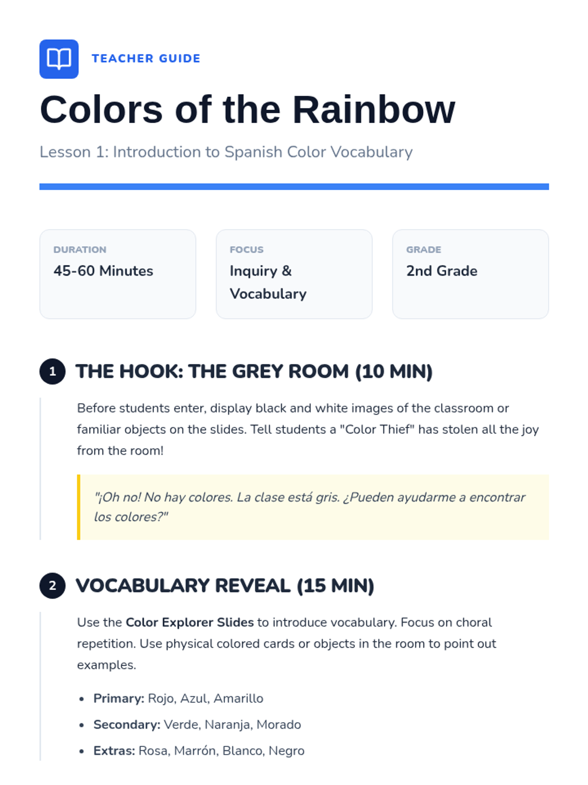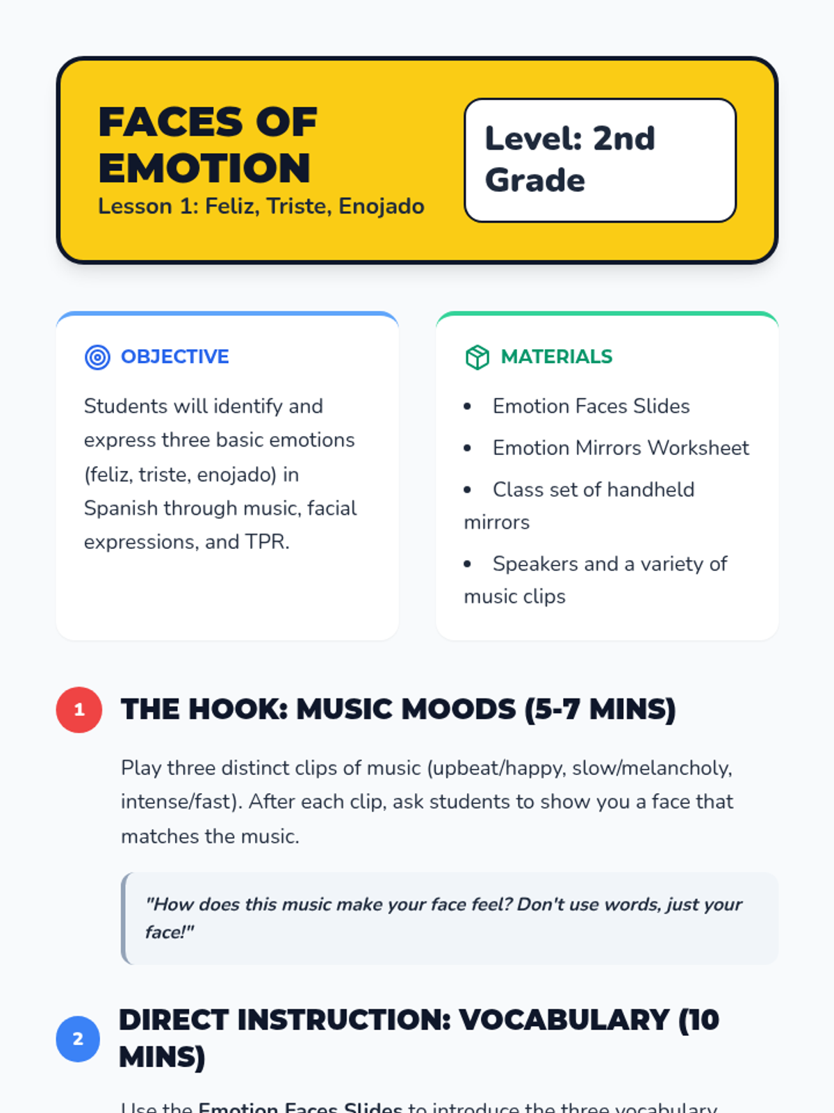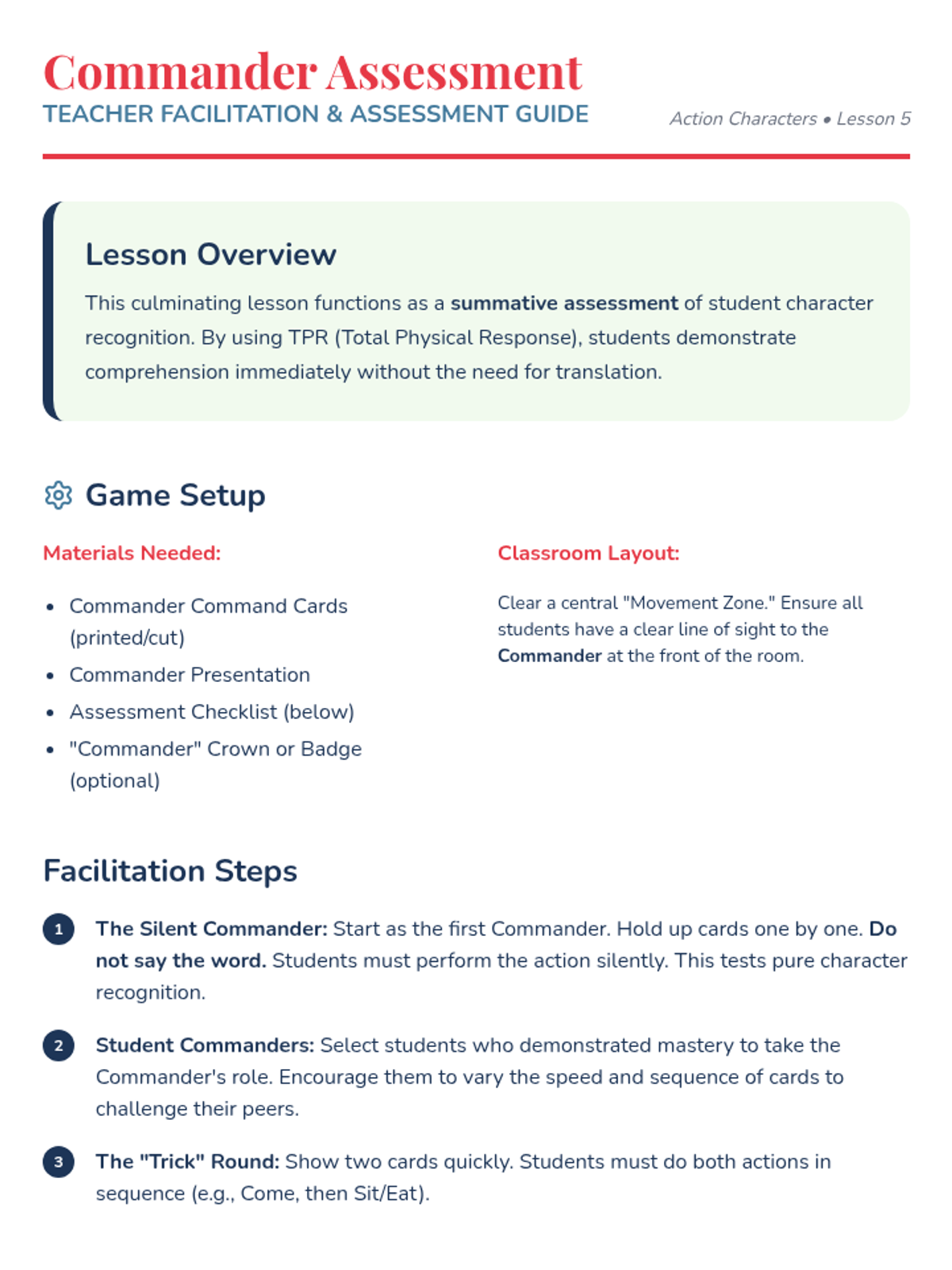 A 5-lesson sequence for 2nd Grade students to learn high-frequency Mandarin action verbs (look, listen, go, come, eat, drink, open, close) through Total Physical Response (TPR) and game-based learning. Students connect written characters directly to physical movements to build immediate comprehension.
