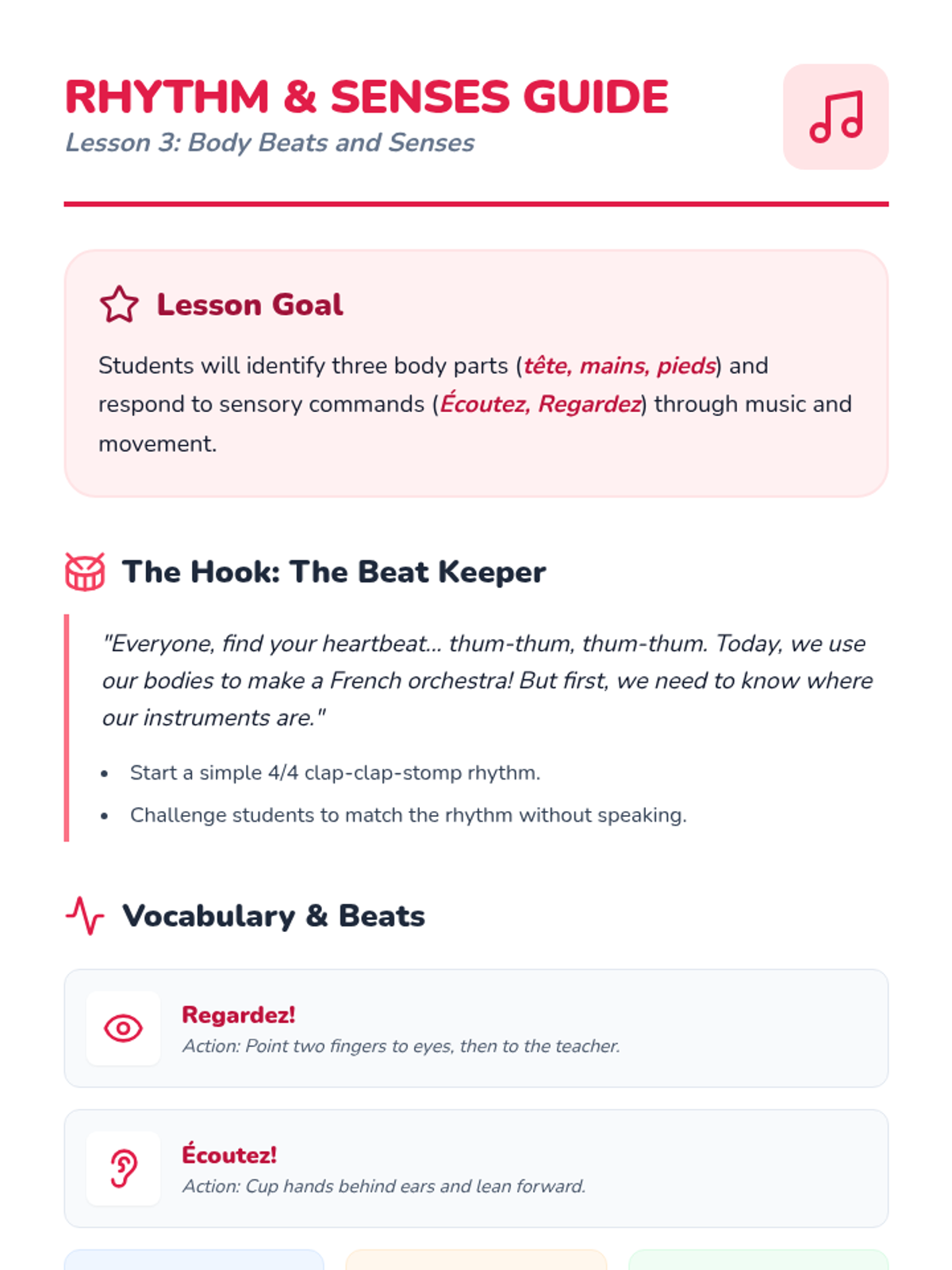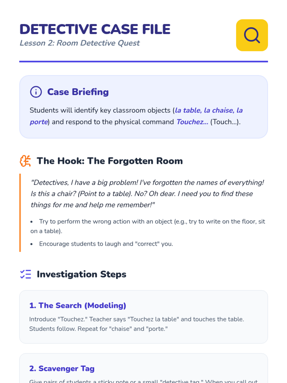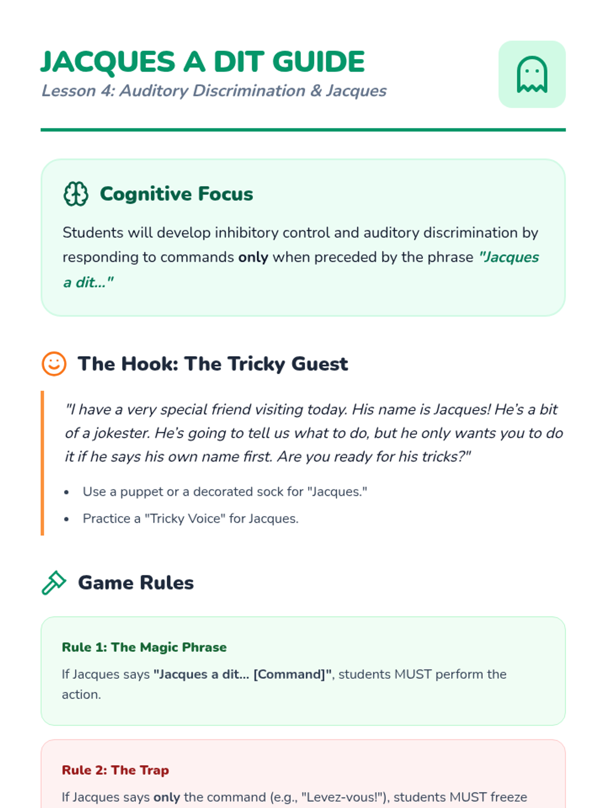 A Kindergarten French immersion unit using Total Physical Response (TPR) to teach classroom commands and routines through movement and play.