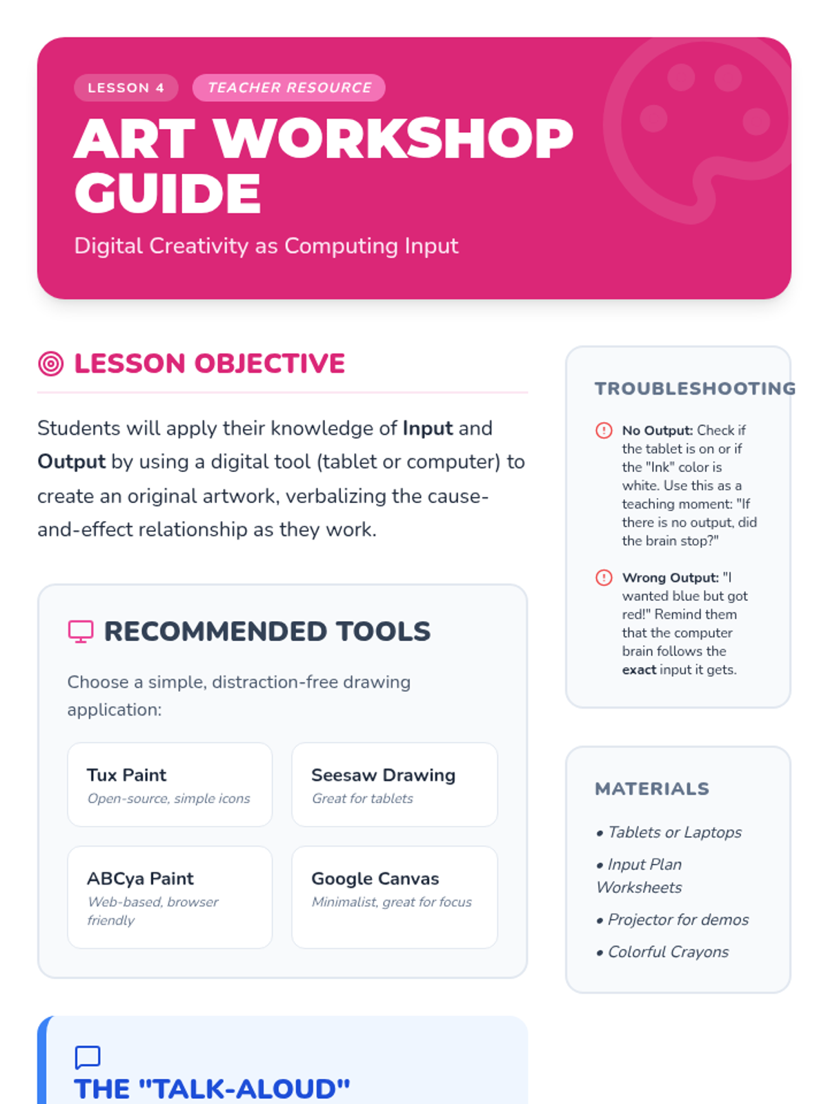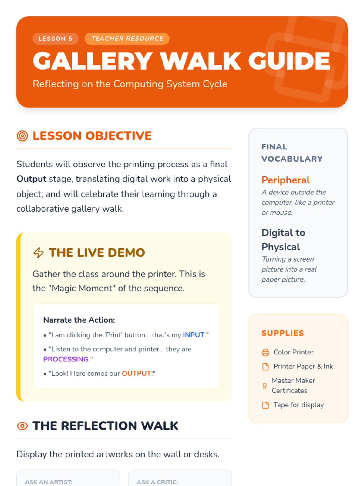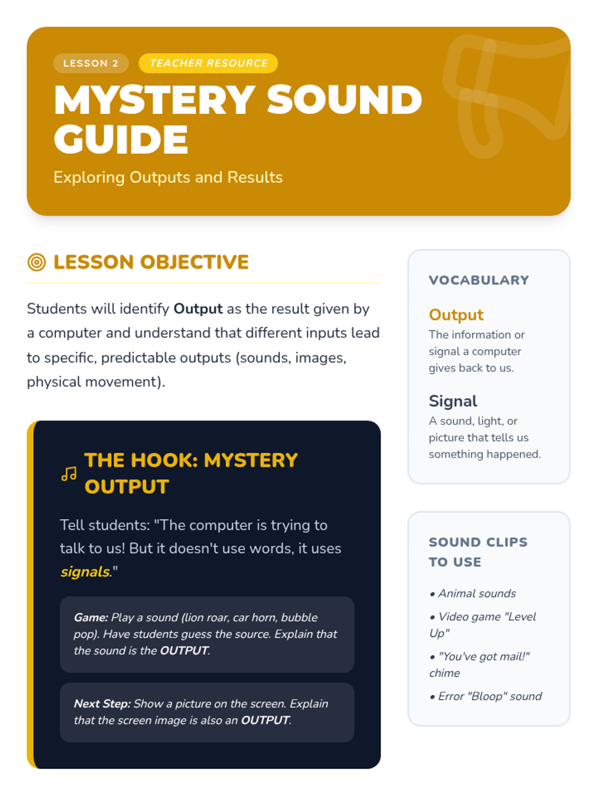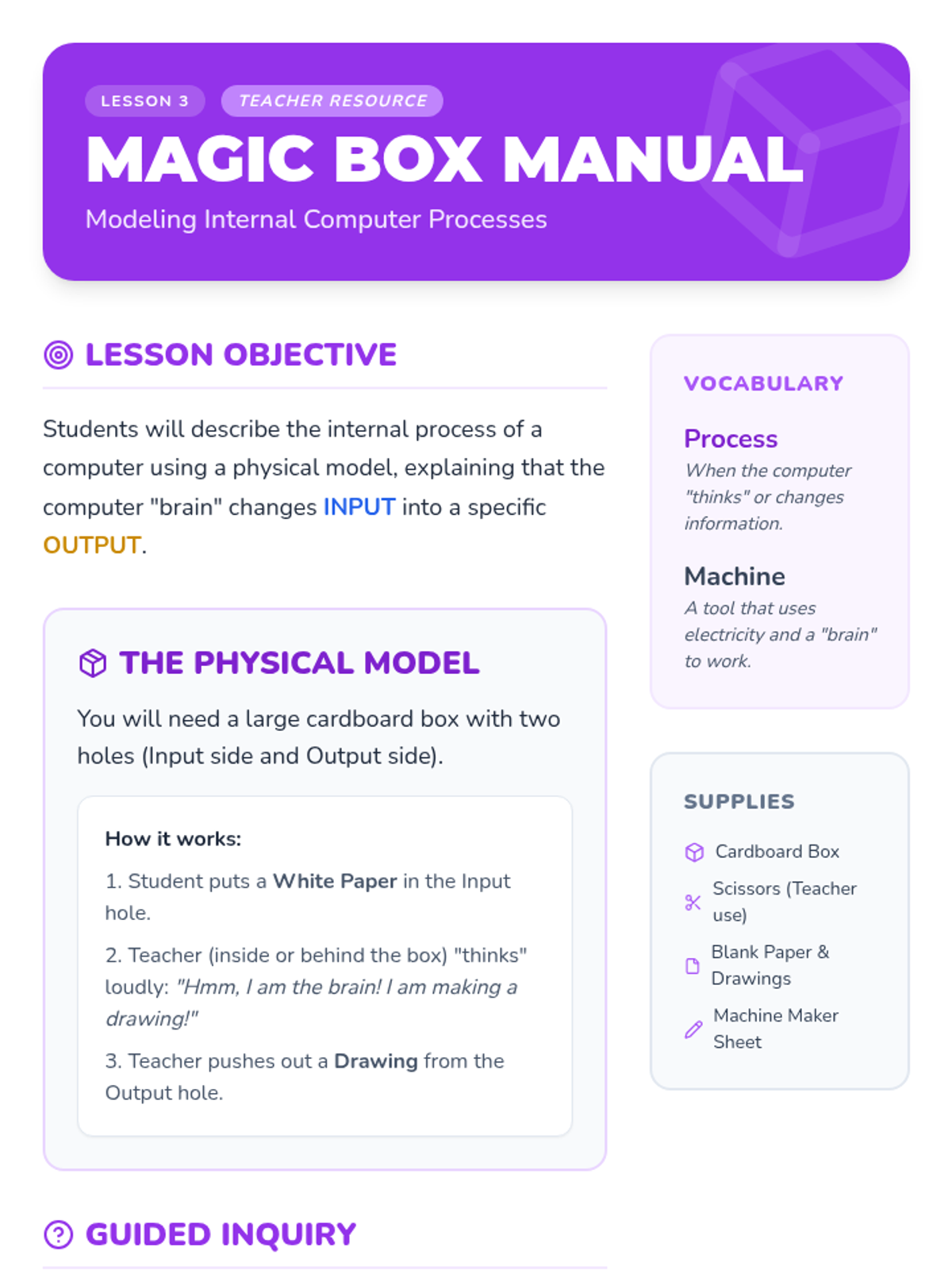 This sequence introduces Kindergarten students to the physical components of computers and tablets through tactile exploration and observation. Students learn to identify hardware parts and practice responsible equipment handling through the 'Tech Detectives' theme.
