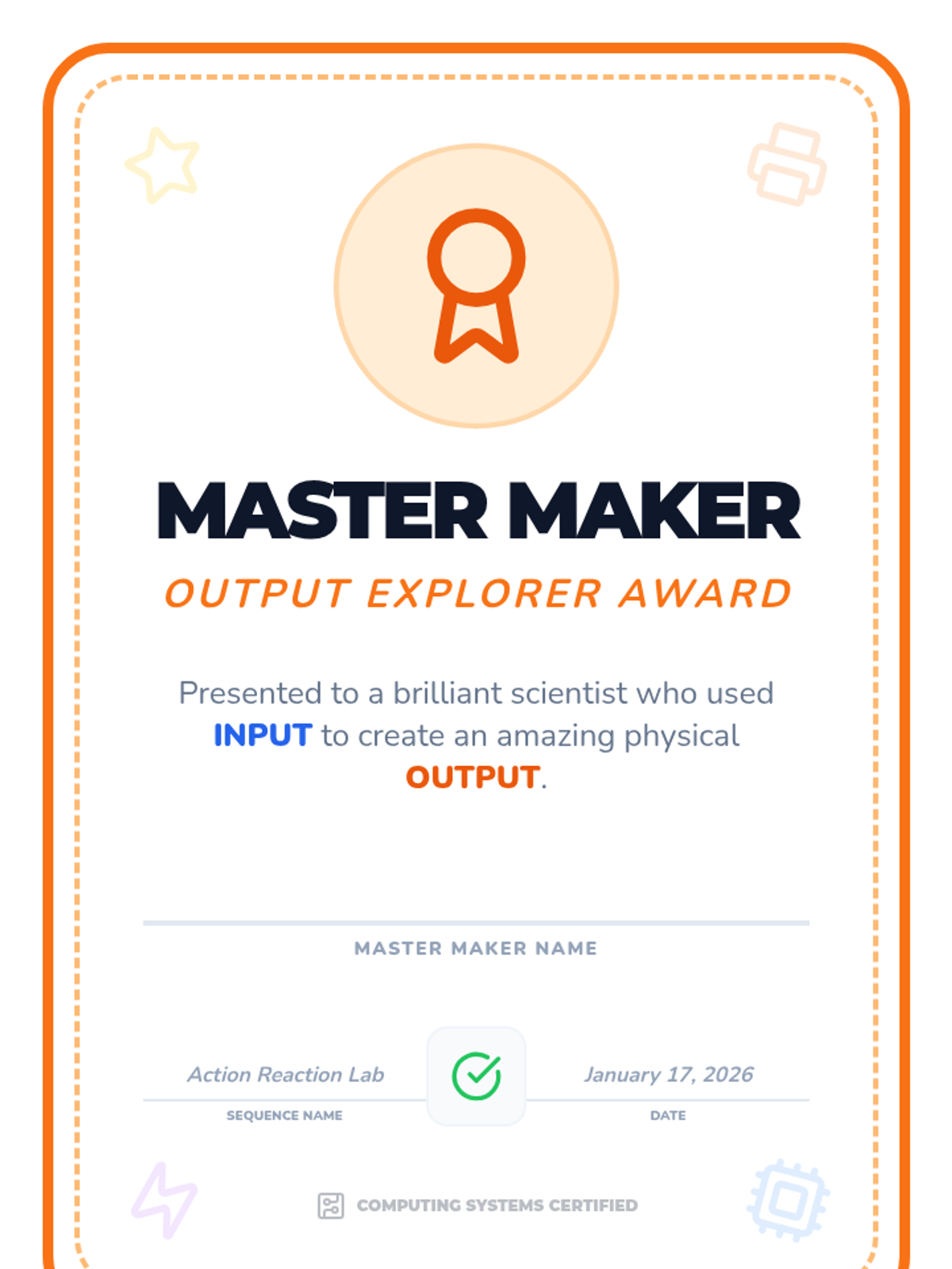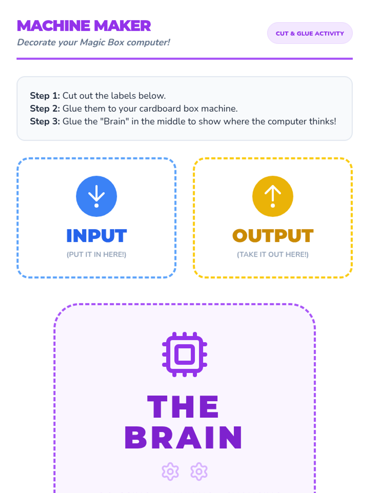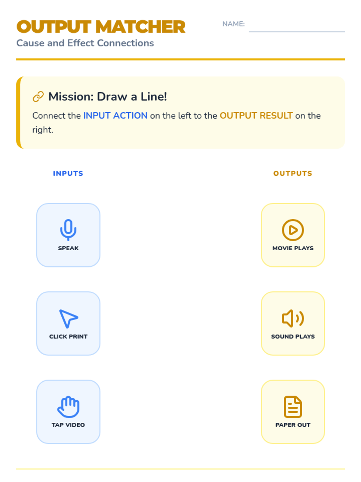 A Kindergarten sequence exploring the cause-and-effect relationship between digital inputs (actions) and outputs (results) through hands-on play, art, and physical modeling.